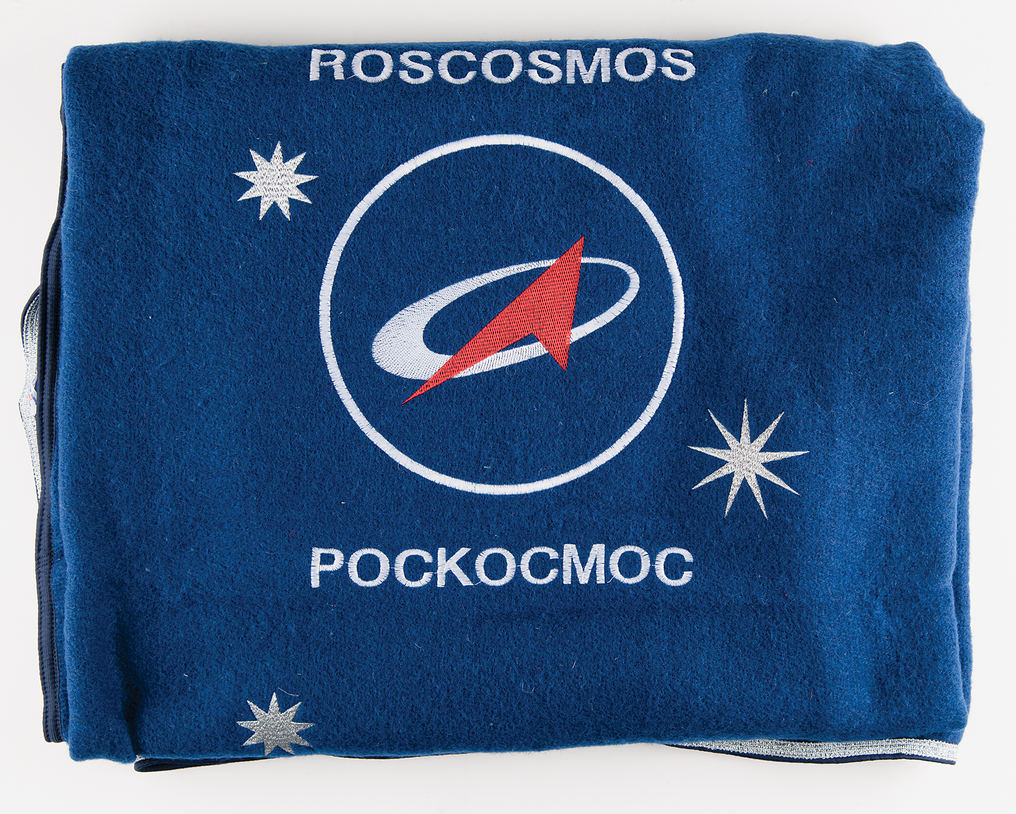Original large blue Soyuz crew recovery blanket embroidered with the Roscosmos logo, crafted from a special bled of camel's wool (65%) and sheep's wool (35%), as used at landing sites to warm up crew members upon their recovery from Soyuz capsules. In fine condition. Accompanied by a color photo of this type of blanket being used after the recovery of Soyuz TMA-13M in 2014.