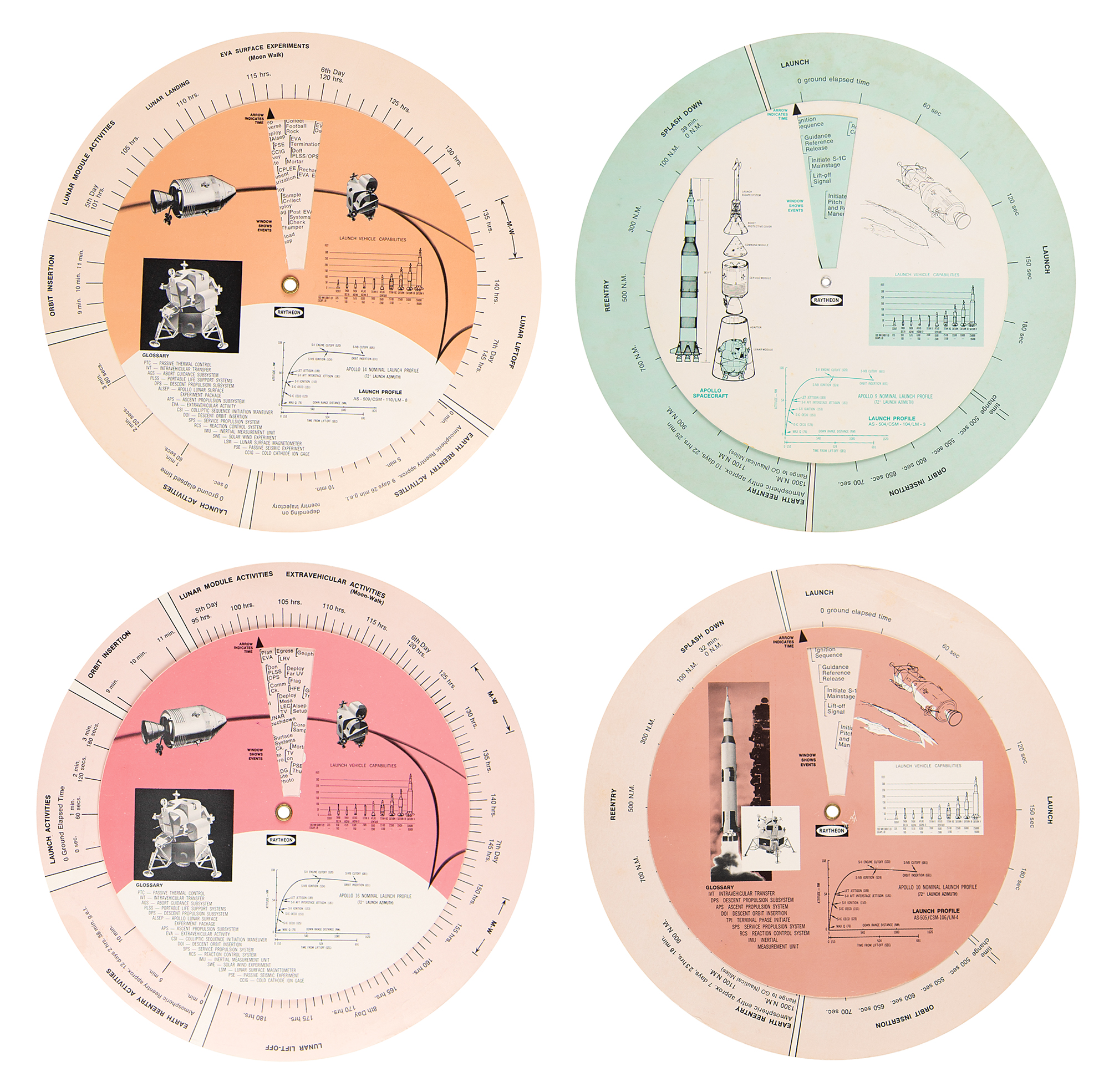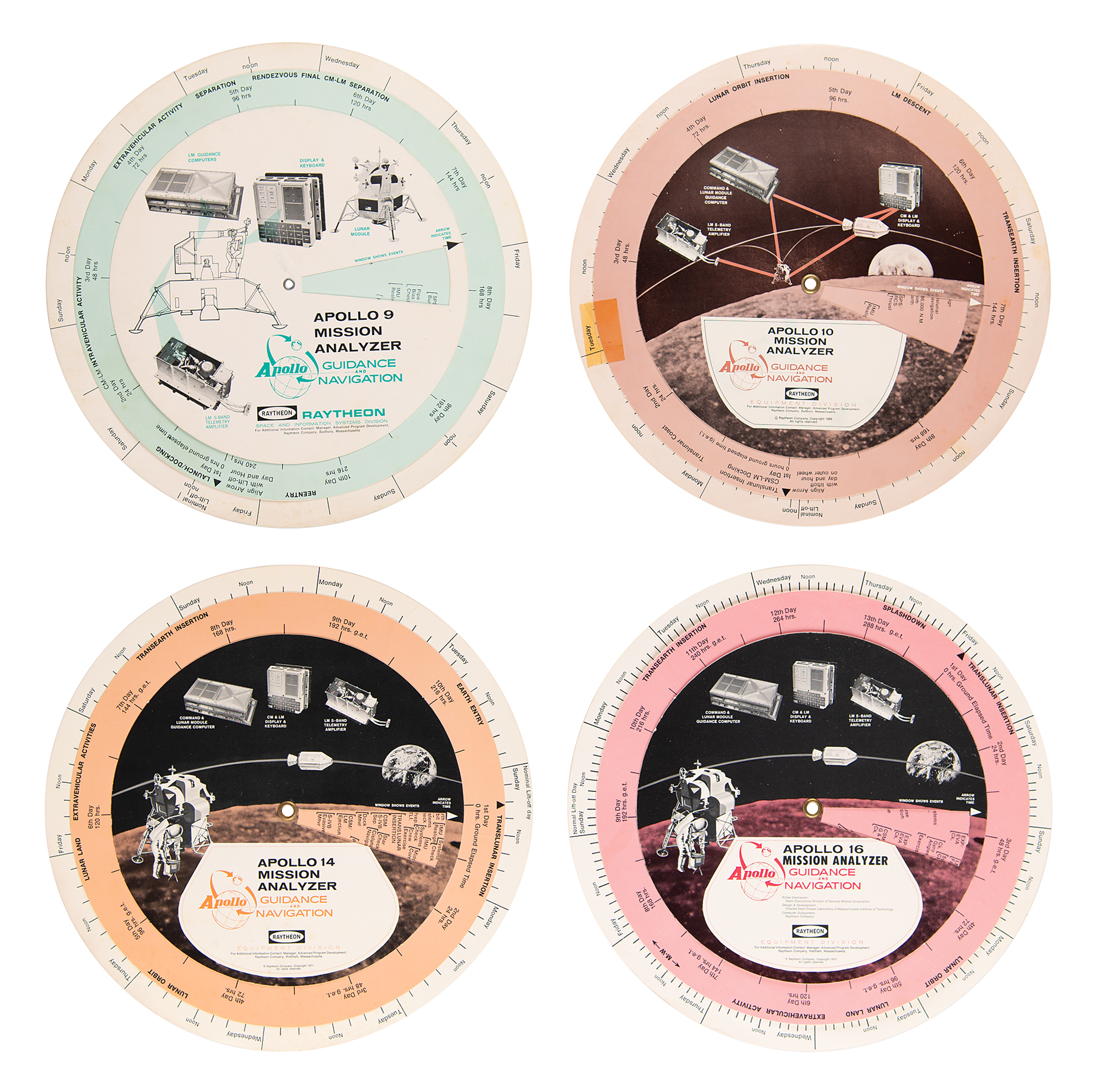 Appealing set of four double-sided circular cardstock Apollo “Mission Analyzer" rotating charts for Apollo missions 9, 10, 14, and 16, respectively made by Raytheon in 1969, 1971, and 1972, each measure 9.5″ in diameter and provide a guide for the mission's timeline and activities. In overall fine condition, with light scattered toning and creases, and the Apollo 10 analyzer bearing a toned swatch of tape.