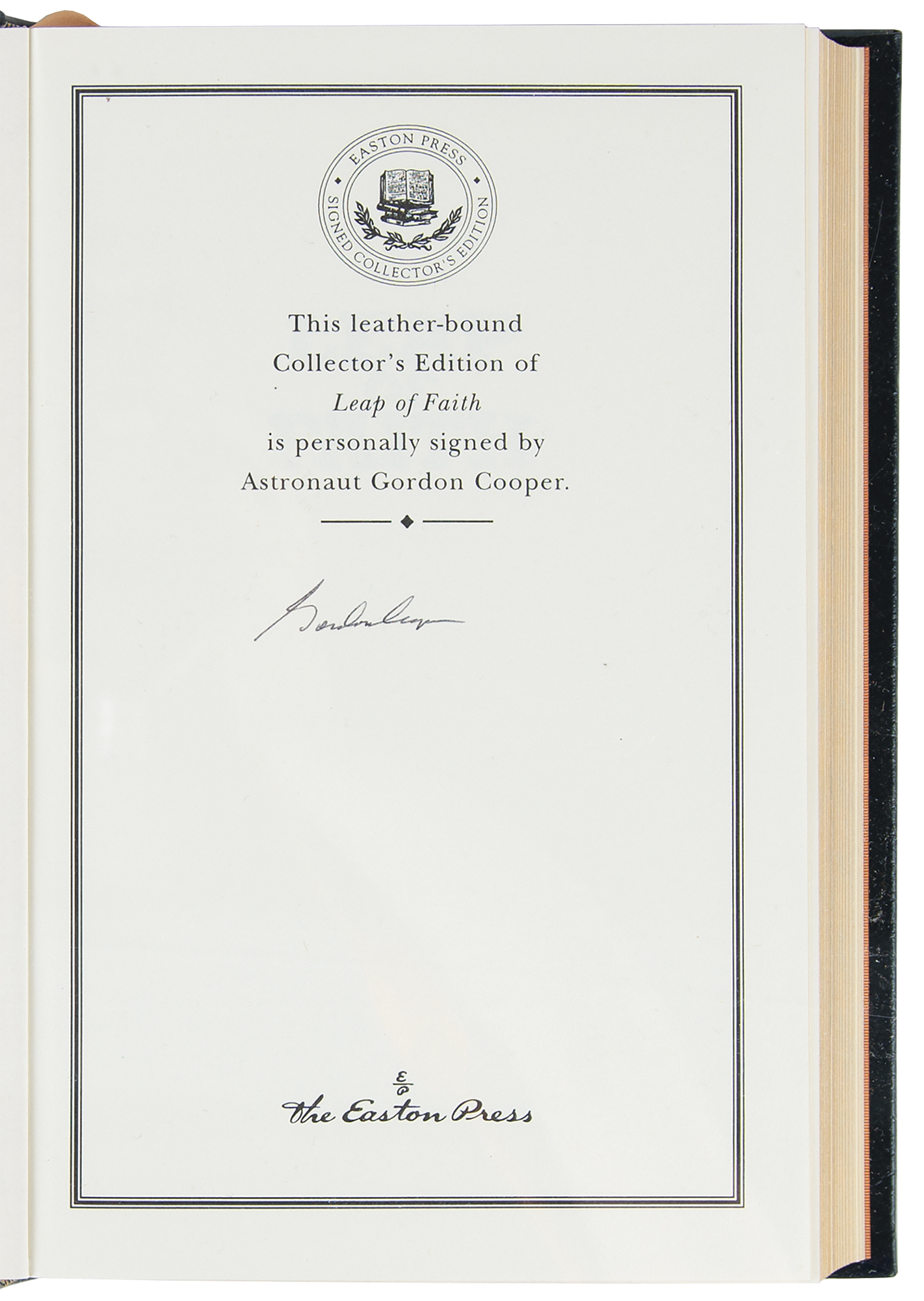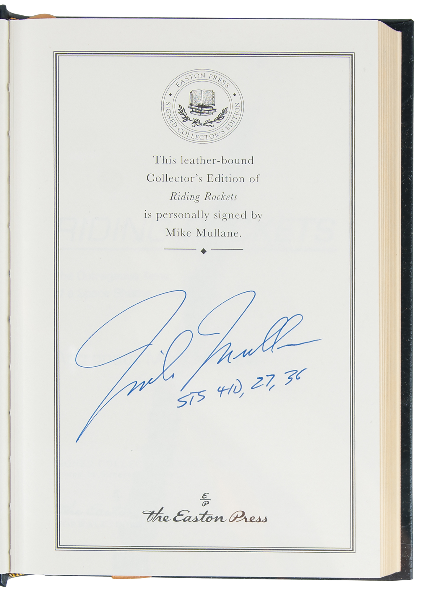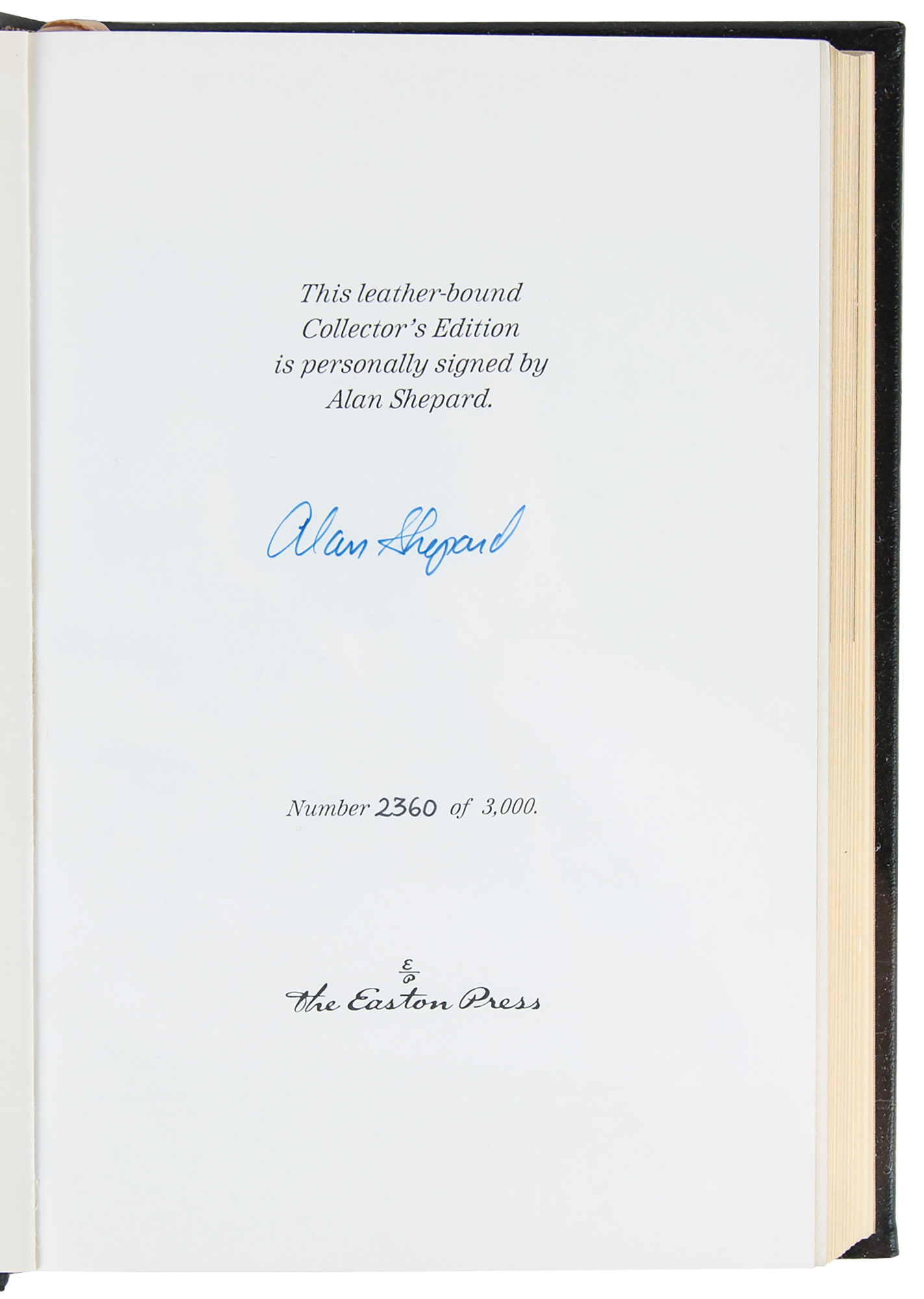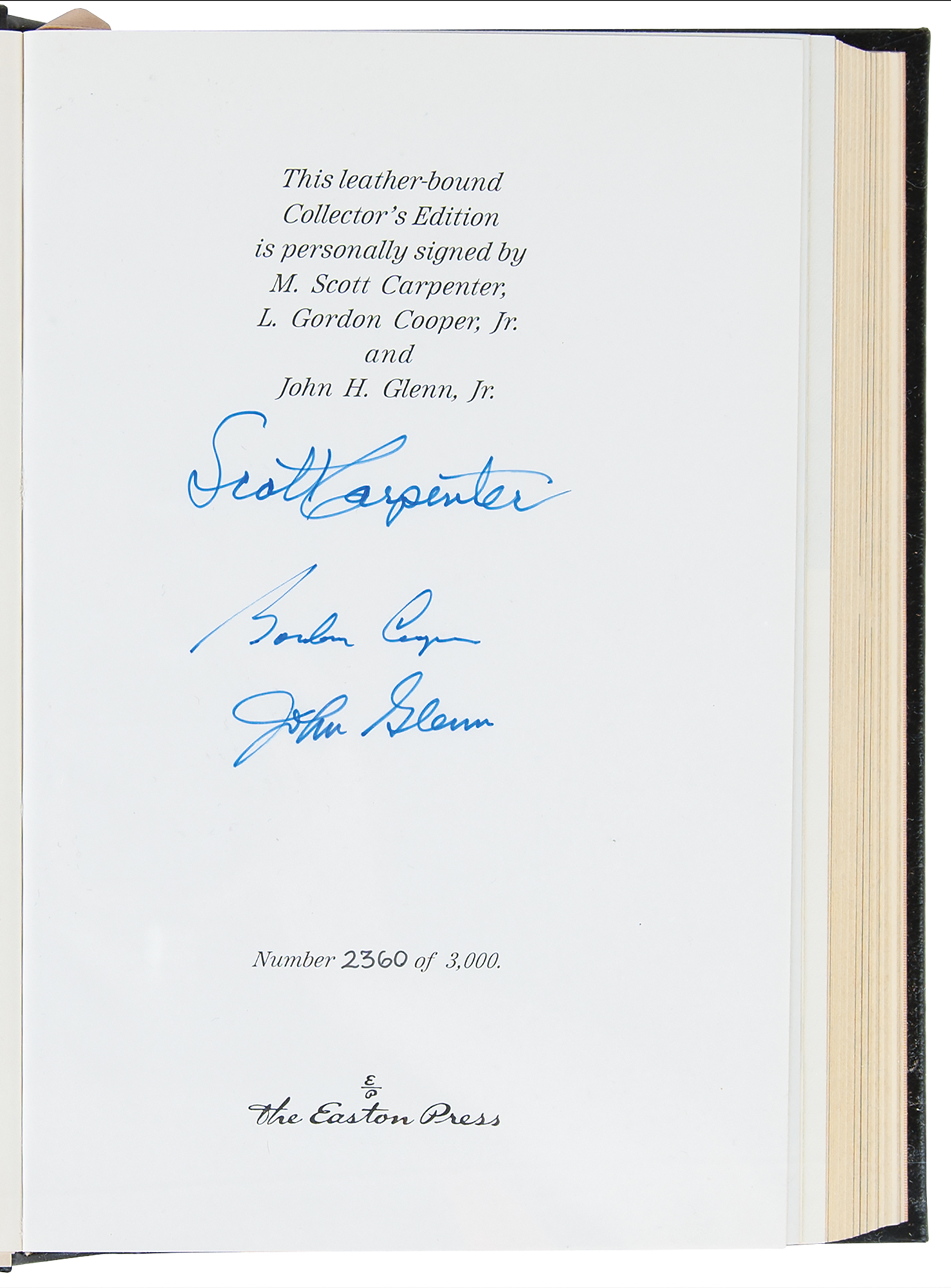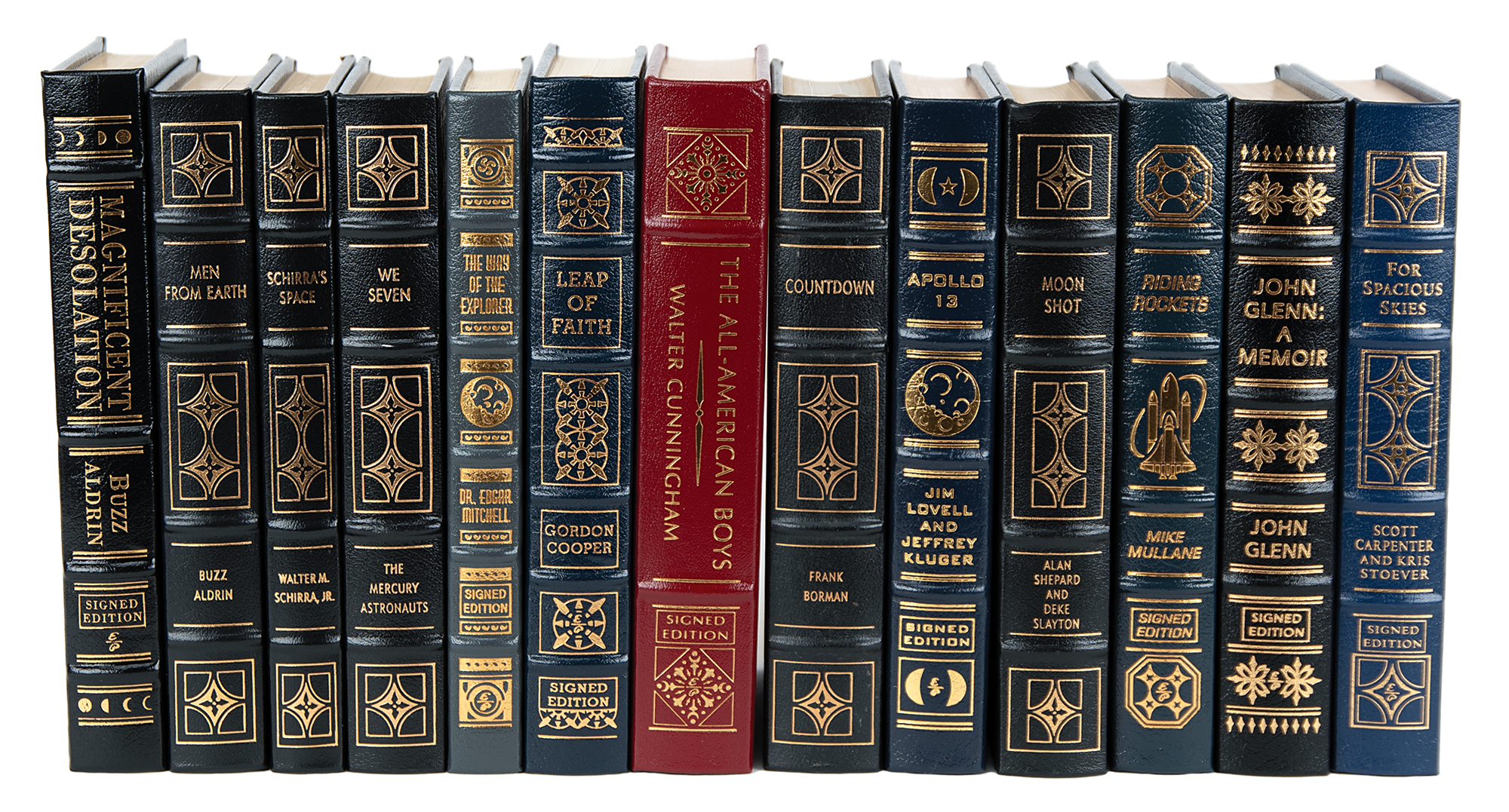 Collection of 13 limited or collector’s edition books published by Easton Press, each leather-bound hardcover, individually signed in ink or felt tip on the colophon by one or more legendary NASA astronauts: Scott Carpenter, Gordon Cooper, and John Glenn (We Seven; No. 2360 of 3000); Buzz Aldrin (2: Magnificent Desolation and Men From Earth, the latter No. 567 of 3000); Frank Borman (Countdown, No. 2447 of 3000); Scott Carpenter (For Spacious Skies); Gordon Cooper (Leap of Faith); Walt Cunningham (The All-American Boys); John Glenn (John Glenn: A Memoir); James Lovell (Apollo 13); Edgar Mitchell (The Way of the Explorer); Mike Mullane (Riding Rockets); Wally Schirra (Schirra's Space, No. 2360 of 3000); and Alan Shepard (Moon Shot, No. 2360 of 3000). A handful of books bear an ownership blindstamp to an opening page. In overall fine condition.