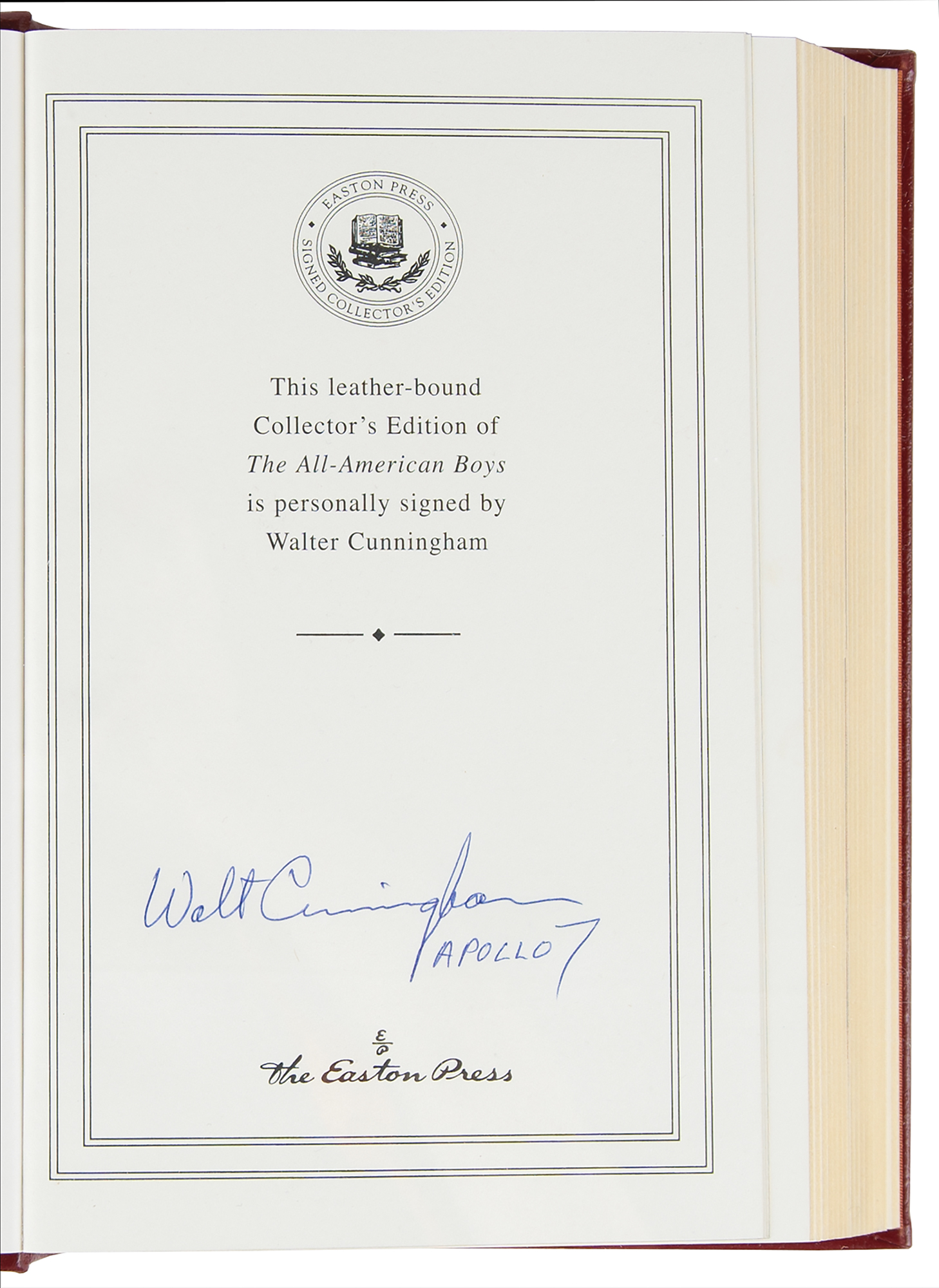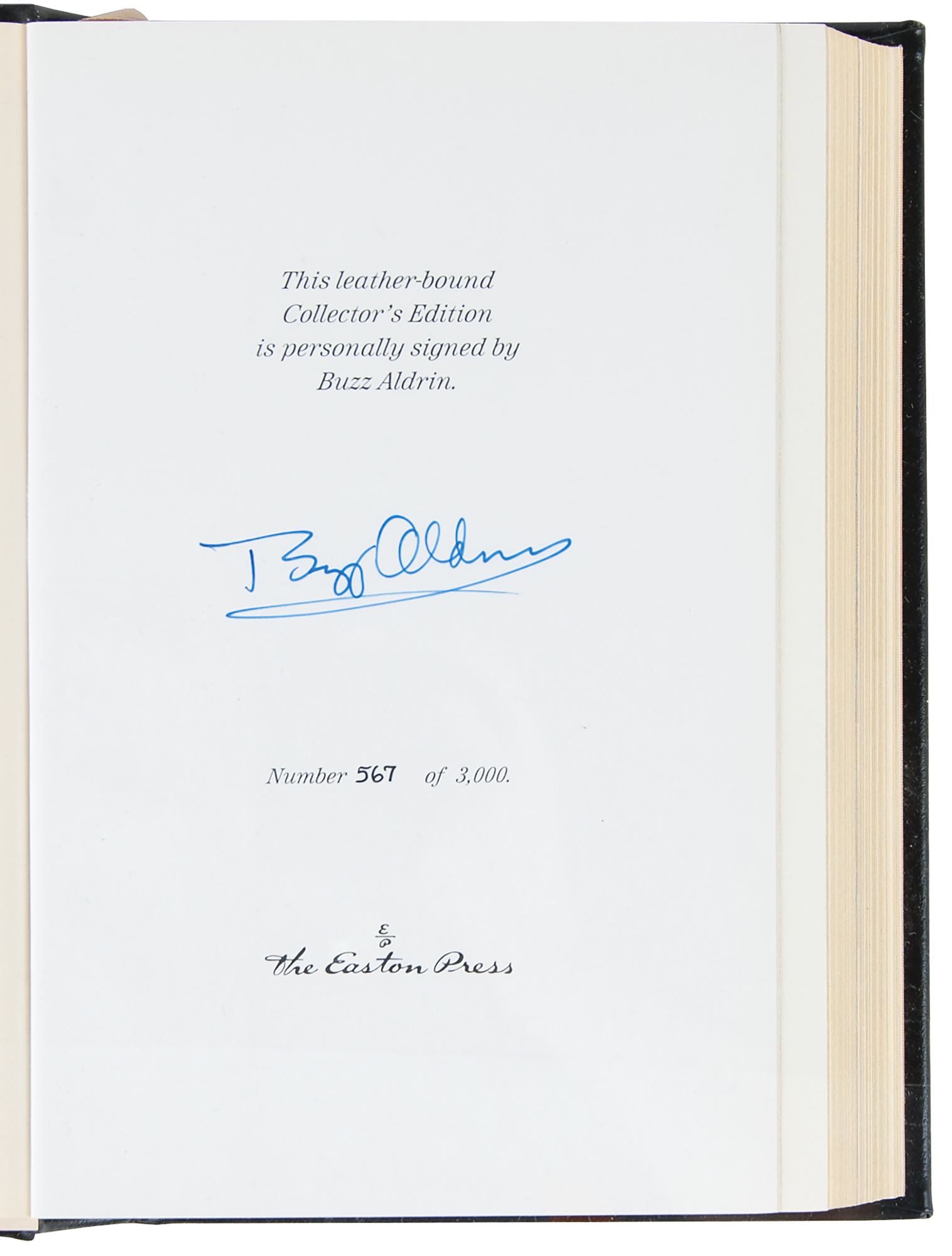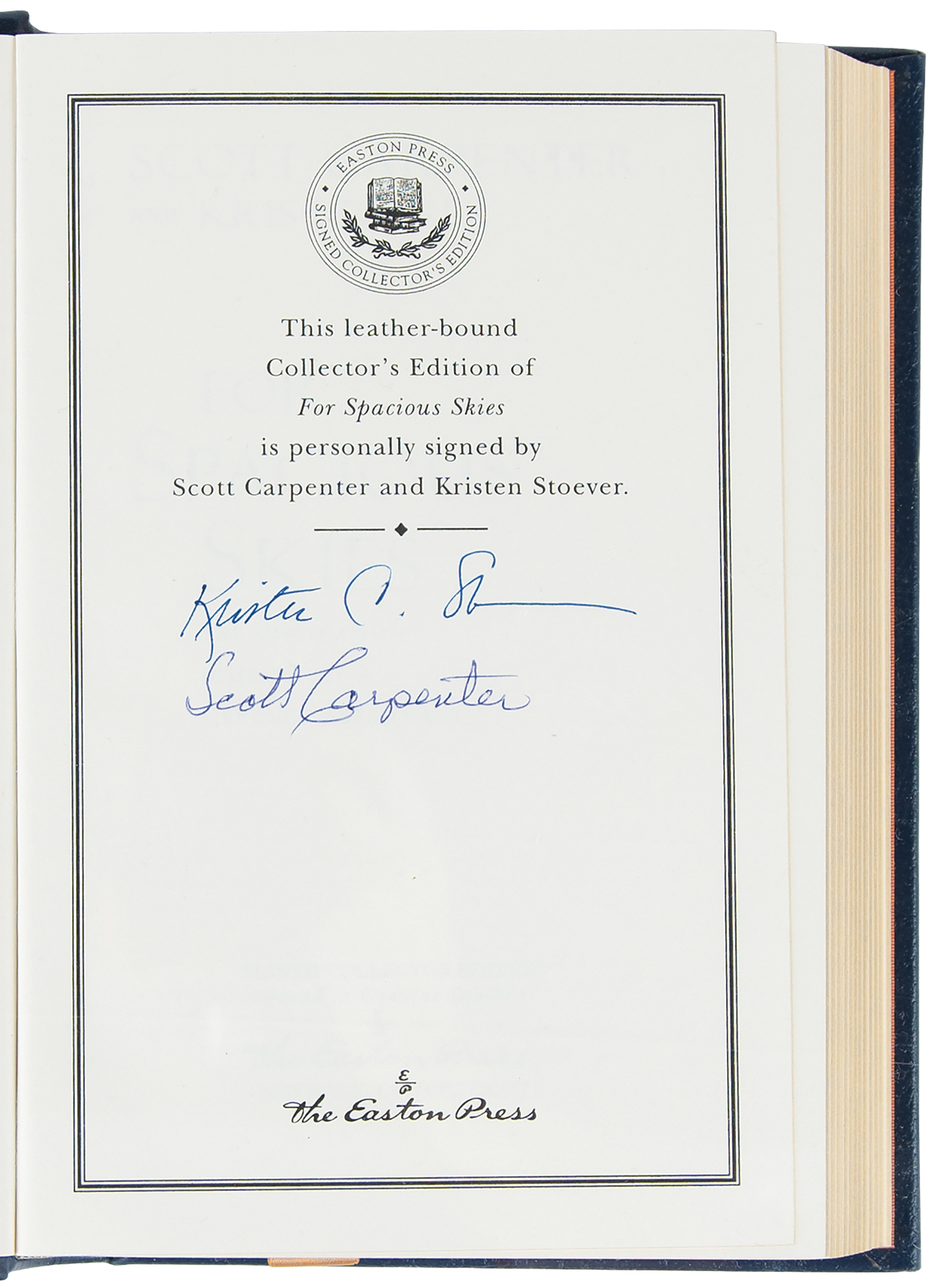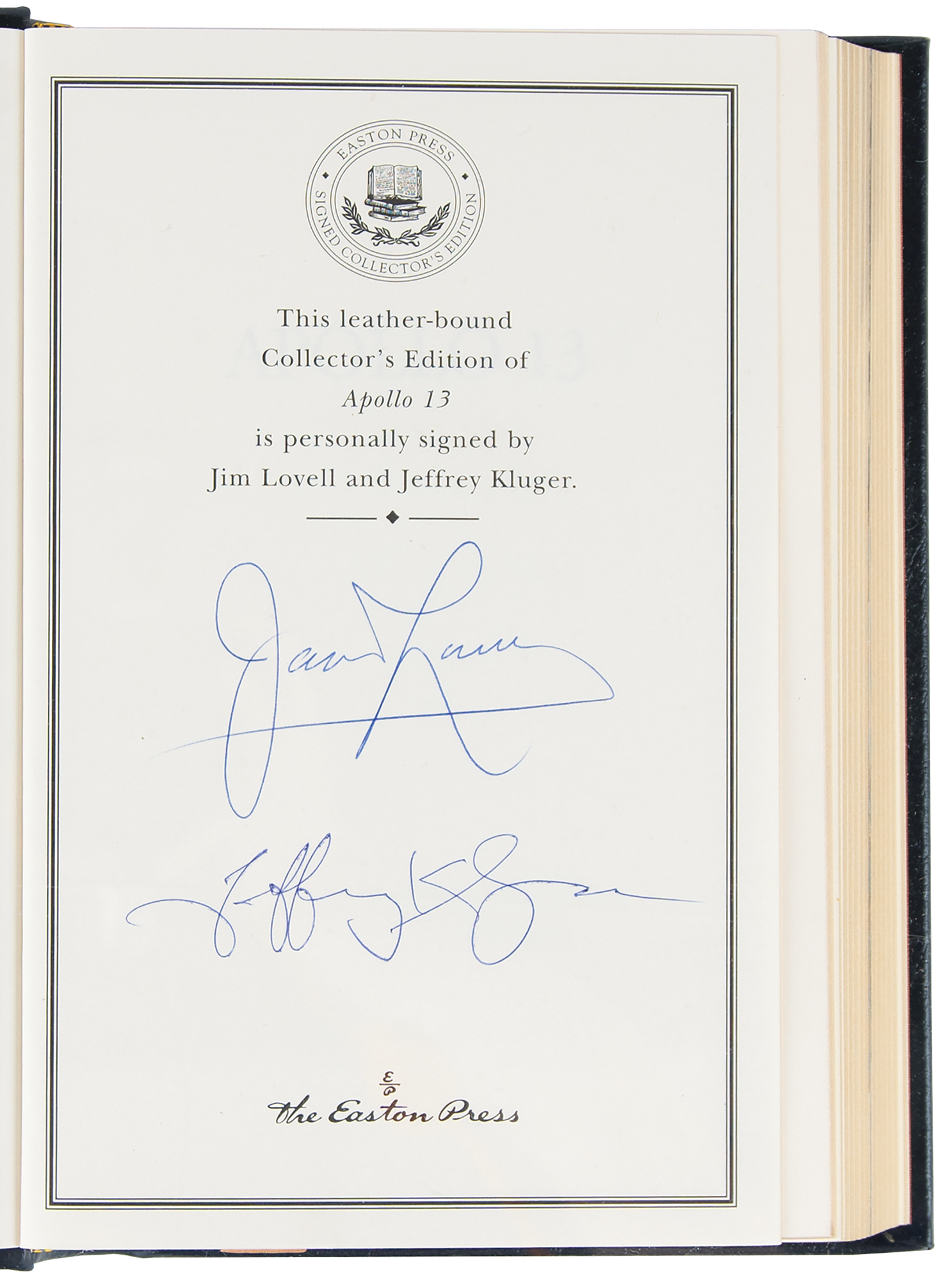 Collection of 13 limited or collector’s edition books published by Easton Press, each leather-bound hardcover, individually signed in ink or felt tip on the colophon by one or more legendary NASA astronauts: Scott Carpenter, Gordon Cooper, and John Glenn (We Seven; No. 2360 of 3000); Buzz Aldrin (2: Magnificent Desolation and Men From Earth, the latter No. 567 of 3000); Frank Borman (Countdown, No. 2447 of 3000); Scott Carpenter (For Spacious Skies); Gordon Cooper (Leap of Faith); Walt Cunningham (The All-American Boys); John Glenn (John Glenn: A Memoir); James Lovell (Apollo 13); Edgar Mitchell (The Way of the Explorer); Mike Mullane (Riding Rockets); Wally Schirra (Schirra's Space, No. 2360 of 3000); and Alan Shepard (Moon Shot, No. 2360 of 3000). A handful of books bear an ownership blindstamp to an opening page. In overall fine condition.