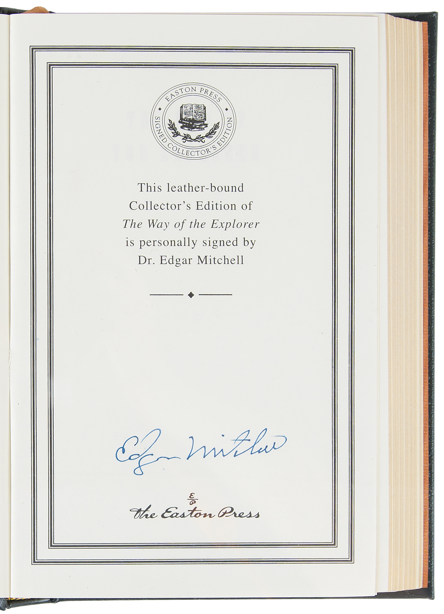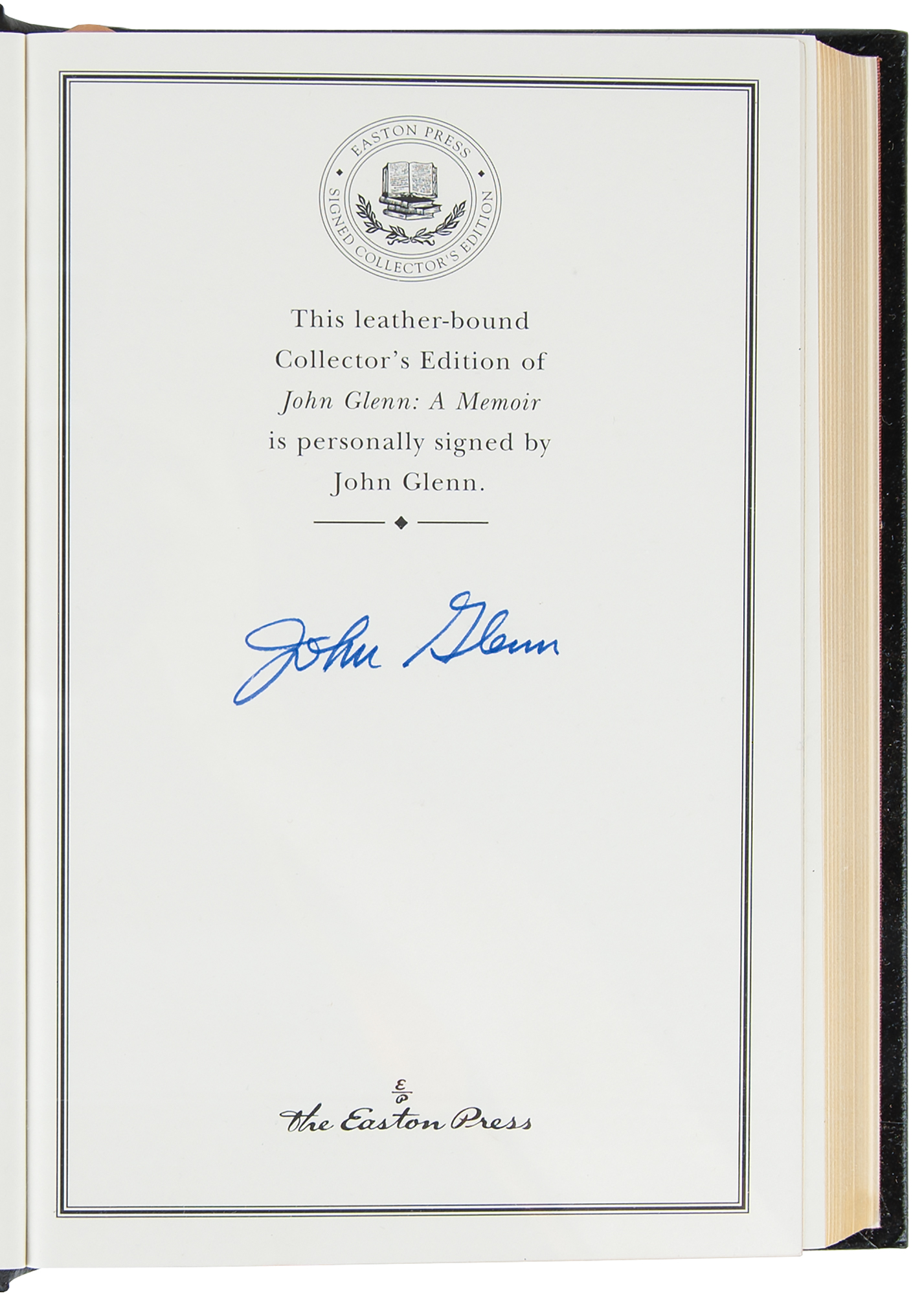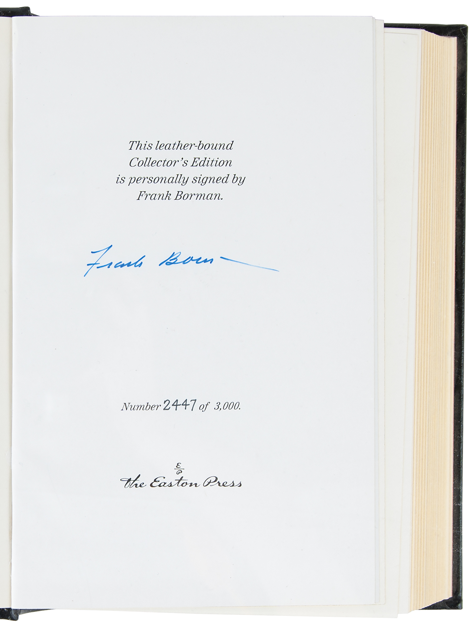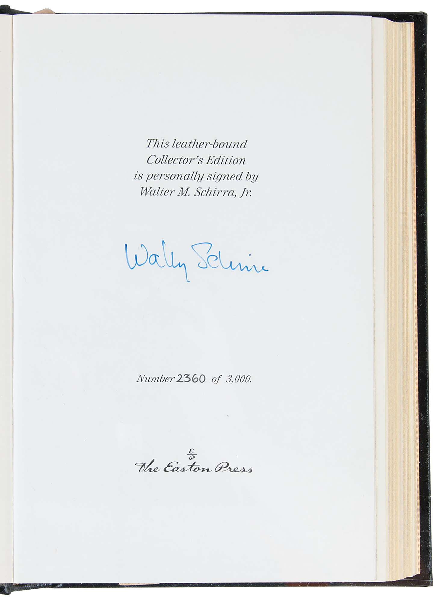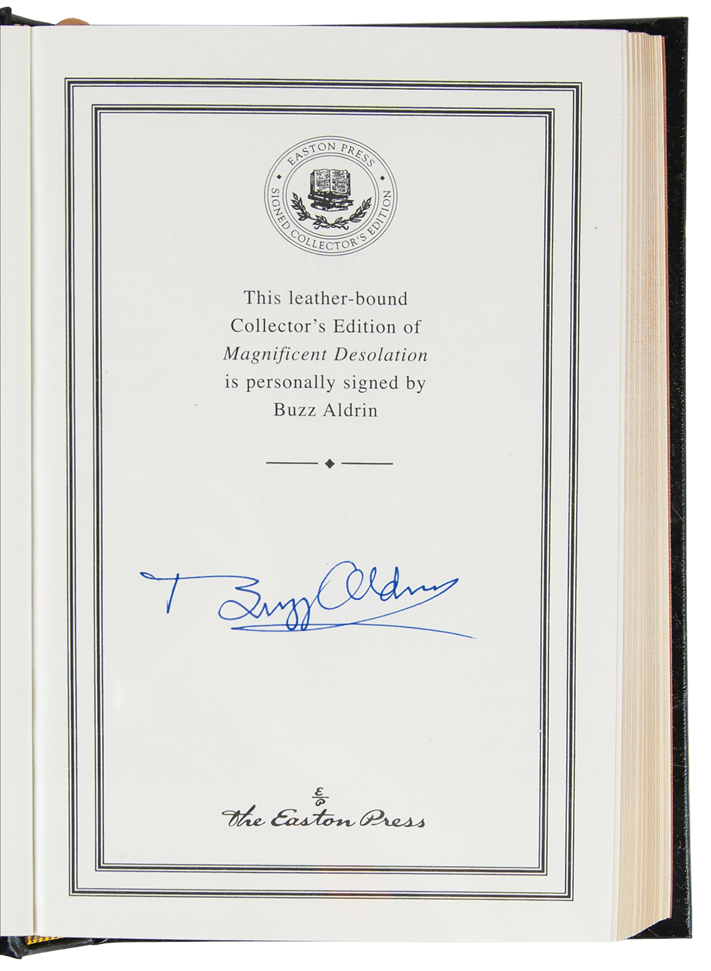 Collection of 13 limited or collector’s edition books published by Easton Press, each leather-bound hardcover, individually signed in ink or felt tip on the colophon by one or more legendary NASA astronauts: Scott Carpenter, Gordon Cooper, and John Glenn (We Seven; No. 2360 of 3000); Buzz Aldrin (2: Magnificent Desolation and Men From Earth, the latter No. 567 of 3000); Frank Borman (Countdown, No. 2447 of 3000); Scott Carpenter (For Spacious Skies); Gordon Cooper (Leap of Faith); Walt Cunningham (The All-American Boys); John Glenn (John Glenn: A Memoir); James Lovell (Apollo 13); Edgar Mitchell (The Way of the Explorer); Mike Mullane (Riding Rockets); Wally Schirra (Schirra's Space, No. 2360 of 3000); and Alan Shepard (Moon Shot, No. 2360 of 3000). A handful of books bear an ownership blindstamp to an opening page. In overall fine condition.