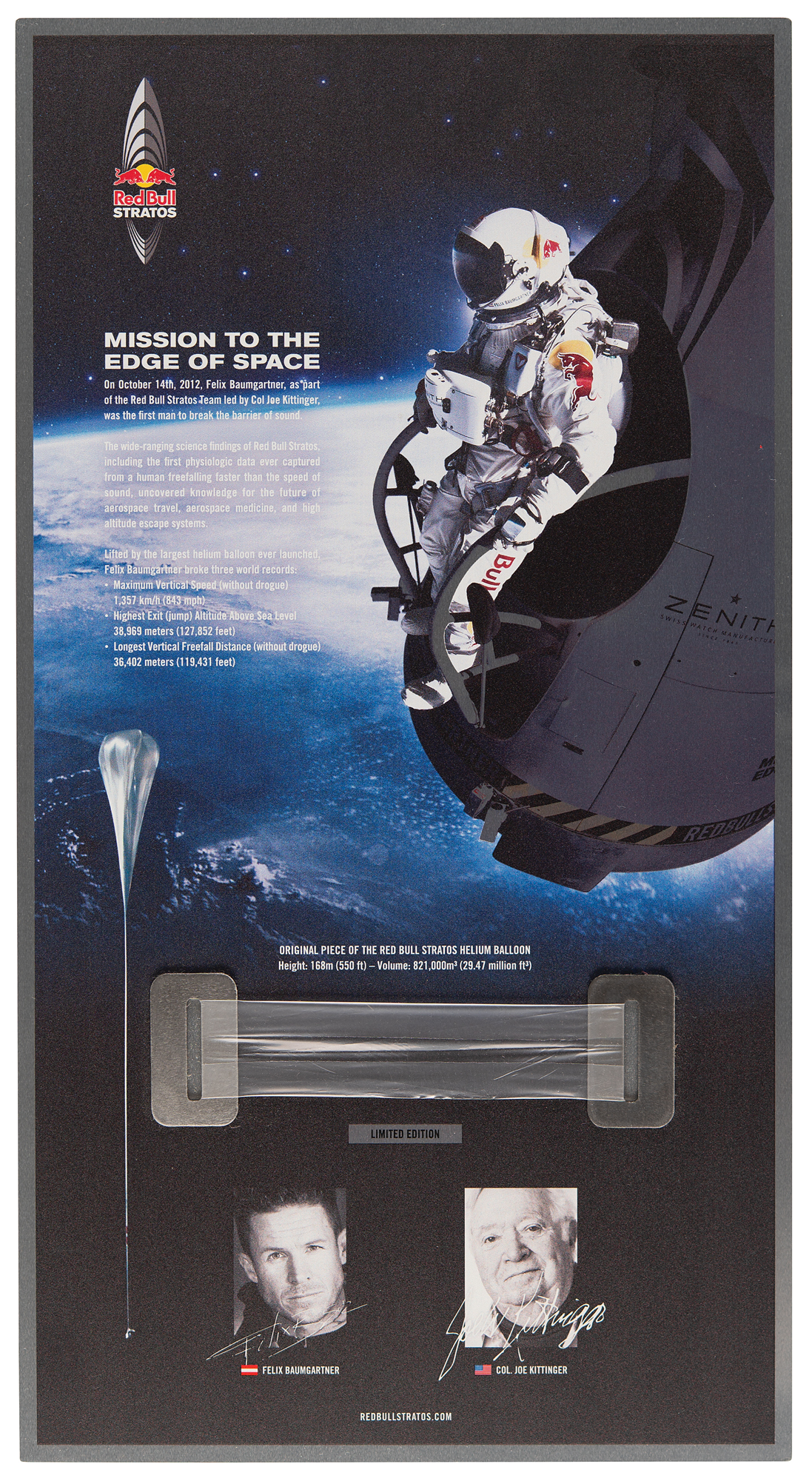Limited edition display featuring an original piece of the Red Bull Stratos Helium Balloon that carried Austrian skydiver Felix Baumgartner 24 miles up into the stratosphere for his record-setting free fall on October 14, 2012. The piece measures 4.75˝ x 1˝ and is mounted on an aluminum 8.5˝ x 15.75˝ display plaque with images and informational text on the historic feat, as well as portraits and facsimile signatures of Felix Baumgartner and Col. Joe Kittinger. In very fine condition. Accompanied by its drawstring bag.