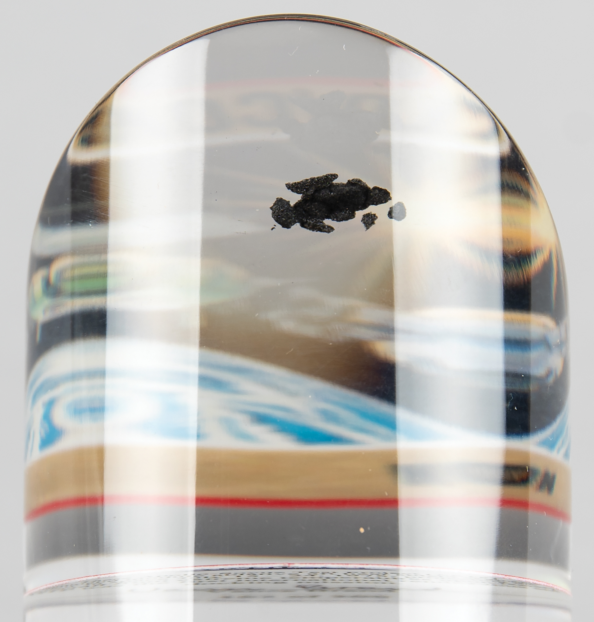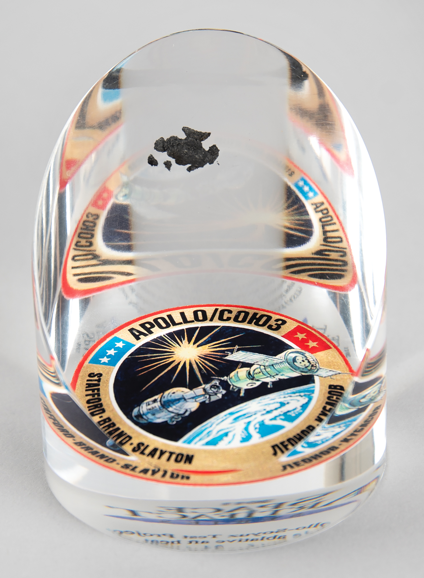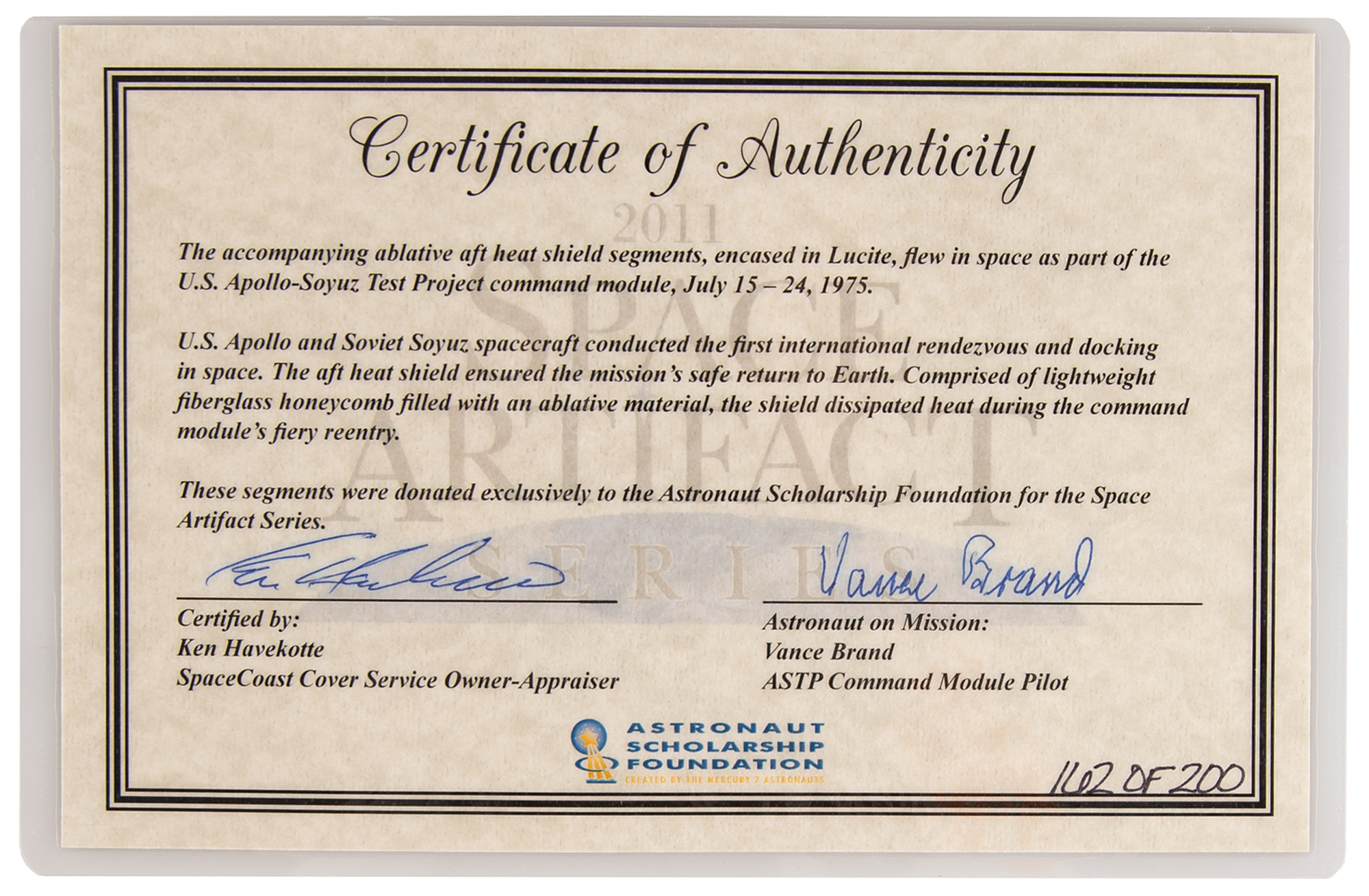Flown fragments of ablative aft heat shield from the the Apollo-Soyuz Test Project, used to dissipate heat during the Command Module's fiery reentry. Encased in a limited edition cylindrical 2.75˝ x 3.25˝ piece of Lucite cut at an angle for display purposes, numbered 162/200, with a mission insignia and a certificate of authenticity at the bottom. In fine condition. Originally distributed through the Astronaut Scholarship Foundation and accompanied by a laminated certificate of authenticity signed in blue ballpoint by ASTP CMP Vance Brand.