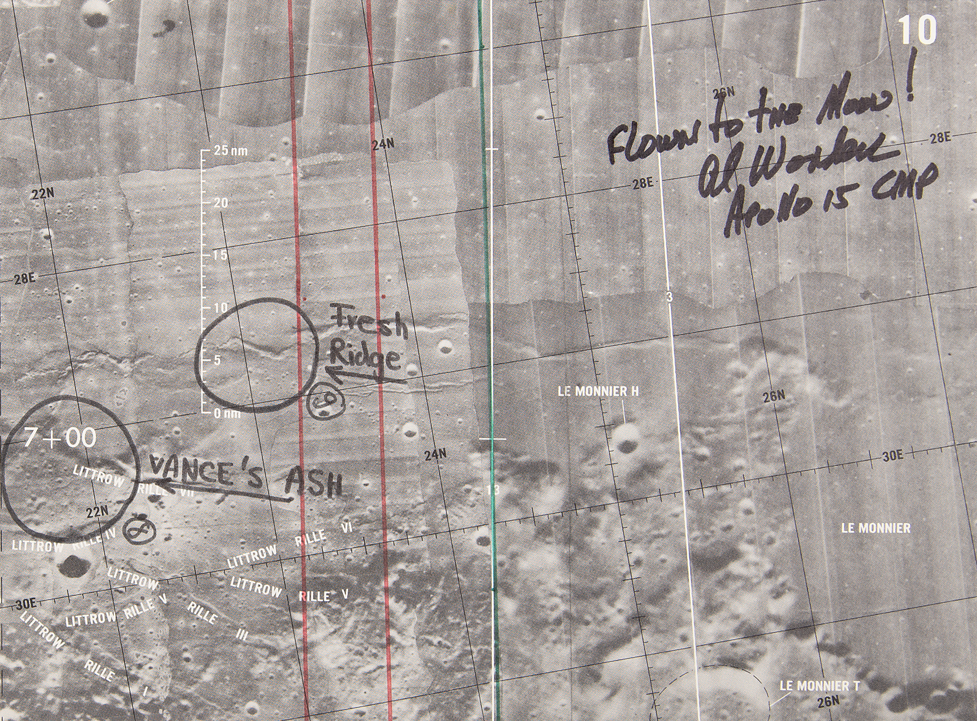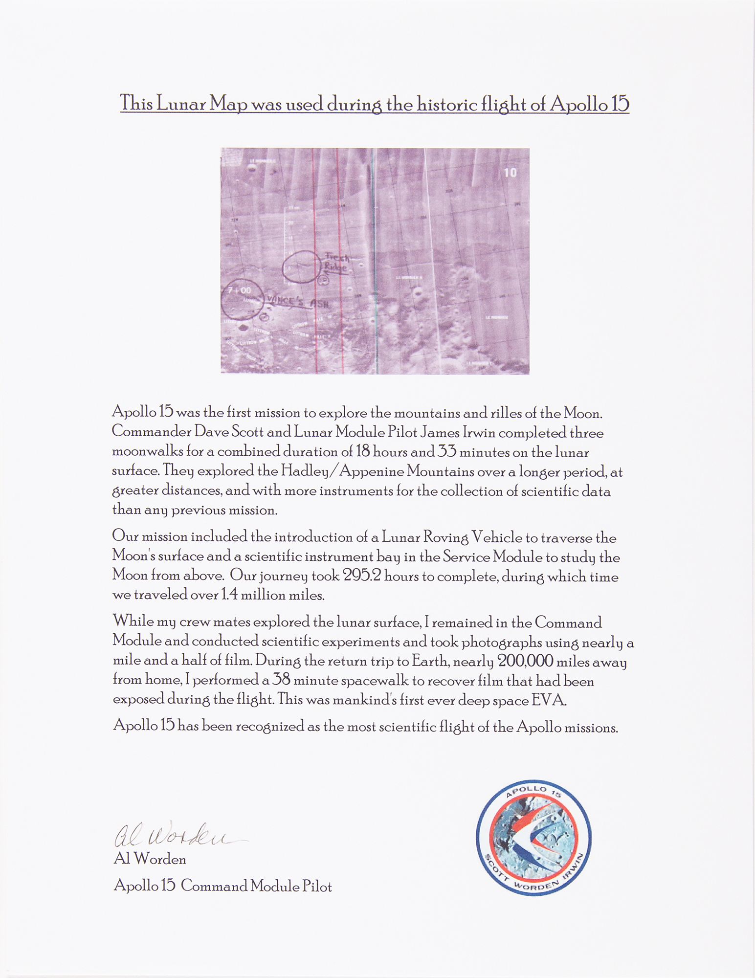 Flown single-sided lunar map plate carried on the Apollo 15 mission, 10.5 x 7.75, signed and flight-certified in black felt tip, "Flown to the Moon! Al Worden, Apollo 15 CMP." Marked as number "10," the map identifies Le Monnier and its satellite craters, as well as the Littrow rilles, with "Fresh Ridge" and "Vance's Ash" locations circled and indicated in felt tip. In fine condition, with trimmed edges. Accompanied by a letter of provenance signed by Worden, certifying that "this Lunar Map was used during the historic flight of Apollo 15," and discussing the details and significance of the mission at length: "Apollo 15 was the first mission to explore the mountains and rilles of the Moon. Commander Dave Scott and Lunar Module Pilot James Irwin completed three moonwalks for a combined duration of 18 hours and 33 minutes on the lunar surface…Our mission included the introduction of a Lunar Roving Vehicle to traverse the Moon's surface and a scientific instrument bay in the Service Module to study the Moon from above. Our journey took 295.2 hours to complete, during which time we traveled over 1.4 million miles. While my crew mates explored the lunar surface, I remained in the Command Module and conducted scientific experiments and took photographs using nearly a mile and a half of film. During the return trip to Earth, nearly 200,000 miles away from home, I performed a 38 minute spacewalk to recover film that had been exposed during the flight. This was mankind's first ever deep space EVA."