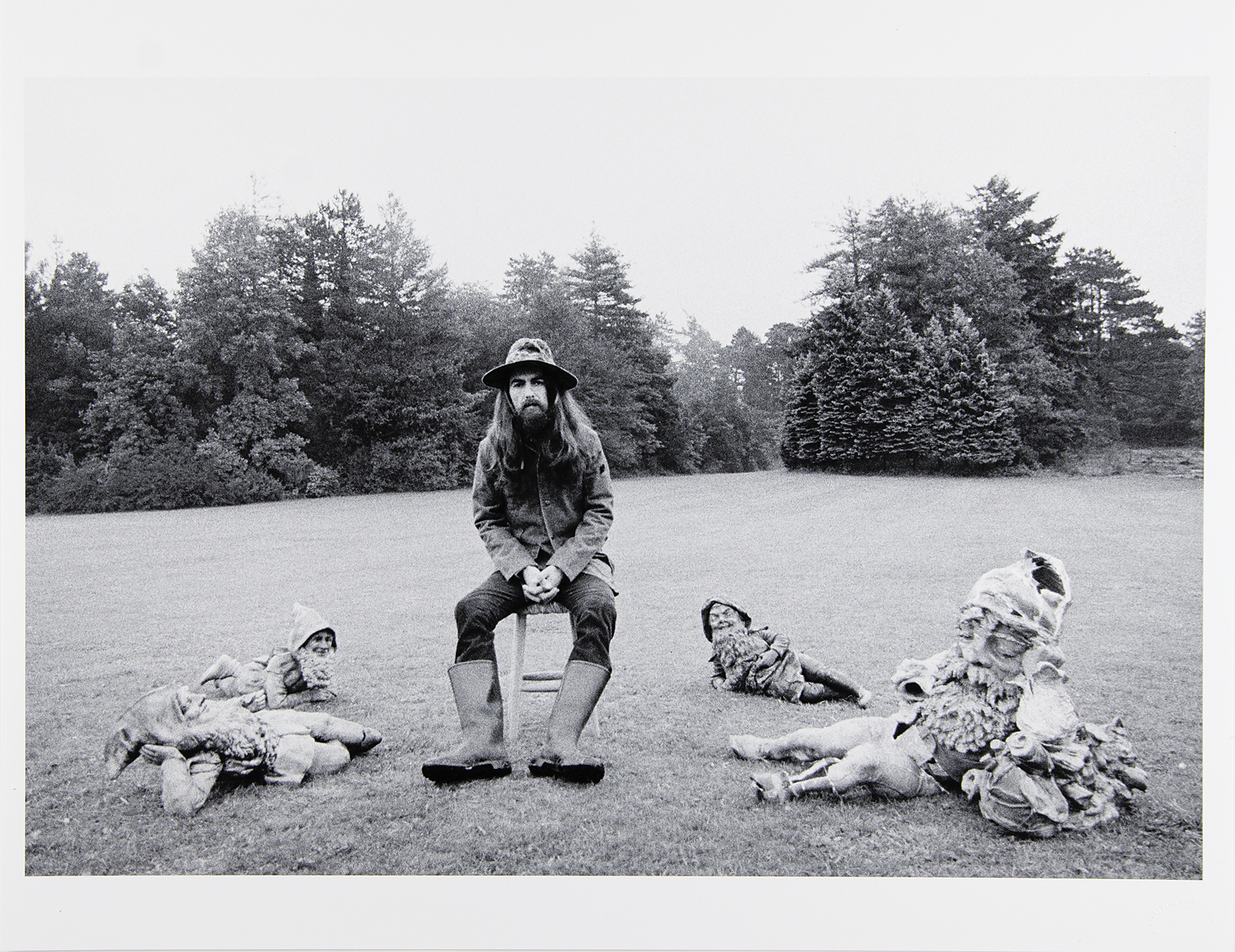 From the personal collection of legendary rock photographer Barry Feinstein—a limited edition semi-glossy 22 x 17 silver gelatin outtake photograph from the photo session for George Harrison's iconic 1970 triple album All Things Must Pass, showing the former Beatles guitarist sitting amidst garden gnomes at his Friar Park estate. Nearly identical to the artwork used for the album, this image portrays Harrison looking directly into the camera, rather than slightly to the side. The piece has a "Barry Feinstein Photography" blindstamp in the lower right corner and a Barry Feinstein copyright stamp on the reverse, and is annotated on the reverse in pencil: "George Harrison, 'All Things Must Pass,' Friar Park, 1970, 7/24." In very fine condition. Accompanied by a certificate of authenticity from Barry Feinstein Photography.