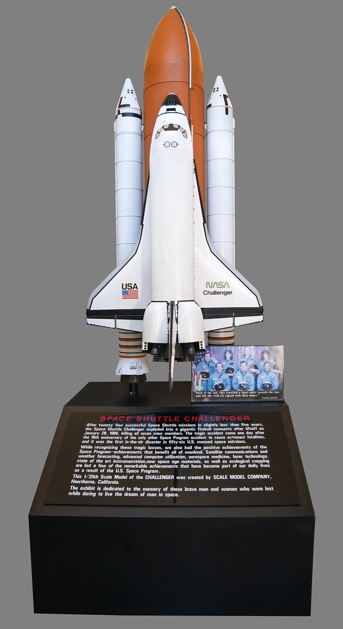 The plaque reads: “After twenty four successful Space Shuttle missions in slightly less than five years, the Space Shuttle Challenger exploded into a gigantic fireball moments after liftoff on January 28, 1986, killing all seven crew members. The tragic accident came one day after the 19th anniversary of the only other Space Program accident to cause astronaut fatalities, and it was the first in-the-air disaster in fifty-six U.S. manned space missions. While recognizing these tragic losses, we also hail the positive achievements of the Space Program — achievements that benefit all of mankind. Satellite communications and weather forecasting, advanced computer utilization, aerospace medicine, laser technology, state of the art instrumentation, new space age materials, as well as ecological mapping are but a few of the remarkable achievements that have become part of our daily lives as a result of the U.S. Space Program. This 1/25th Scale Model of the CHALLENGER was created by SCALE MODEL COMPANY, Hawthorne, California. The exhibit is dedicated to the memory of those brave men and women who were lost while daring to live the dream of man in space.”