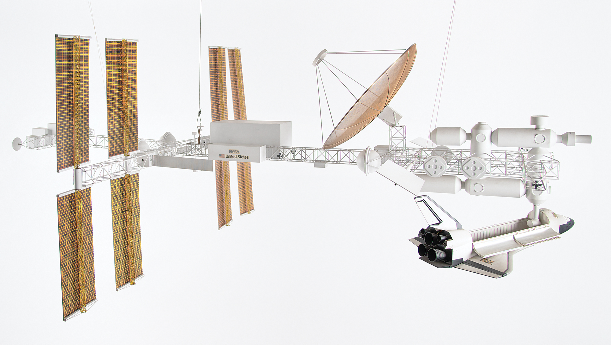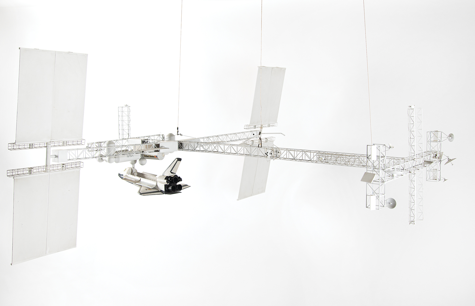 Marvelous set of five 1:100 scale conceptual International Space Station (ISS) models handmade by master craftsman and model maker Isao Hirai of Hawthorne’s Scale Model Company. These high-fidelity models offer an impressive visual history of the evolution of a world space station designed for scientific pursuits in low Earth orbit. Commissioned for companies like Boeing and Rockwell International between the 1970s and early 2000s, the set includes notional space station models for the Dual Keel, the Freedom, the Freedom Evolution, the Alpha, and the current version of the ISS. Each model is constructed of metal and composite materials, with model dimensions ranging in size from 43˝ x 30˝ x 17˝ (Alpha) to 63˝ x 48˝ x 17˝ (Dual Keel). In overall fine condition, with Freedom missing one solar array and a seam to its central boom junction in need of restoration. An awe-inspiring quintet of artisanal concept models that visually document the multi-decade design evolution of the International Space Station.