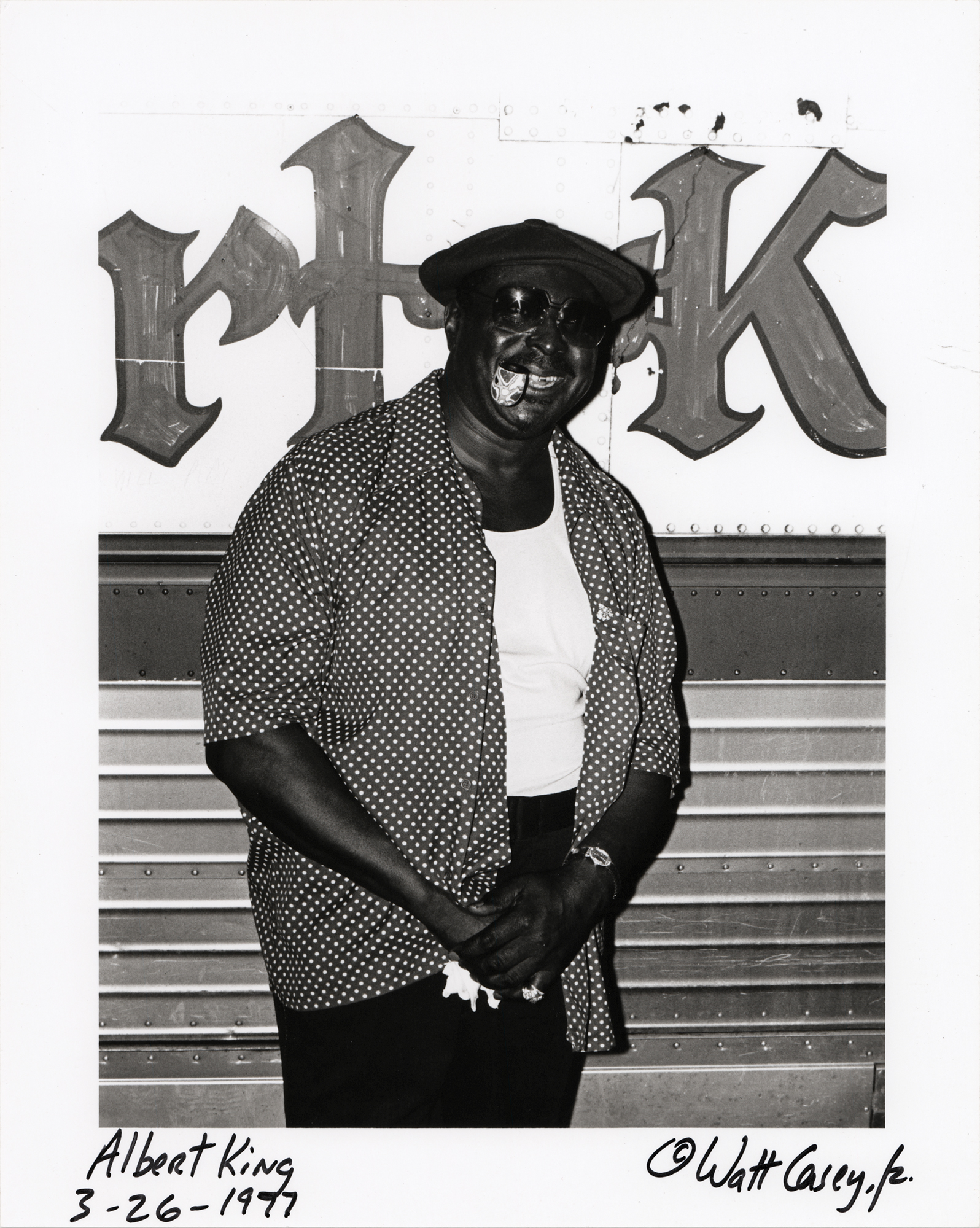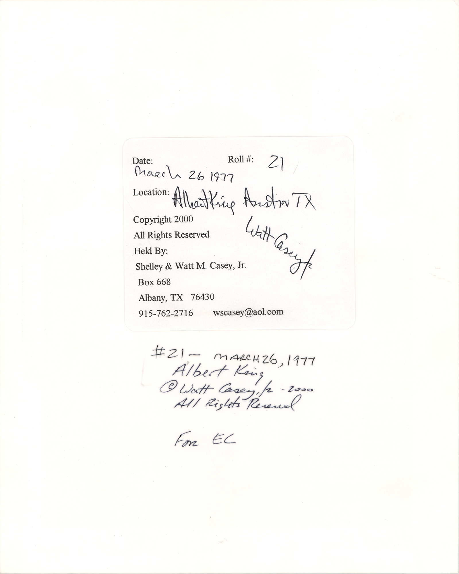 Satin-finish 8 x 10 silver gelatin photo of Albert King by photographer Watt M. Casey, Jr., which depicts the influential blues guitarist in Austin, Texas, on March 26, 1977. The lower border is signed and titled by the photographer, “Watt Casey, Jr., Albert King 3-26-1977,” and the reverse bears a copyright label and notations, which are signed by the photographer, who inscribes the photo, “For EC [Eric Clapton].” In fine condition. Accompanied by a letter of authenticity from Recordmecca's Jeff Gold, who states that this photograph was “sent to Eric Clapton, and then passed on to his longtime publicist.”