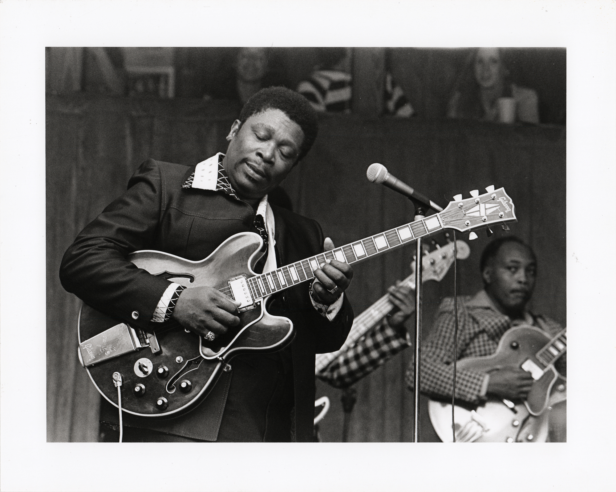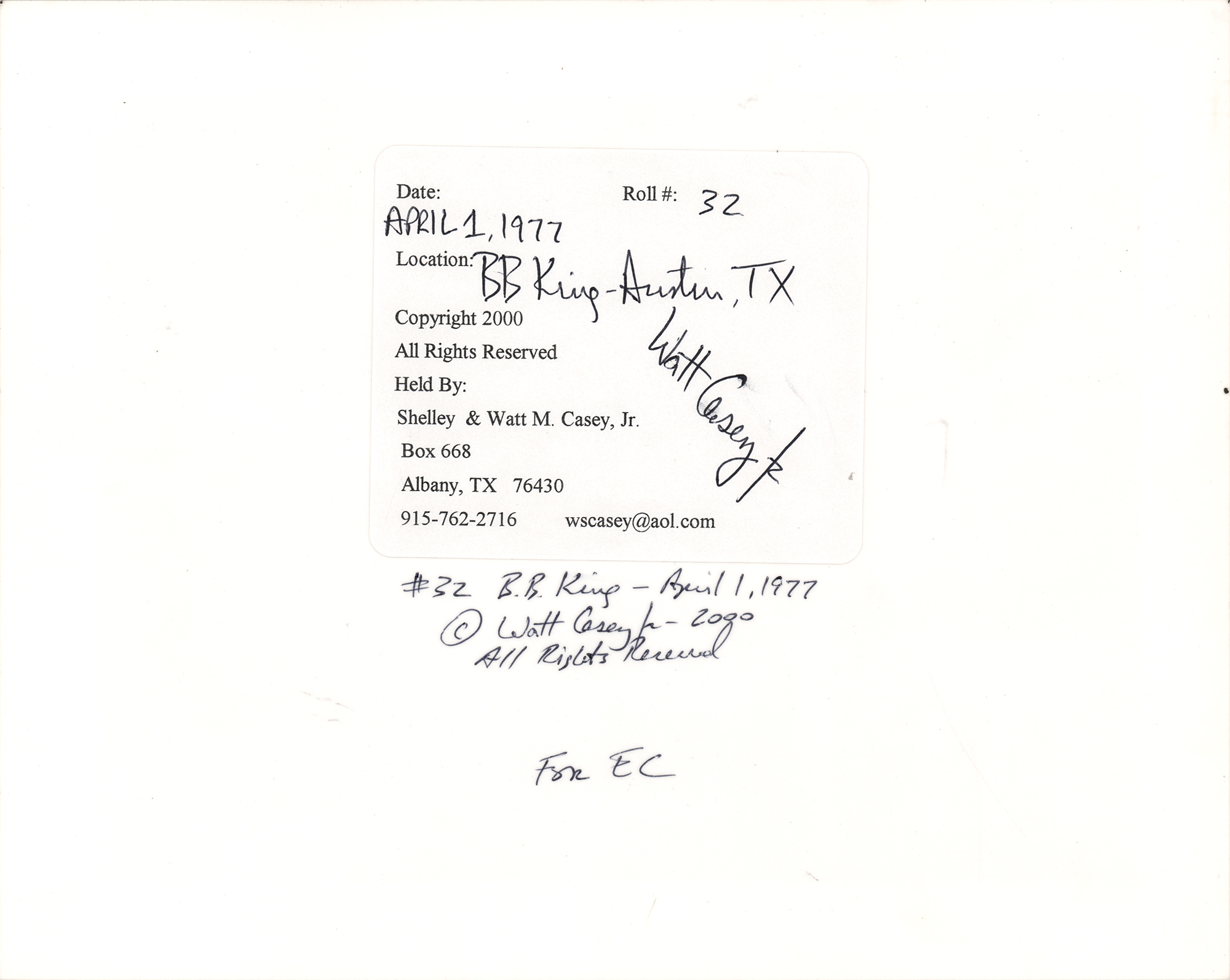 Satin-finish 10 x 8 silver gelatin photo of B. B. King by photographer Watt M. Casey, Jr., which depicts the legendary blues guitarist performing in Austin, Texas, on April 1, 1977. The reverse bears a copyright label and notations, which are signed by the photographer, who inscribes the photo, “For EC [Eric Clapton].” In fine condition. Accompanied by a letter of authenticity from Recordmecca's Jeff Gold, who states that this photograph was “sent to Eric Clapton, and then passed on to his longtime publicist.”