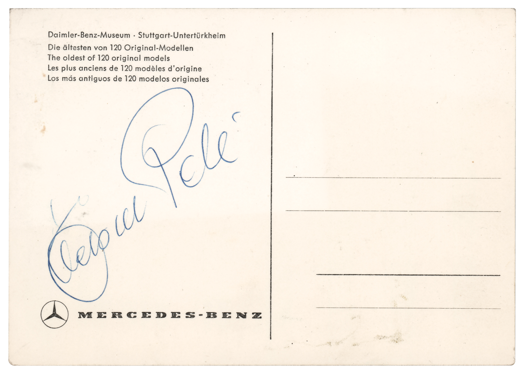 Photo postcard for the Mercedes-Benz Museum in Stuttgart, Germany, 5.75 x 4, signed on the reverse in blue ballpoint, “Edson Pele.” In fine condition.