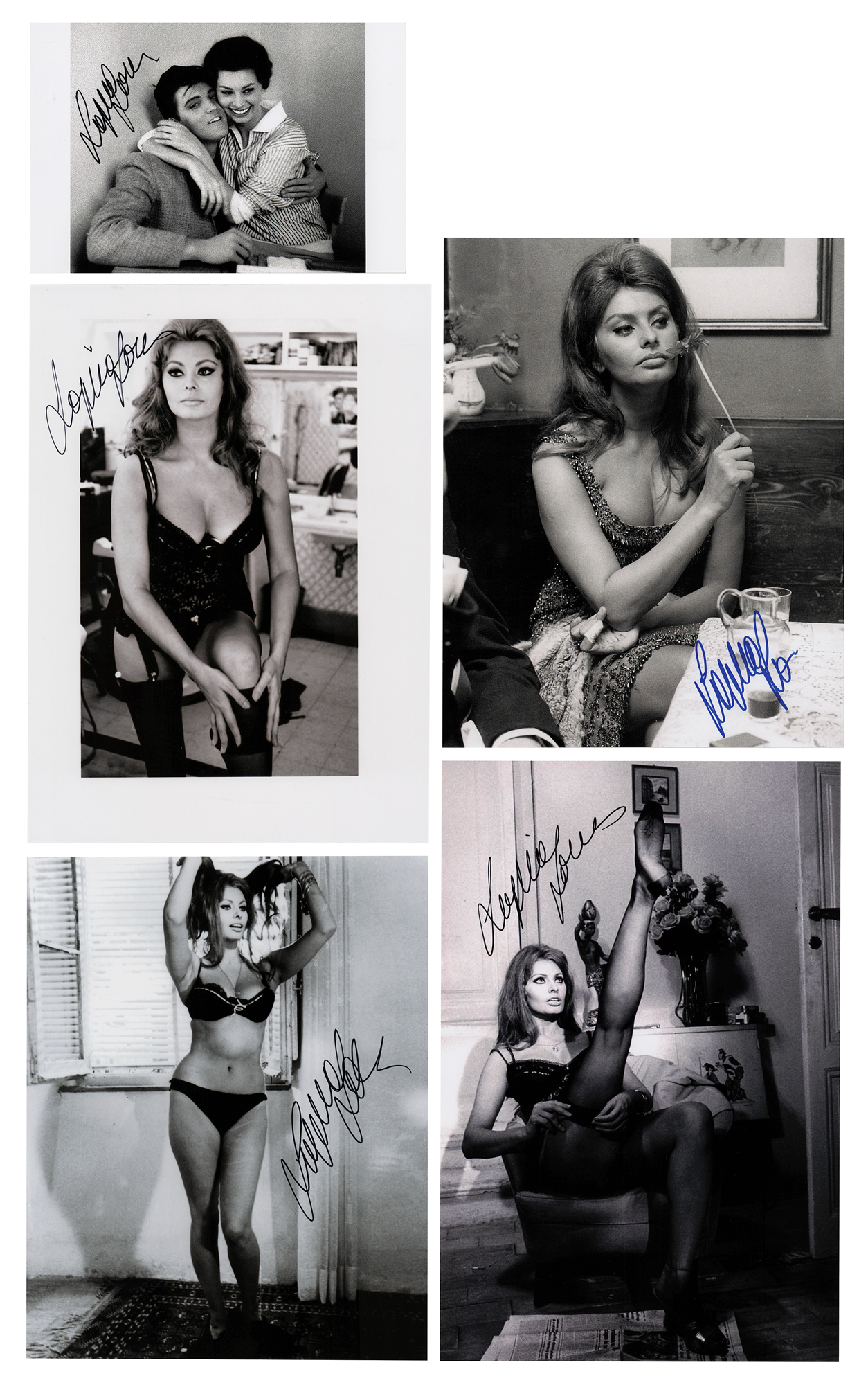 Five different glossy photos of Sophia Loren from throughout her career, ranging in size from 7.5 x 5 to 8 x 12, each signed in felt tip by the beautiful Italian actress. In overall fine condition.