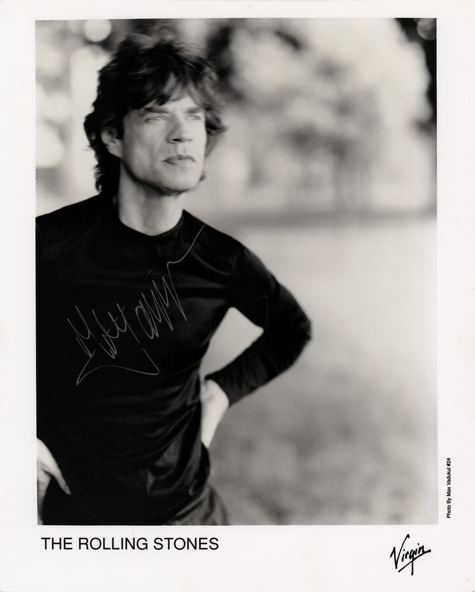 Satin-finish 8 x 10 Virgin Records publicity photo of Rolling Stones frontman Mick Jagger, signed nicely in silver ink. In fine condition.
