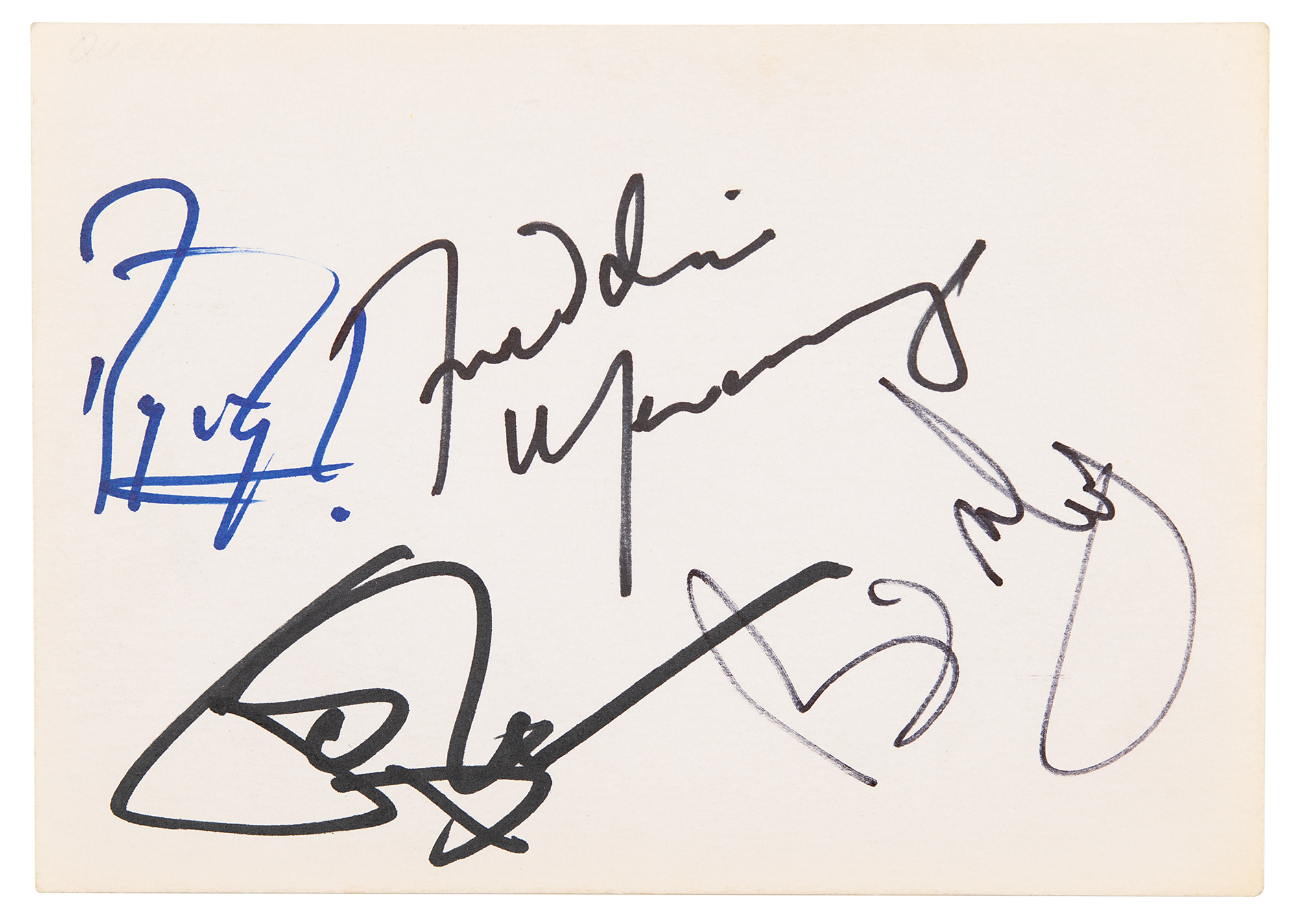 Bold felt tip signatures of Queen—Freddie Mercury, Brian May, Roger Taylor, and John Deacon—on an off-white 5.75 x 4 card. In very fine condition.