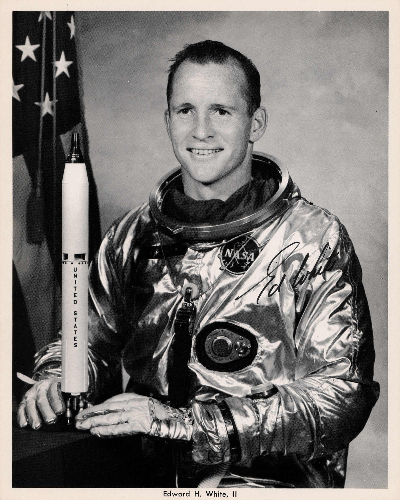 Choice official 8 x 10 NASA lithograph of White posing with a model rocket, nicely signed in black felt tip, "Ed White." In very fine condition.