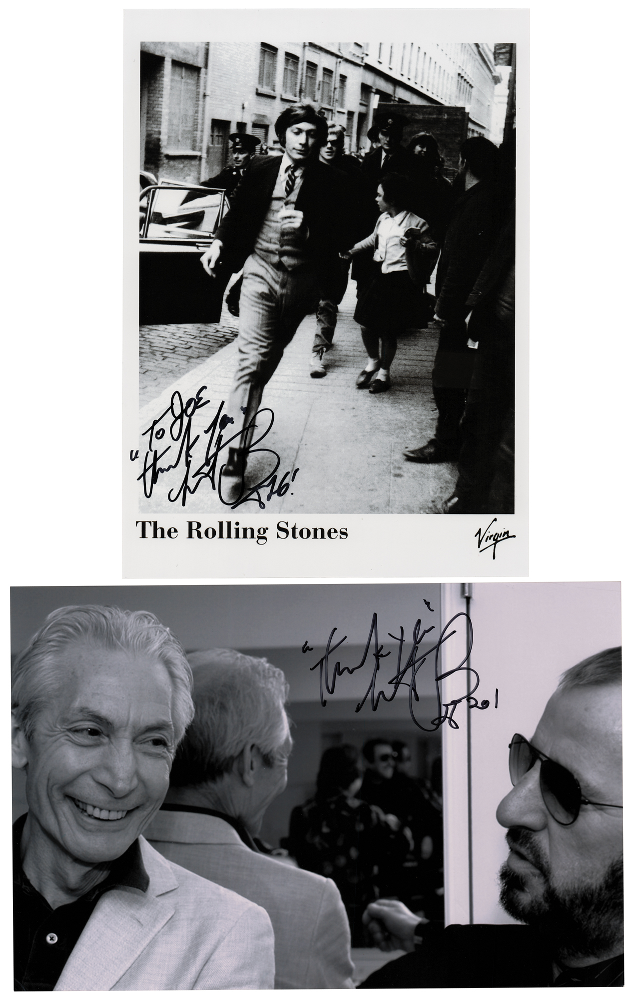 Two glossy photos signed in black felt tip by Rolling Stones drummer Charlie Watts: a 12 x 8 photo of Watts with Beatles drummer Ringo Starr, and a 8 x 11.25 Virgin Records publicity photo of Watts jogging on a crowded sidewalk, with Watts adding an inscription. In overall very fine condition.