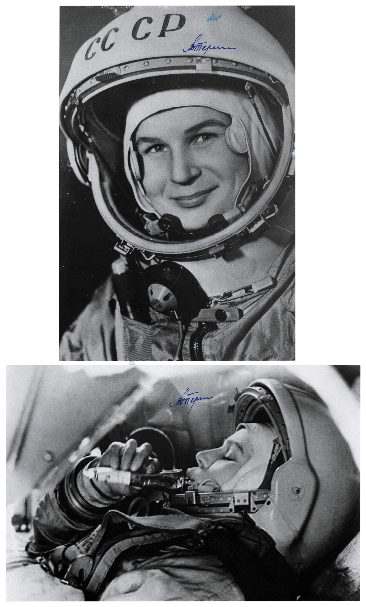 Two glossy photos, 8 x 12 and 12 x 8, of Valentina Tereshkova in her cosmonaut spacesuit, individually signed in blue felt tip. In overall very good to fine condition, with staple holes to each, and light dampstaining to one edge.