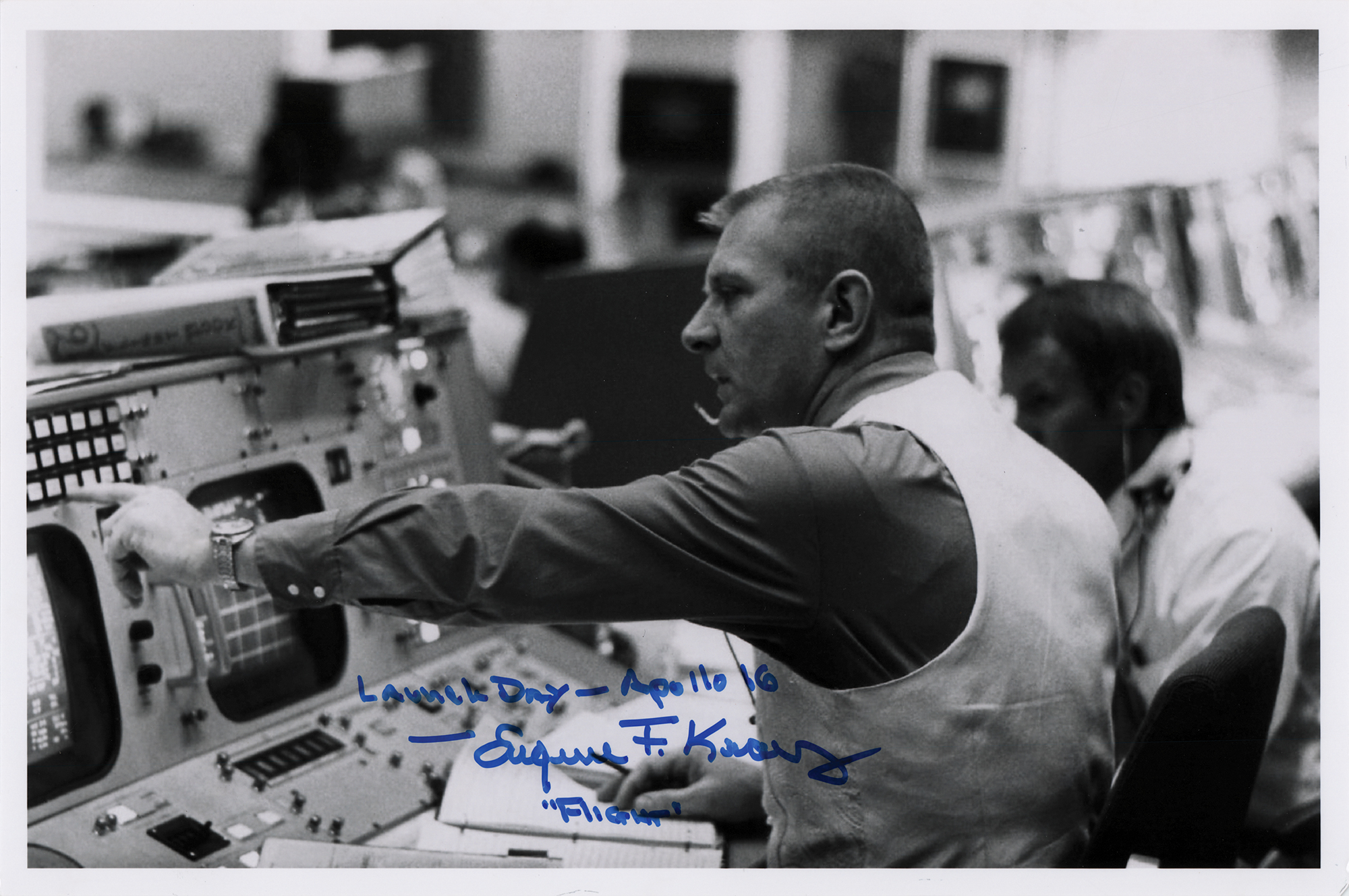 Glossy 12 x 8 photo of Flight Director Gene Kranz in mission control, signed in blue felt tip, "Launch day – Apollo 16 – Eugene F. Kranz, 'Flight'.” In very fine condition.