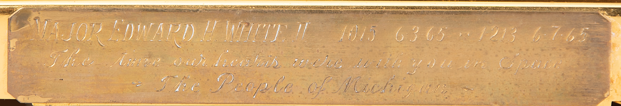 Beautiful Jaeger-LeCoultre Atmos clock presented to Edward H. White II by Michigan Governor George W. Romney in June 1965, following the historic flight of Gemini 4, when White became the first American to perform extravehicular activity. The Swiss-made luxury clock, 8.25˝ x 9.25˝ x 6.5˝, bears an engraved presentation plate to the bottom front base: “Major Edward H. White II, The time our hearts were with you in space, The People of Michigan,” with upper right bearing launch and landing time and dates: “1015, 6-3-65, 1213, 6-7-65.” In fine condition, with some wear and scuffs to clock casing.