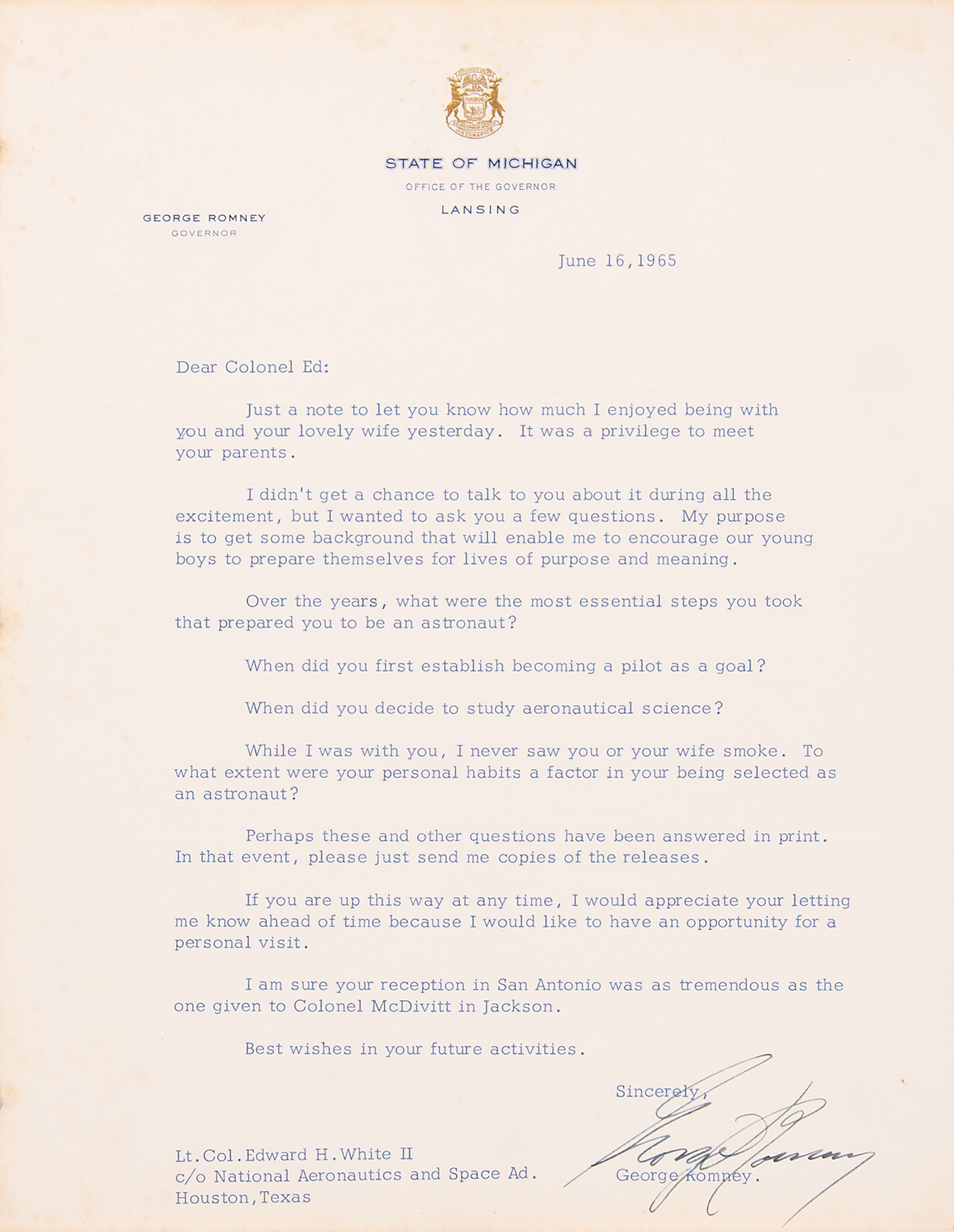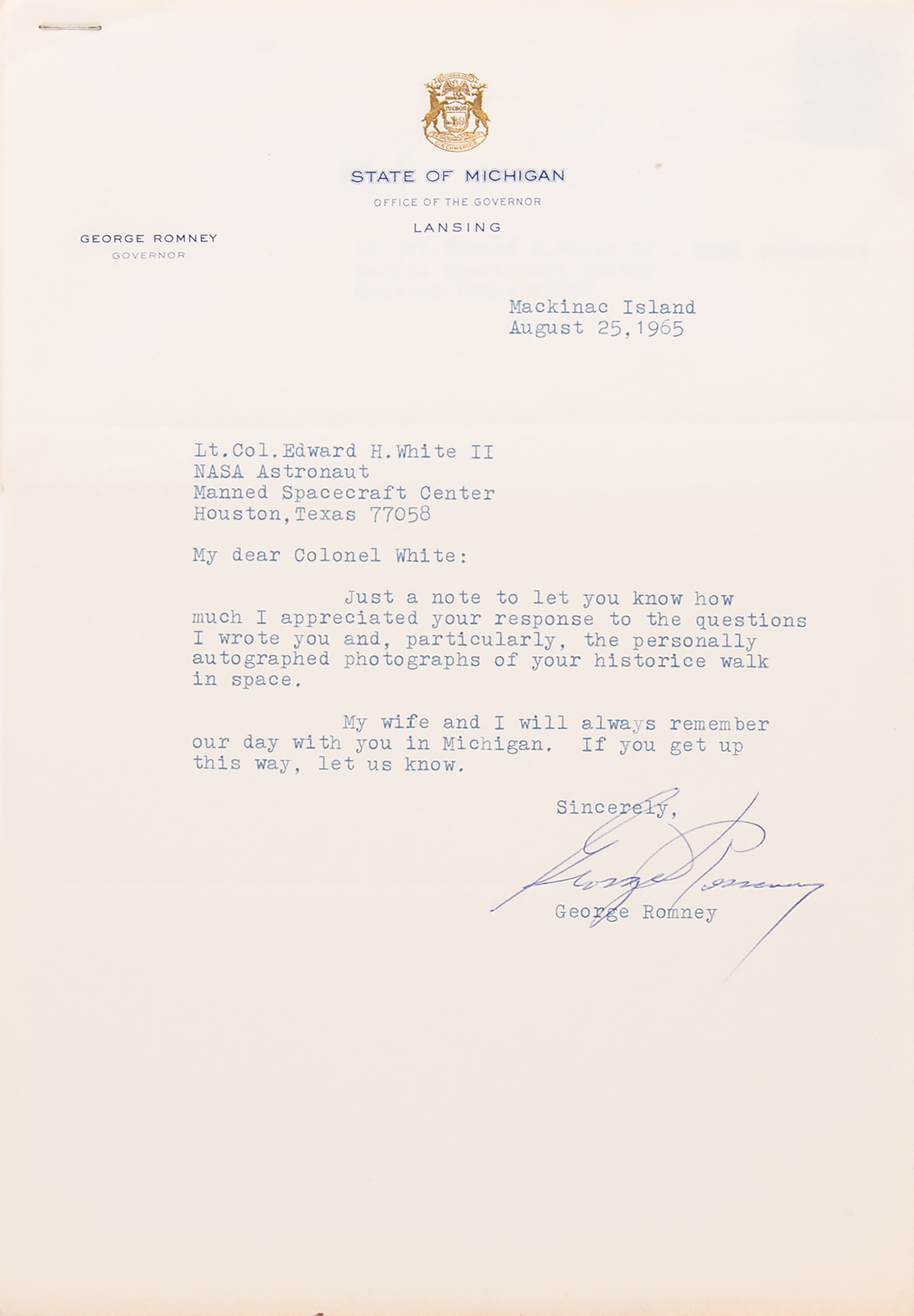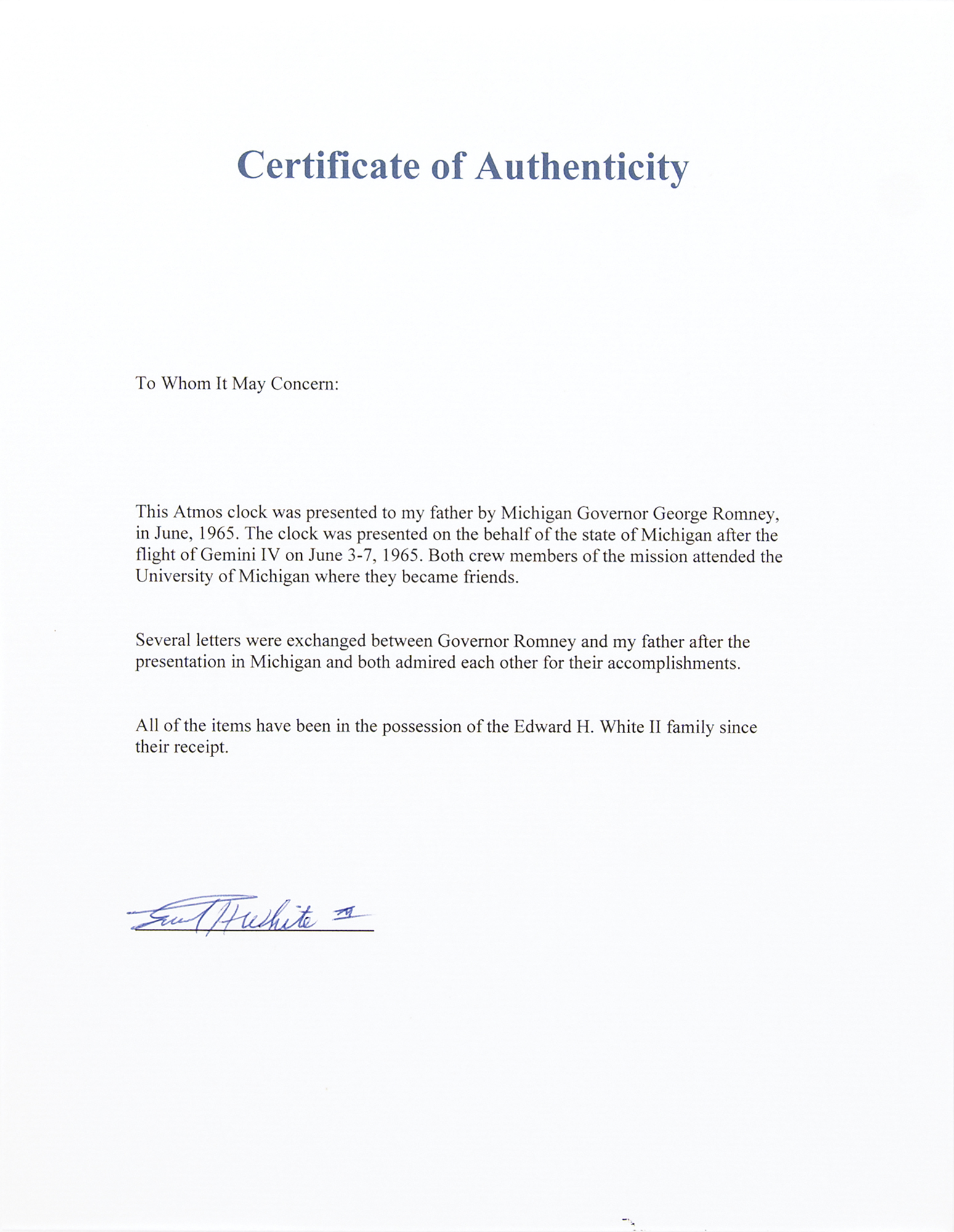 Accompanied by two TLSs from Governor Romney to White, and a signed certificate of authenticity from White’s son, Edward H. White III, in full: “This Atmos clock was presented to my father by Michigan Governor George Romney, in June, 1965. The clock was presented on the behalf of the state of Michigan after the flight of Gemini IV on June 3-7, 1965. Both crew members of the mission attended the University of Michigan where they became friends. Several letters were exchanged between Governor Romney and my father after the presentation in Michigan and both admired each other for their accomplishments. All of the items have been in the possession of the Edward H. White II family since their receipt.”