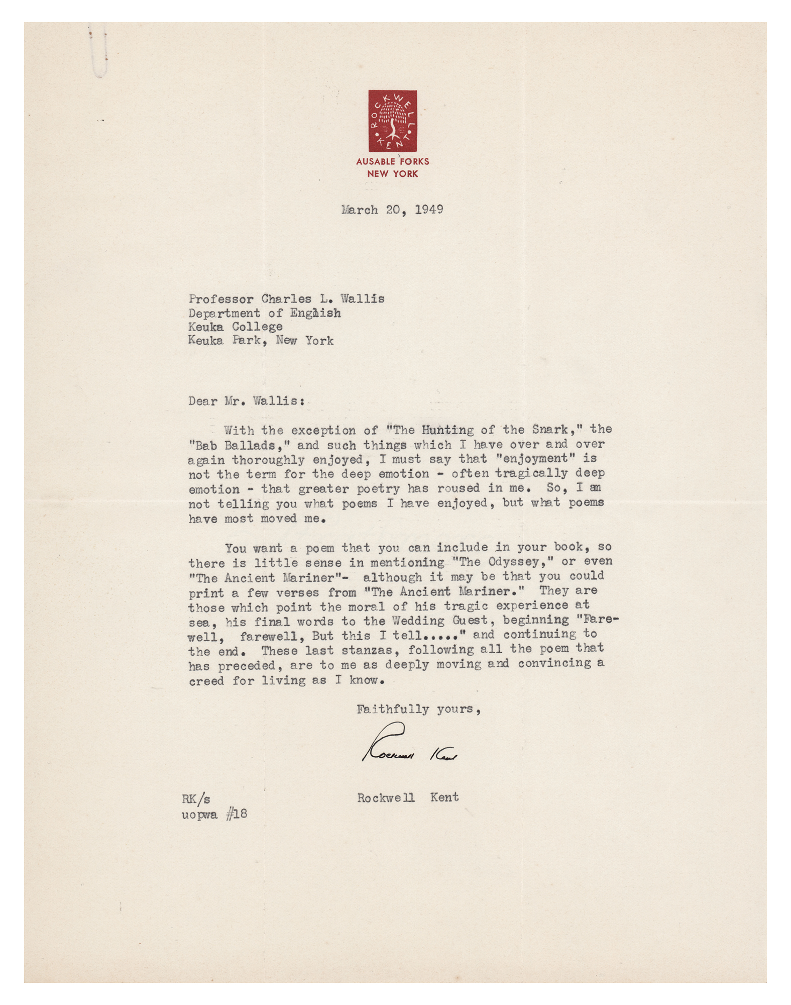 TLS, one page, 8.5 x 11, Ausable Forks letterhead, March 20, 1949. Letter to English Professor Charles L. Wallis at the Keuka College in New York, in full: “With the exception of ‘The Hunting of the Snark,’ the ‘Bab Ballads,’ and such things which I have over and over again thoroughly enjoyed, I must say that ‘enjoyment’ is not the term for the deep emotion – often tragically deep emotion – that greater poetry has roused in me. So, I am not telling you what poems I have enjoyed, but what poems have most moved me.