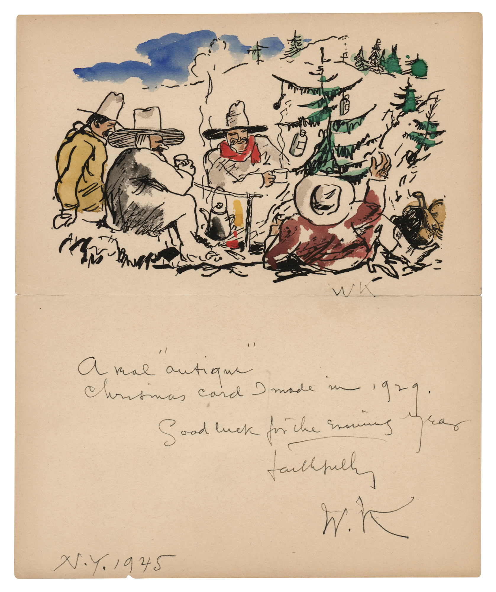 American painter (1877-1949) and an organizer of the famous Armory Show of 1913, which was America's first large-scale introduction to European Modernism. Vintage Christmas card from Walter Kuhn, 5.75 x 7.25, featuring a printed reproduction of a hand-colored drawing by Kuhn depicting several Old West figures sitting around a campfire next to a small ‘Christmas tree.’ Signed in the lower portion in black ink, “A real 'antique' Christmas card I made in 1929. Good Luck for the ensuing year, faithfully, W. K., N. Y. 1945.” In fine condition.