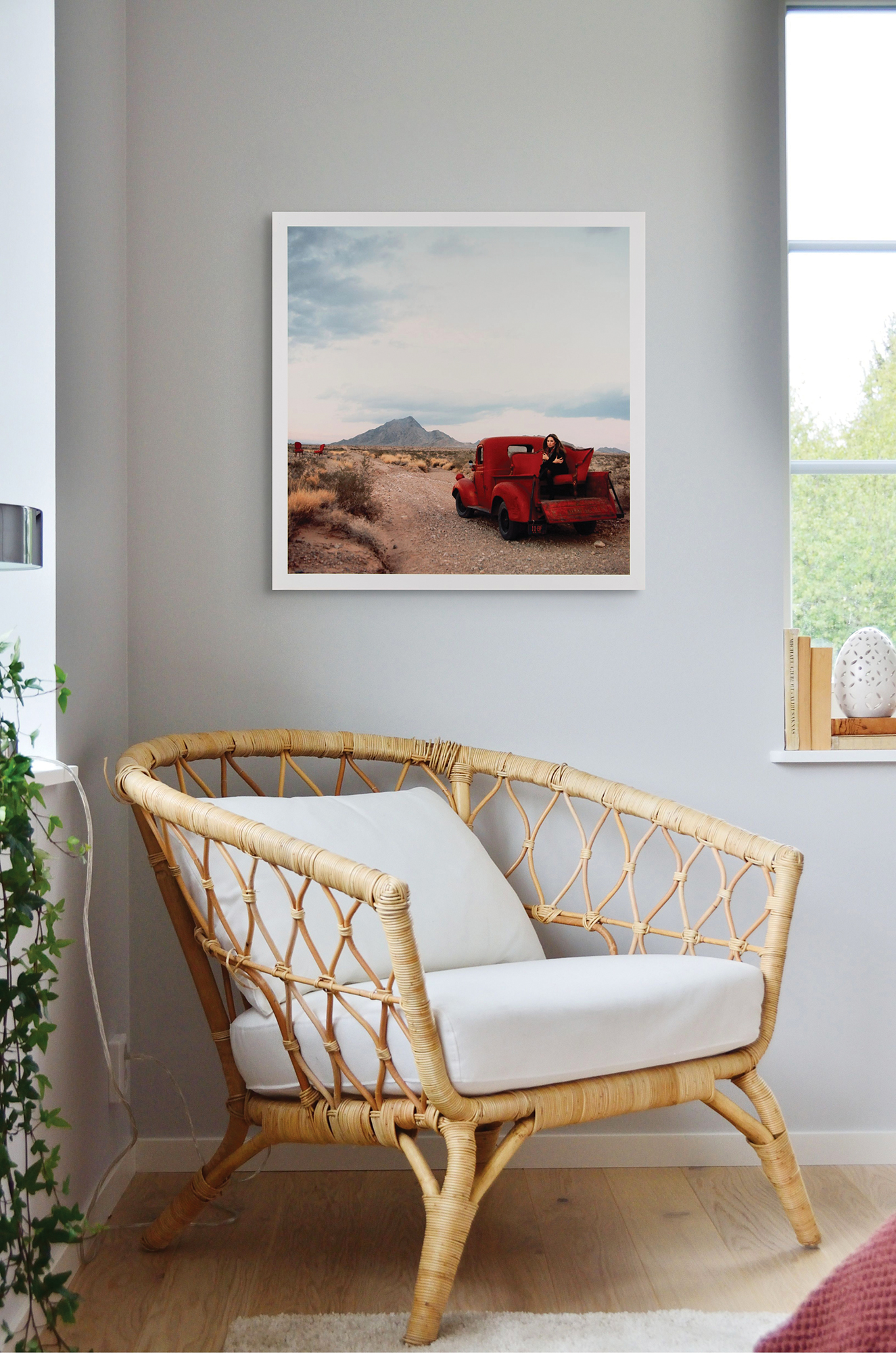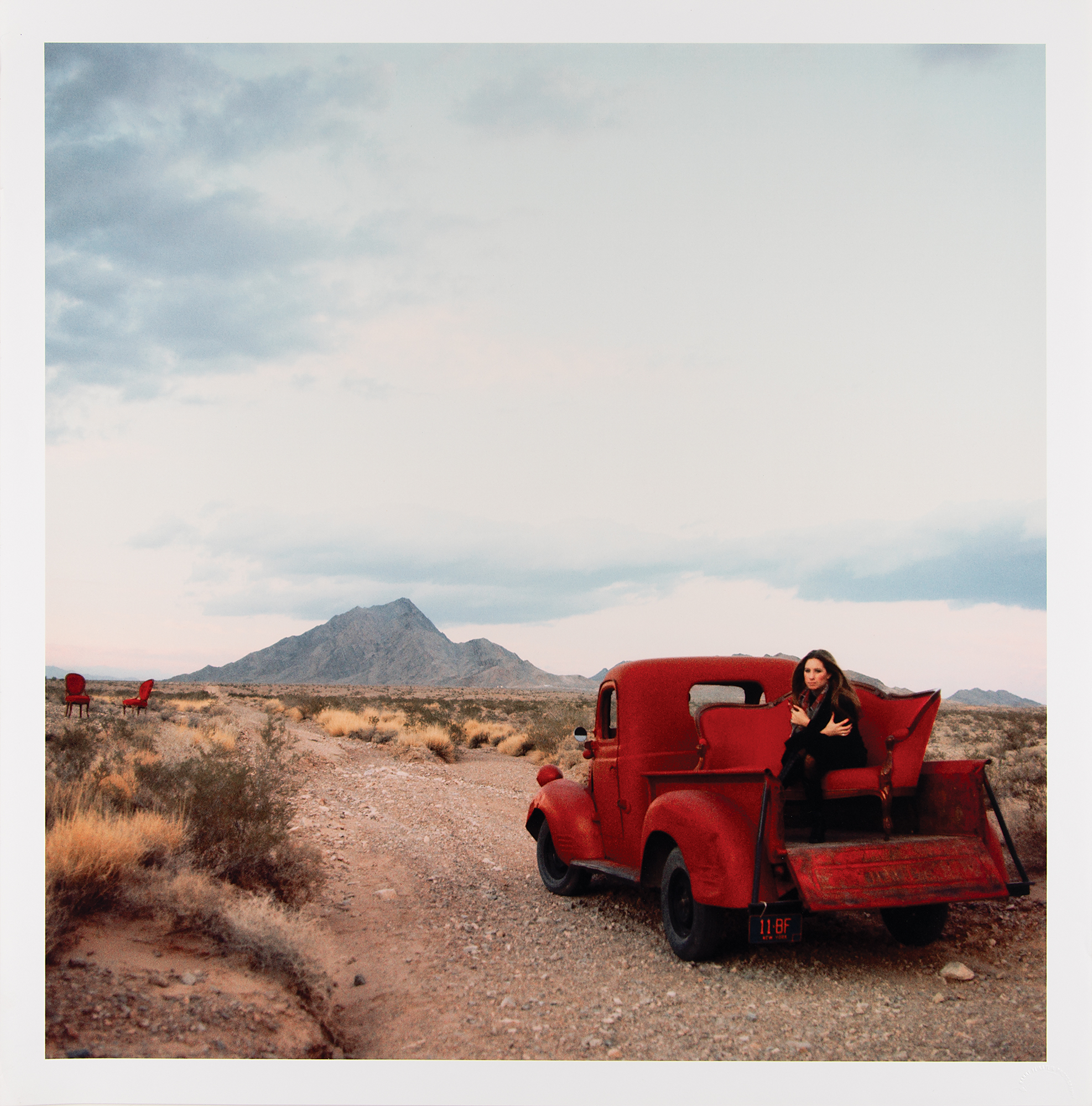 Limited edition color satin-finish 24 x 24 outtake print from the shoot for the front of Barbra Streisand's 1970 album Stoney End, showing the versatile entertainer seated on an antique sofa in the back of a red pickup truck in the Mojave Desert, looking toward Sunrise Mountain, with two red chairs in the background. The piece has a "Barry Feinstein Photography" blindstamp in the lower right corner and a Barry Feinstein copyright stamp on the reverse, and is annotated on the reverse in black felt tip: "Barbra Streisand, 'Stoney End,' 1971, 3/25." In fine condition. This limited edition print was created for a gallery in the 1990s—this example was kept by Feinstein for his personal collection.
