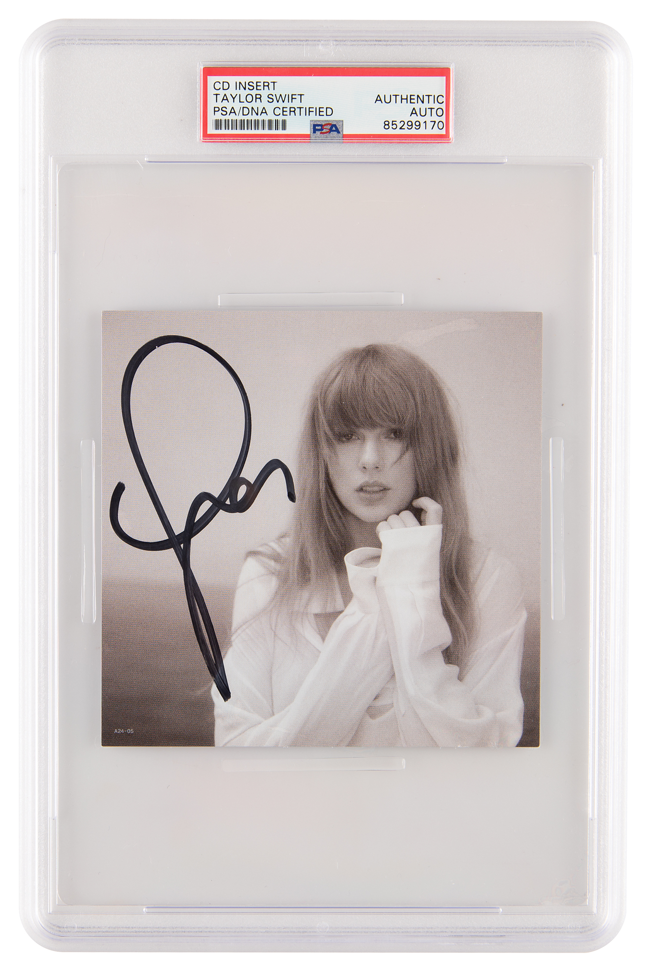 Appealing 4.75 x 4.75 CD insert photo of Taylor Swift for her eleventh studio album The Tortured Poets Department, signed in black felt tip. In very fine condition. Encapsulated in a PSA/DNA authentication holder.