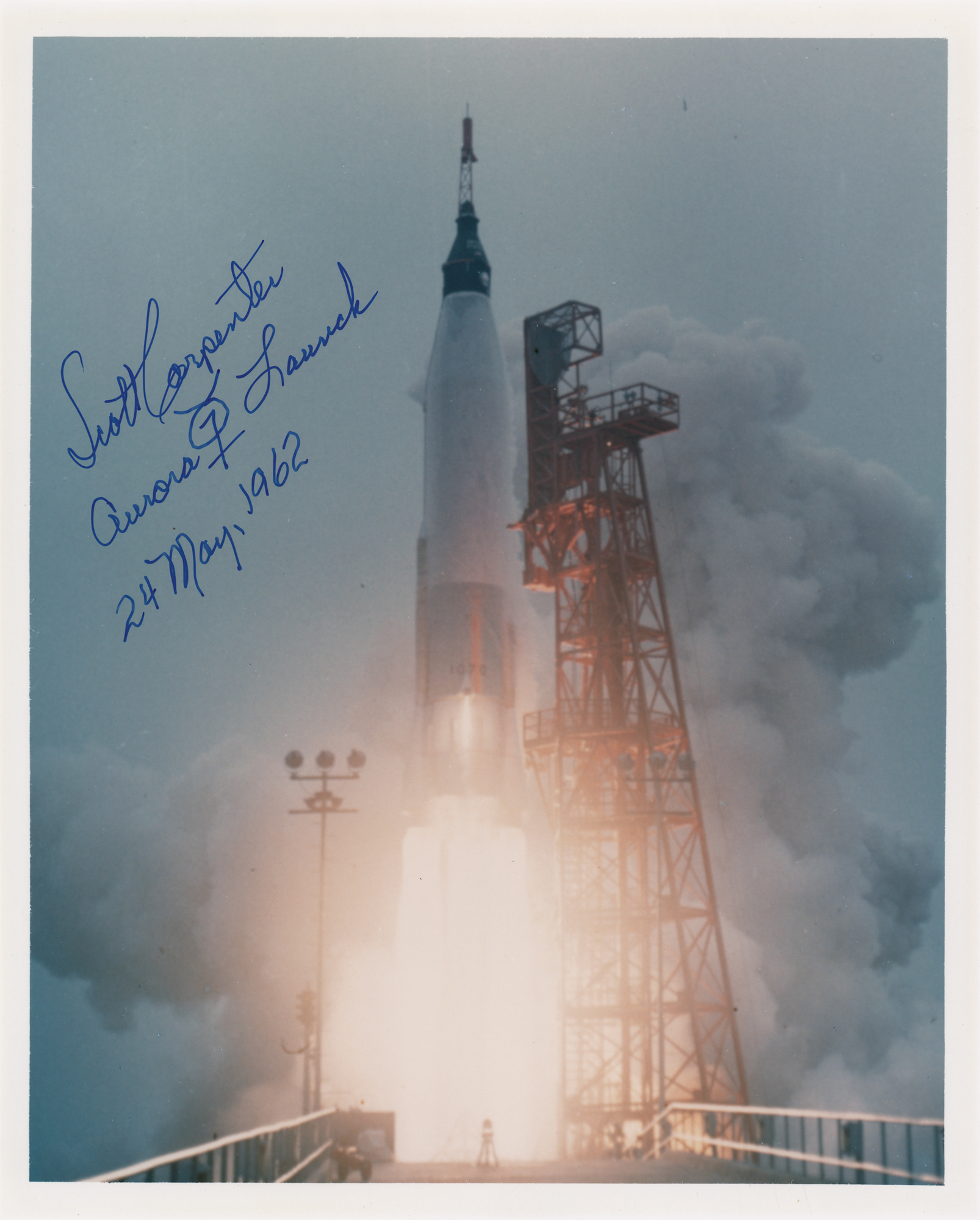 Color semi-glossy 8 x 10 photo of the Mercury-Atlas 7 launch at Cape Canaveral, Florida, signed in blue felt tip, “Scott Carpenter, Aurora 7 launch, 24 May, 1962.” In very fine condition.