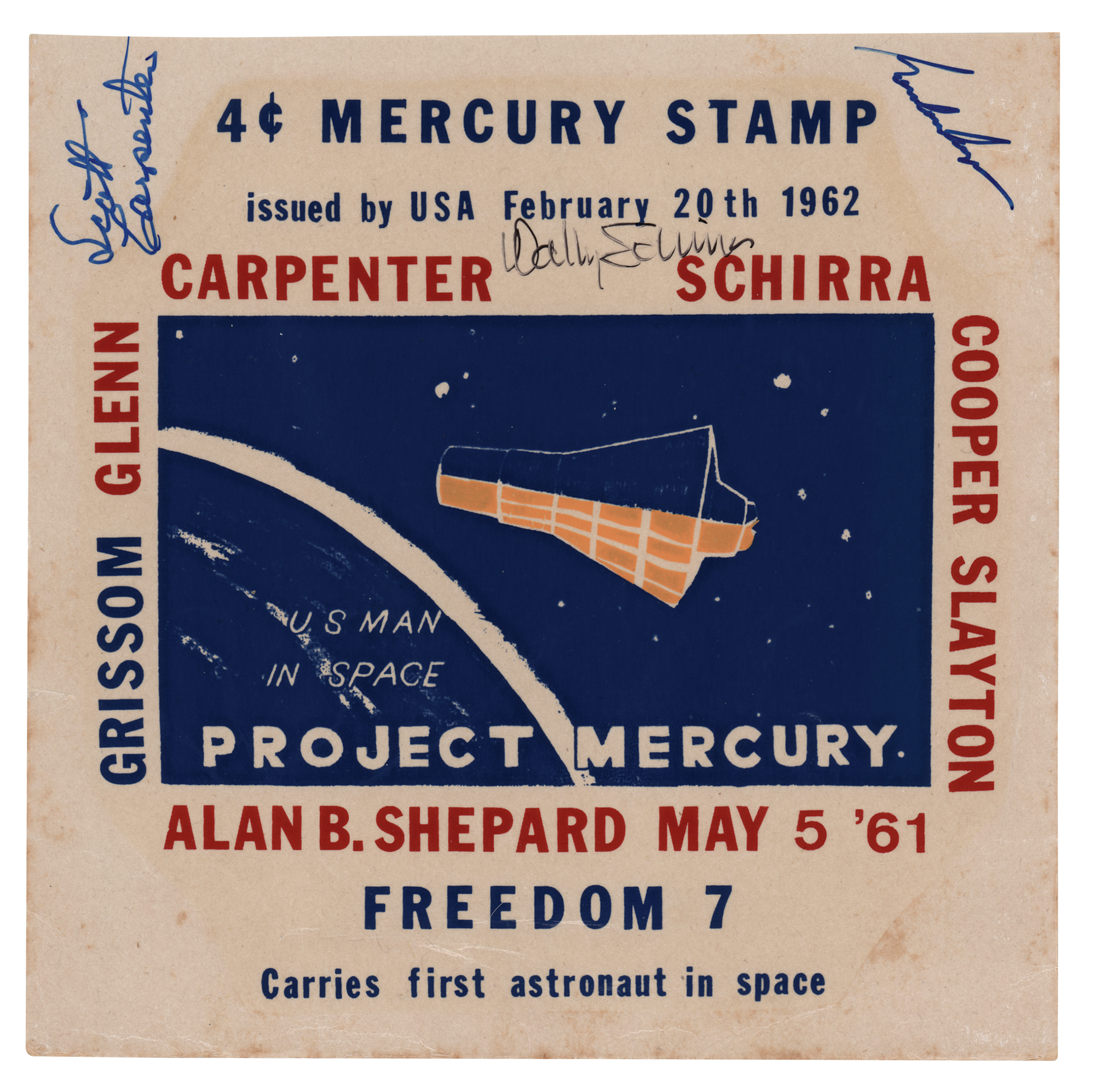 Unused decal honoring Project Mercury, depicting an illustration of the Freedom 7 capsule in space and surrounded buy the surnames of the Mercury Seven astronauts, signed along the outer border in blue felt tip by Scott Carpenter and Gordon Cooper, and in black felt tip by Wally Schirra. In very good to fine condition, with creasing to the lower margin.