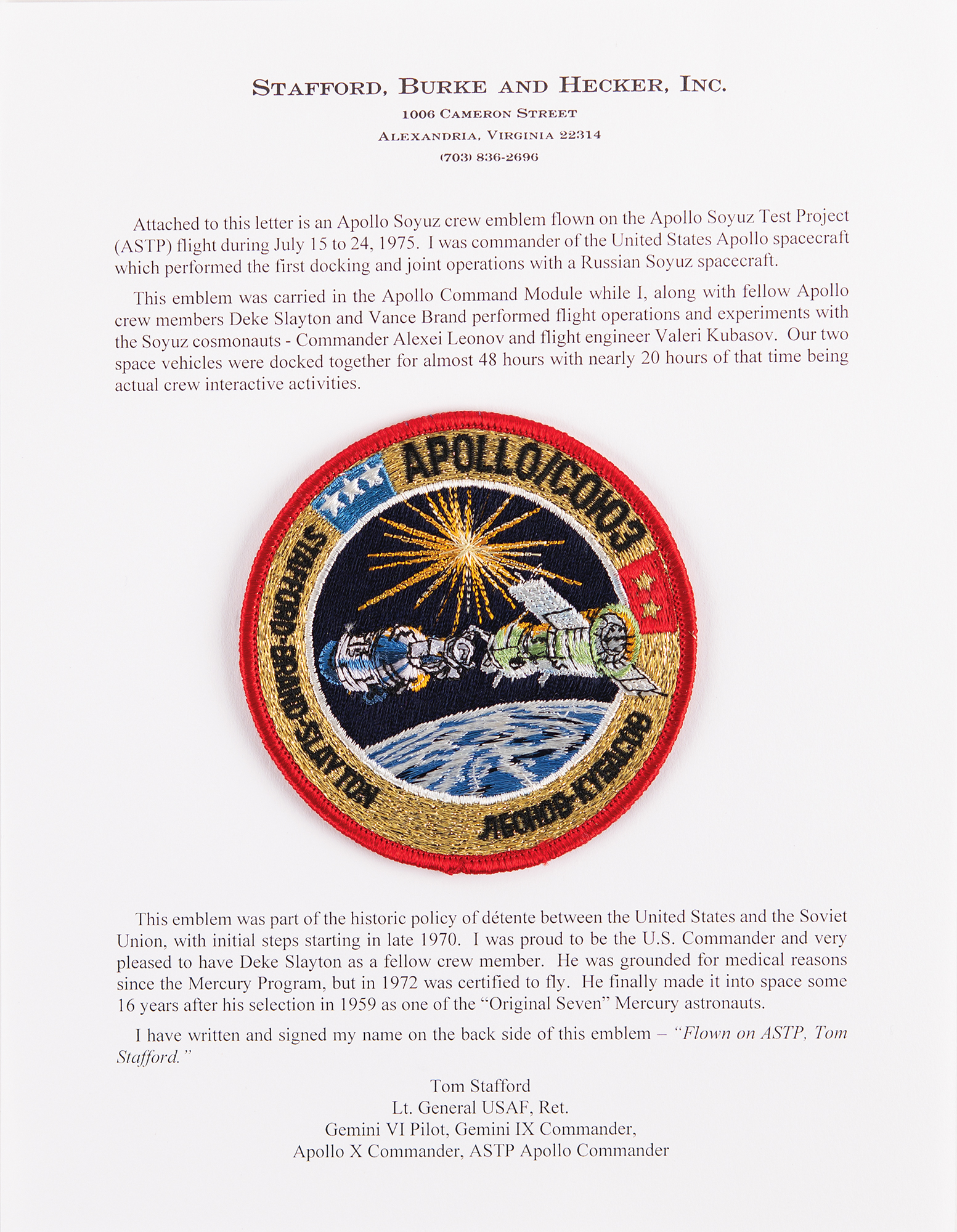 Scarce embroidered Apollo-Soyuz Test Project (ASTP) crew emblem patch carried on the cooperative USA–USSR mission, measuring 4˝ in diameter, signed and flight-certified on the reverse in blue felt tip, "Flown on ASTP, Tom Stafford." In fine condition. Accompanied by a provenance letter on the letterhead of Stafford's consulting firm, in part: "Attached to this letter is an Apollo Soyuz crew emblem flown on the Apollo Soyuz Test Project (ASTP) flight during July 15 to 24, 1975. I was commander of the United States Apollo spacecraft which performed the first docking and joint operations with a Russian Soyuz spacecraft. This emblem was carried in the Apollo Command Module while I, along with fellow Apollo crew members Deke Slayton and Vance Brand performed flight operations and experiments with the Soyuz cosmonauts—Commander Alexei Leonov and flight engineer Valeri Kubasov. Our two space vehicles were docked together for almost 48 hours with nearly 20 hours of that time being actual crew interactive activities. This emblem was part of the historic policy of détente between the United States and the Soviet Union, with initial steps starting in late 1970. I was proud to be the U.S. Commander and very pleased to have Deke Slayton as a fellow crew member. He was grounded for medical reasons since the Mercury Program, but in 1972 was certified to fly. He finally made it into space some 16 years after his selection in 1959 as one of the 'Original Seven' Mercury astronauts."