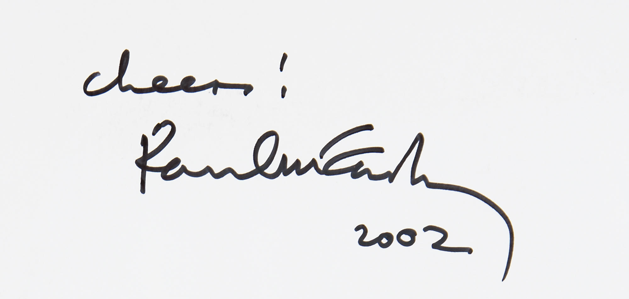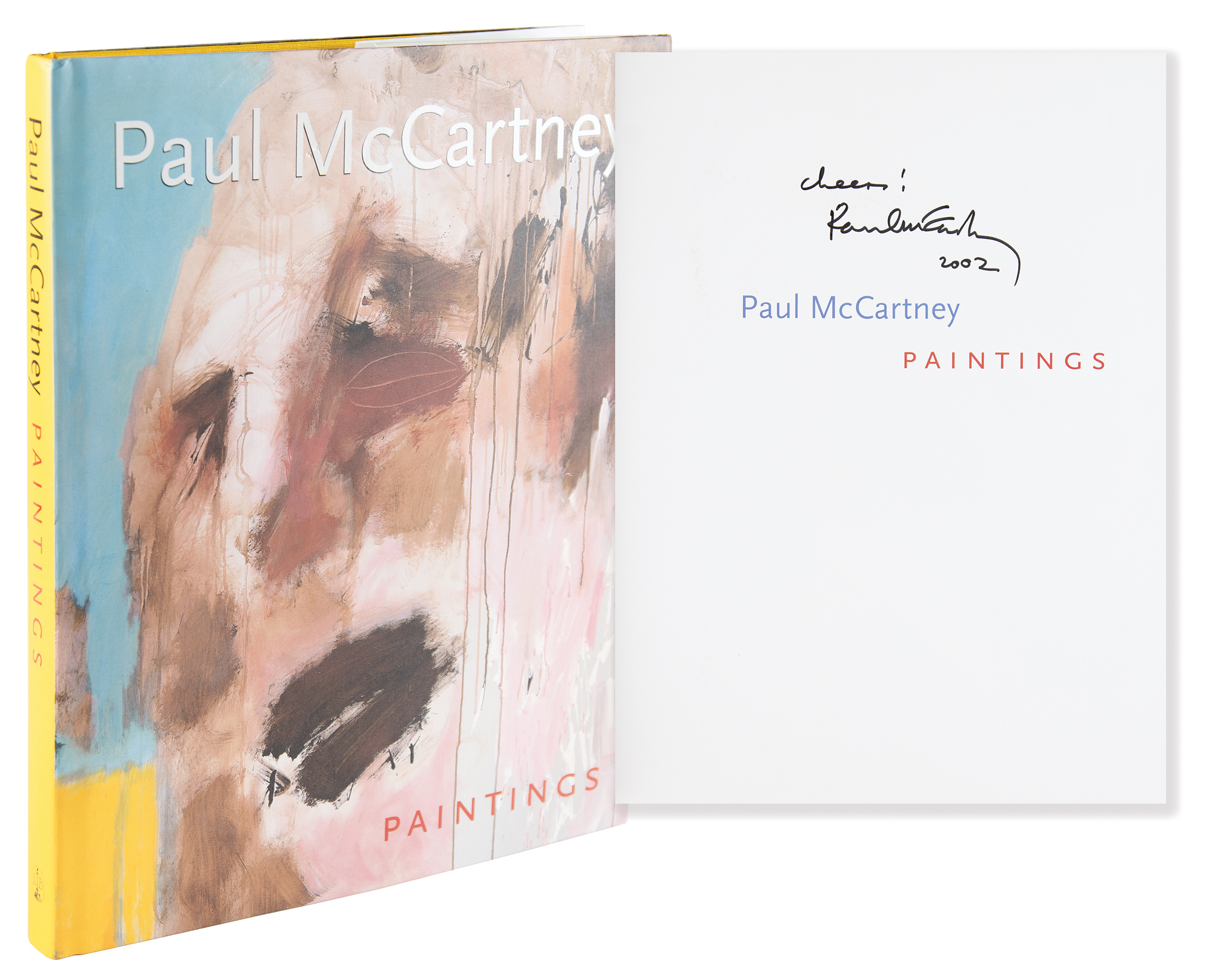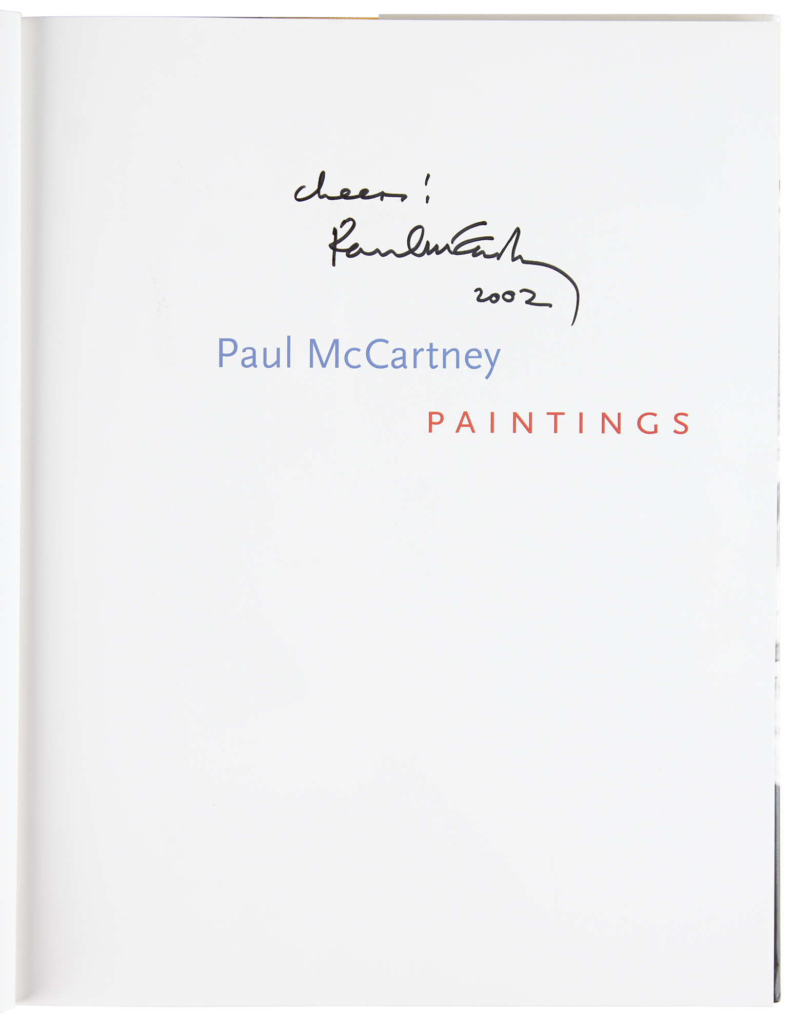 Signed book: Paintings. NY: Little, Brown and Company, 2000. Hardcover with dust jacket, 10.25 x 12.75, 147 pages. Signed on the half title page in black felt tip, "Cheers! Paul McCartney, 2002." In very fine condition.