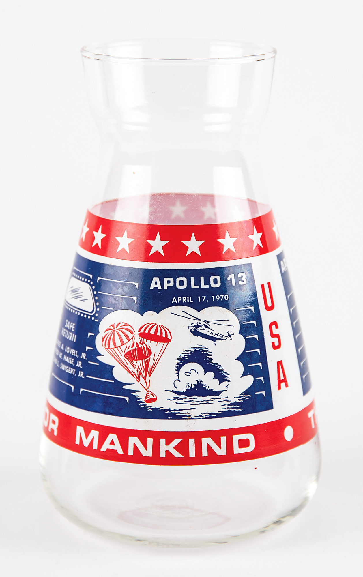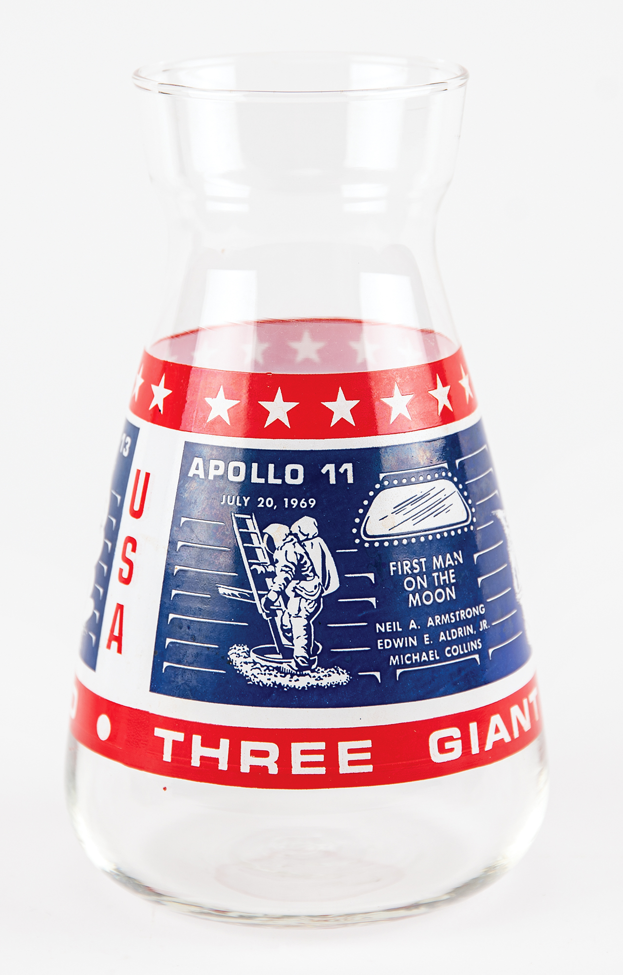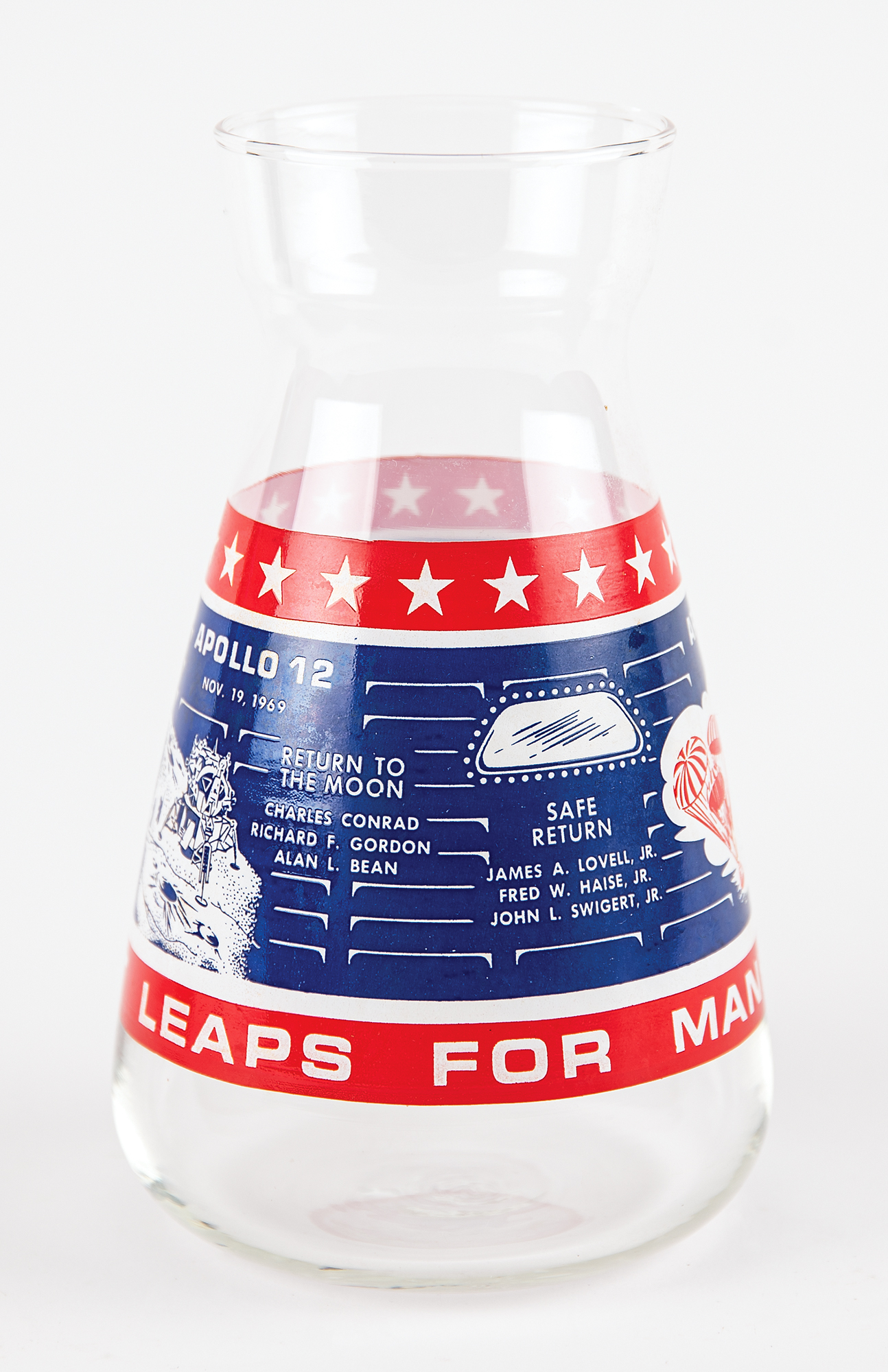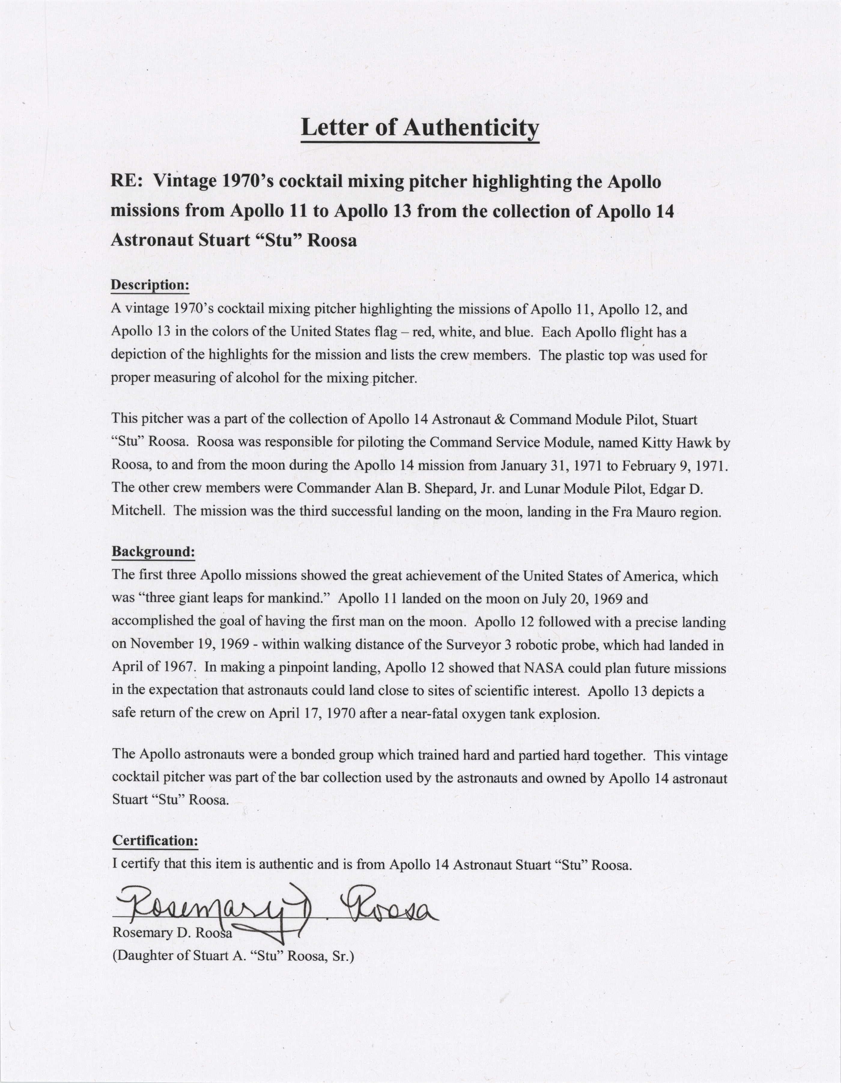 Vintage 1970s commemorative Project Apollo cocktail mixing pitcher from the collection of Apollo 14 CMP Stuart A. Roosa, 8.5˝ in height with a base diameter of 4.5˝, featuring patriotic colors and designs honoring the first three lunar-landing missions—Apollo 11, Apollo 12, and Apollo 13—with text to bottom reading: “Three Giant Leaps for Mankind.” Includes its original plastic stopper cap. In fine condition. Accompanied by two letters of authenticity from Rosemary D. Roosa, the daughter of Apollo 14 CMP Stuart A. Roosa.