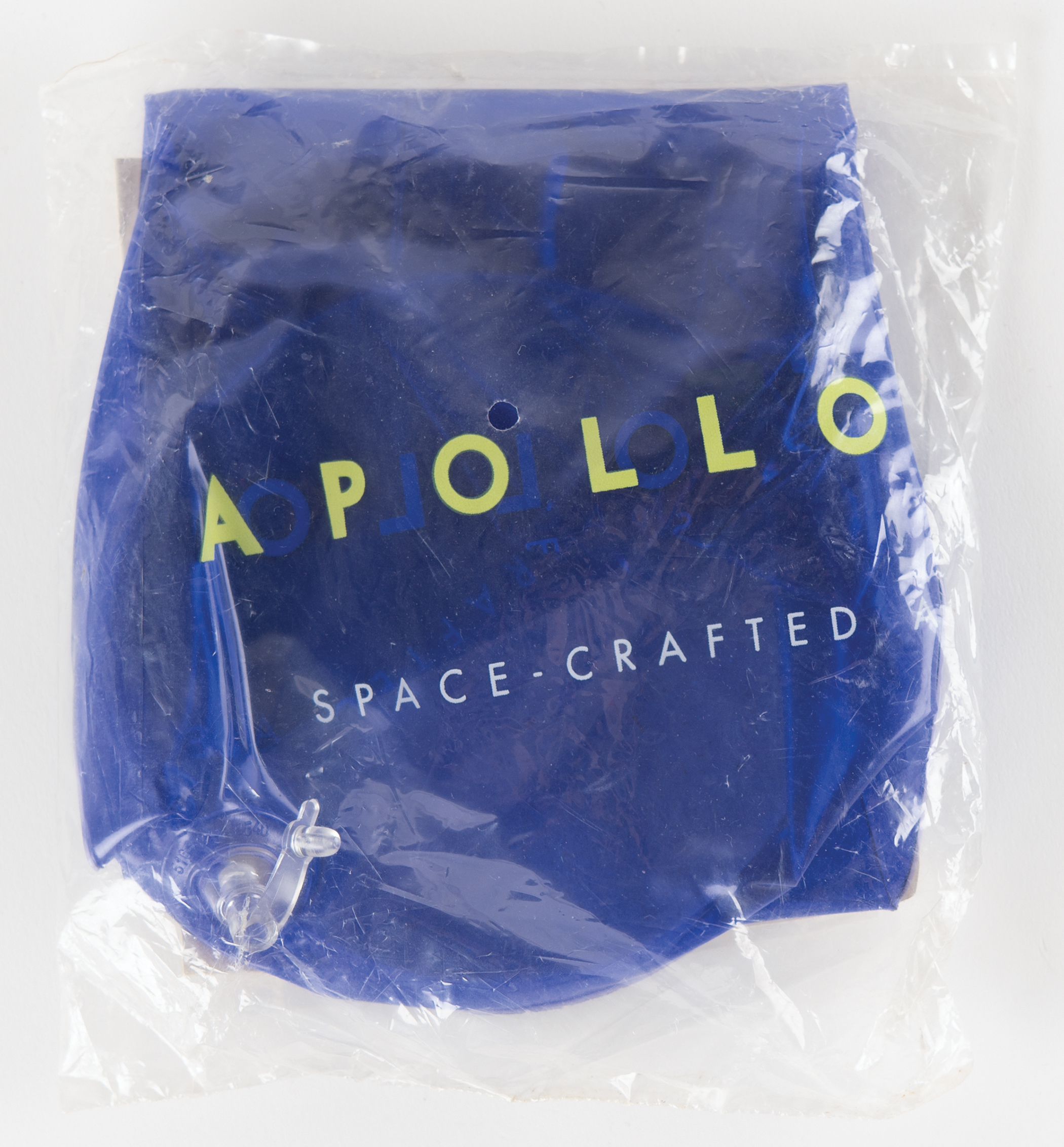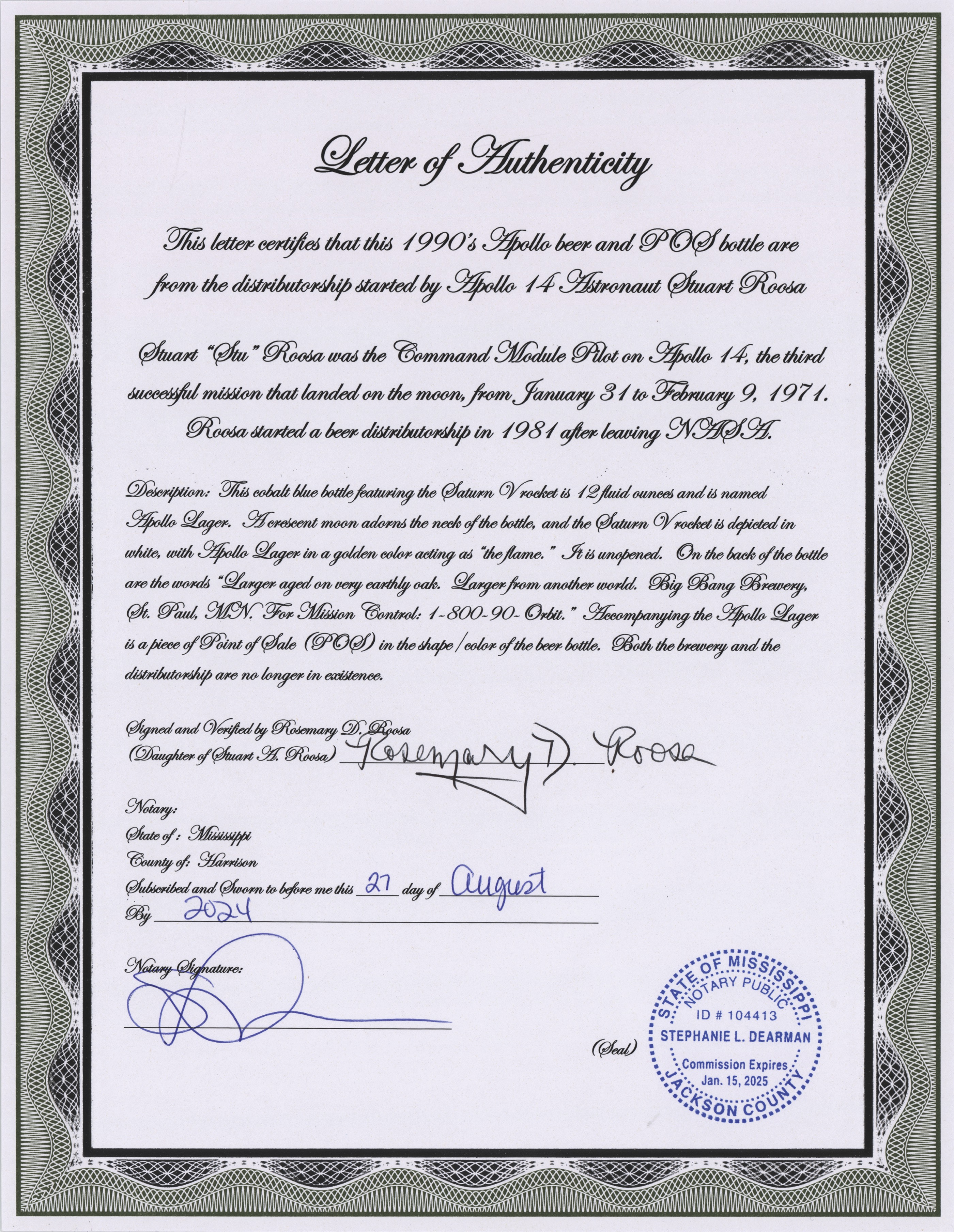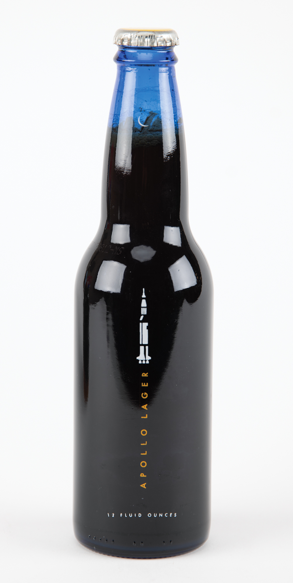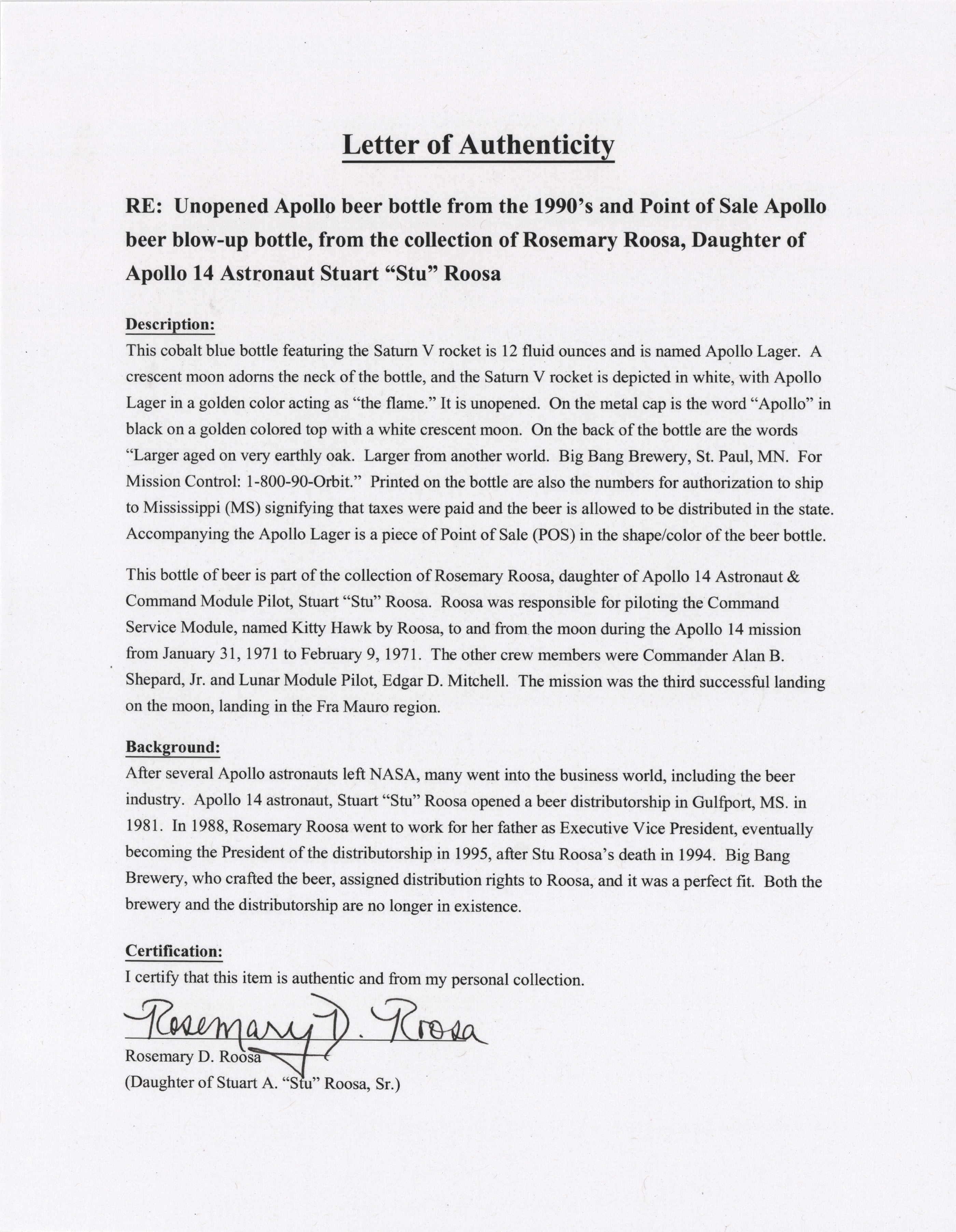 Unopened bottle of Apollo Lager by the Bang Brewing Company, deriving from the distributorship of Apollo 14 CMP Stuart A. Roosa, 12 fluid ounces, with blue glass bottle featuring a crescent moon and Saturn rocket imagery, with a caption to reverse: “Lager aged on very earthly oak. Lager from another world.” The ‘moon yellow’ cap bears the opening “blast off” instructions. Includes an unopened Apollo Lager inflatable bottle from the 1990s. In fine condition. Accompanied by two letters of authenticity from Rosemary D. Roosa, the daughter of Apollo 14 CMP Stuart A. Roosa.