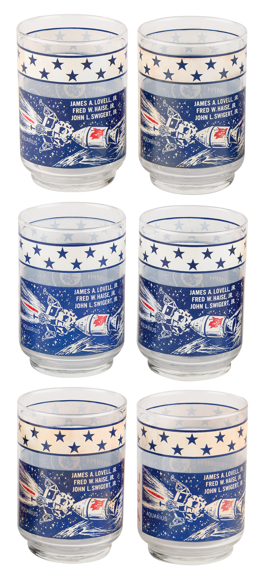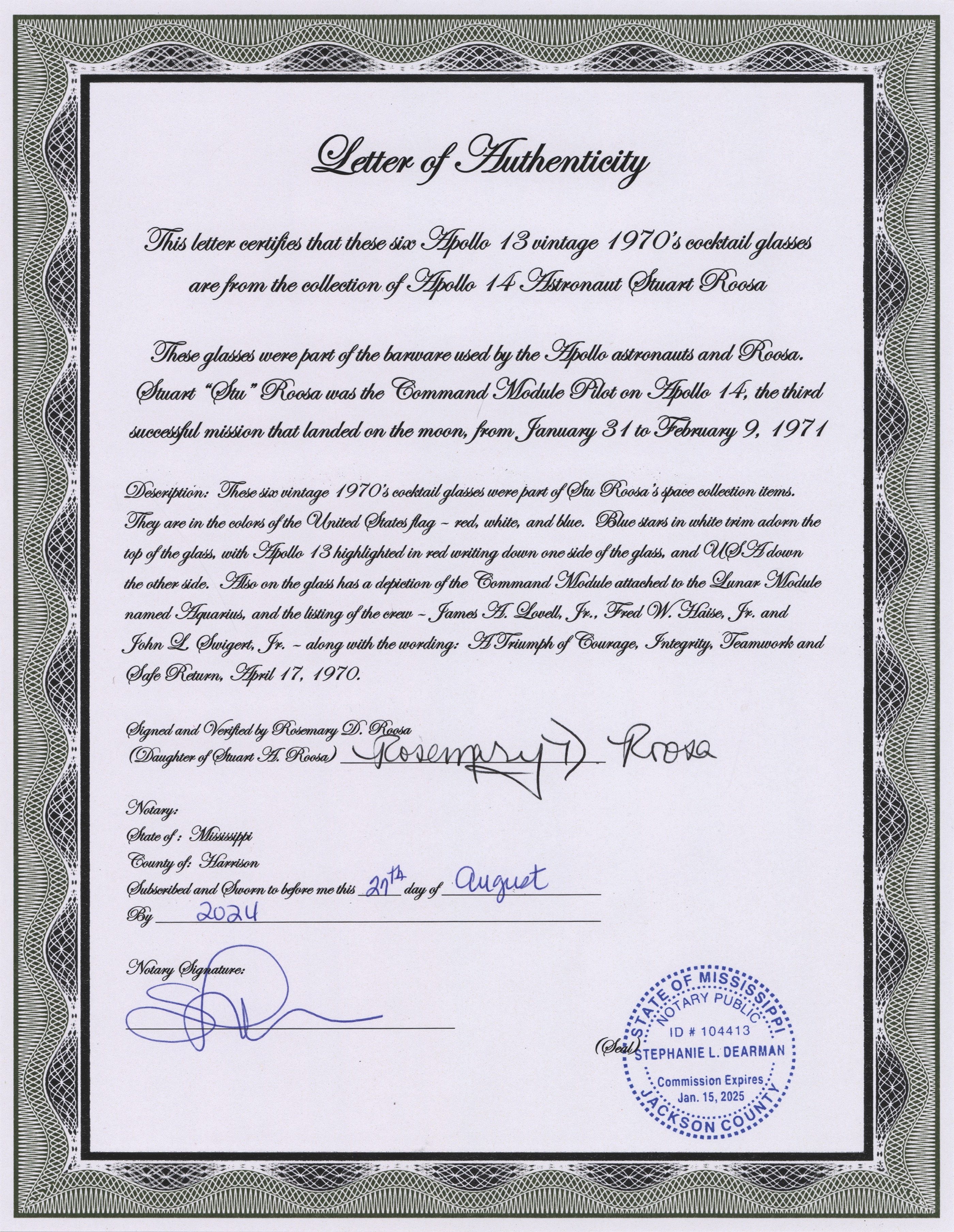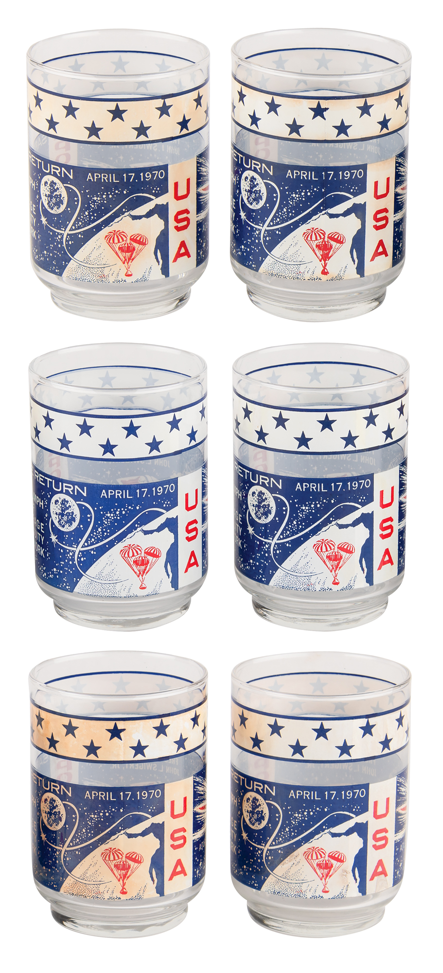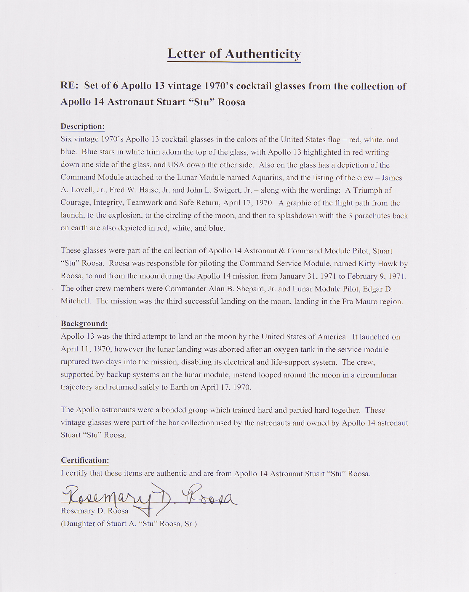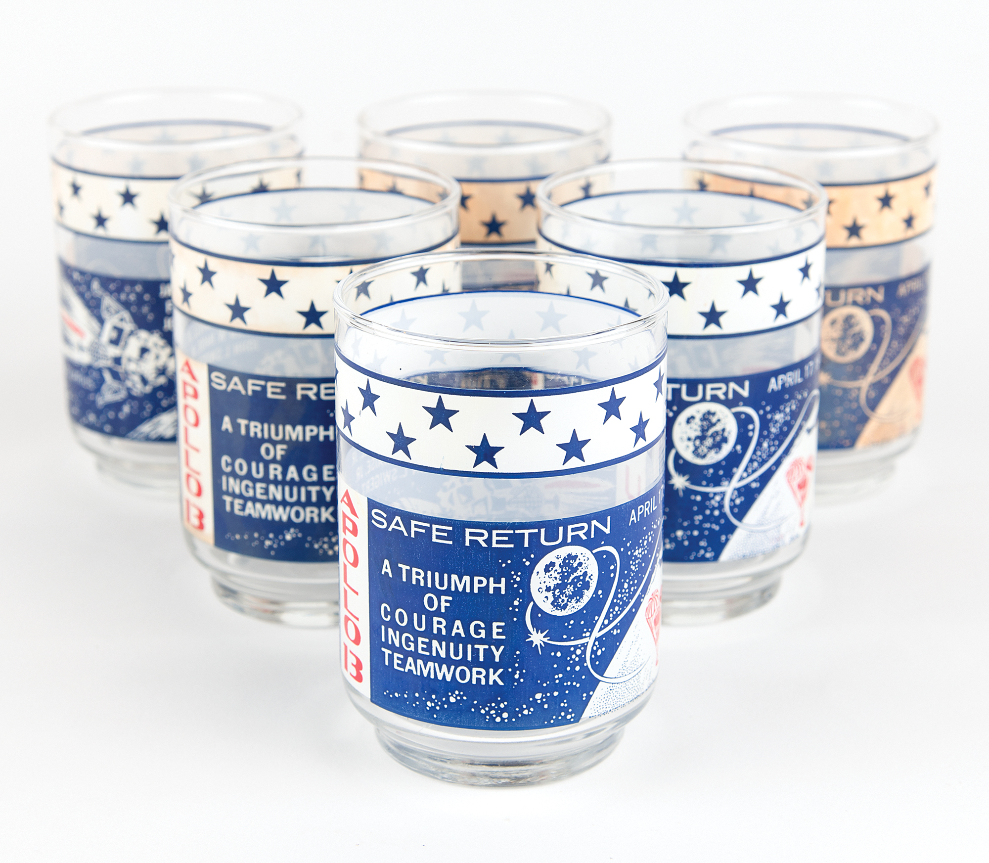 Six vintage 1970s commemorative Apollo 13 cocktail glasses from the collection of Apollo 14 CMP Stuart A. Roosa, each 4˝ in height with a mouth diameter of 2.75˝, with matching patriotic color schemes and designs honoring the Apollo 13 mission, with text reading: “Safe Return: A Triumph of Courage, Ingenuity, Teamwork.” In overall fine condition, with some toning. Accompanied by two letters of authenticity from Rosemary D. Roosa, the daughter of Apollo 14 CMP Stuart A. Roosa.