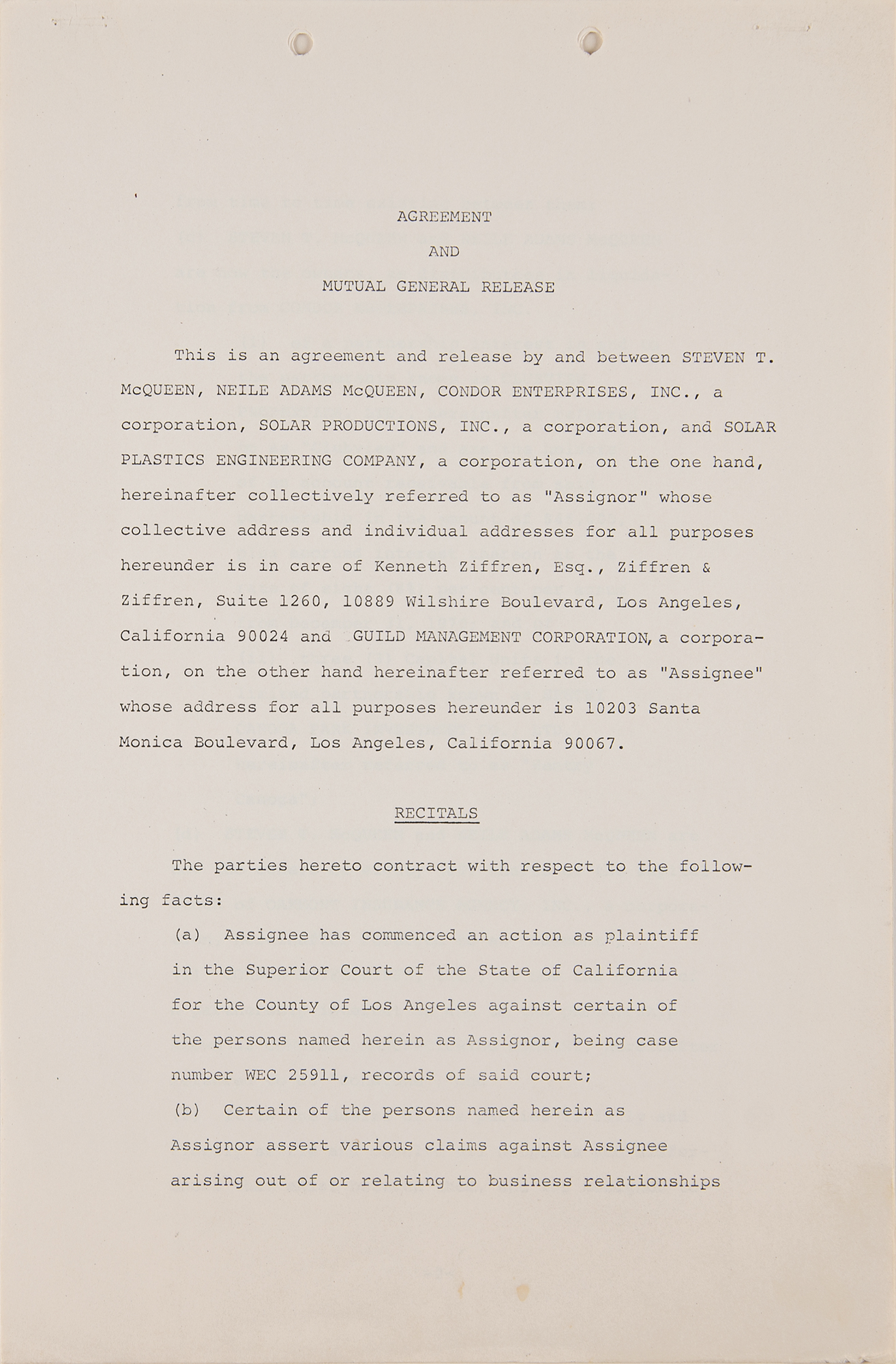 Scarce DS, signed four times as “Steven T. McQueen,” nine pages, 8.5 x 13, June 25, 1973. An agreement and mutual general release between Steve McQueen, Neile Adams, McQueen, Condor Enterprises, Inc., Solar Productions, Inc., and Solar Plastics Engineering Company, on the one hand, and the Guild Management Corporation on the other, with the former party agreeing to sell, assign, transfer, and set-over various rights, titles, interests, and shares to the latter, concerning companies Clubview, Sentry Canoga, Constone, and Oakmont, for the agreed upon sum of $80,000. Signed on the second-to-last page in black felt tip a total of four times by Steve McQueen, and countersigned once by his wife, Neile Adams McQueen. In fine condition. A desirable and rare quadruple-signed document from McQueen, who in 1973 starred opposite Dustin Hoffman in the classic prison-adventure film Papillon, which was written by Dalton Trumbo and Lorenzo Semple, Jr.
