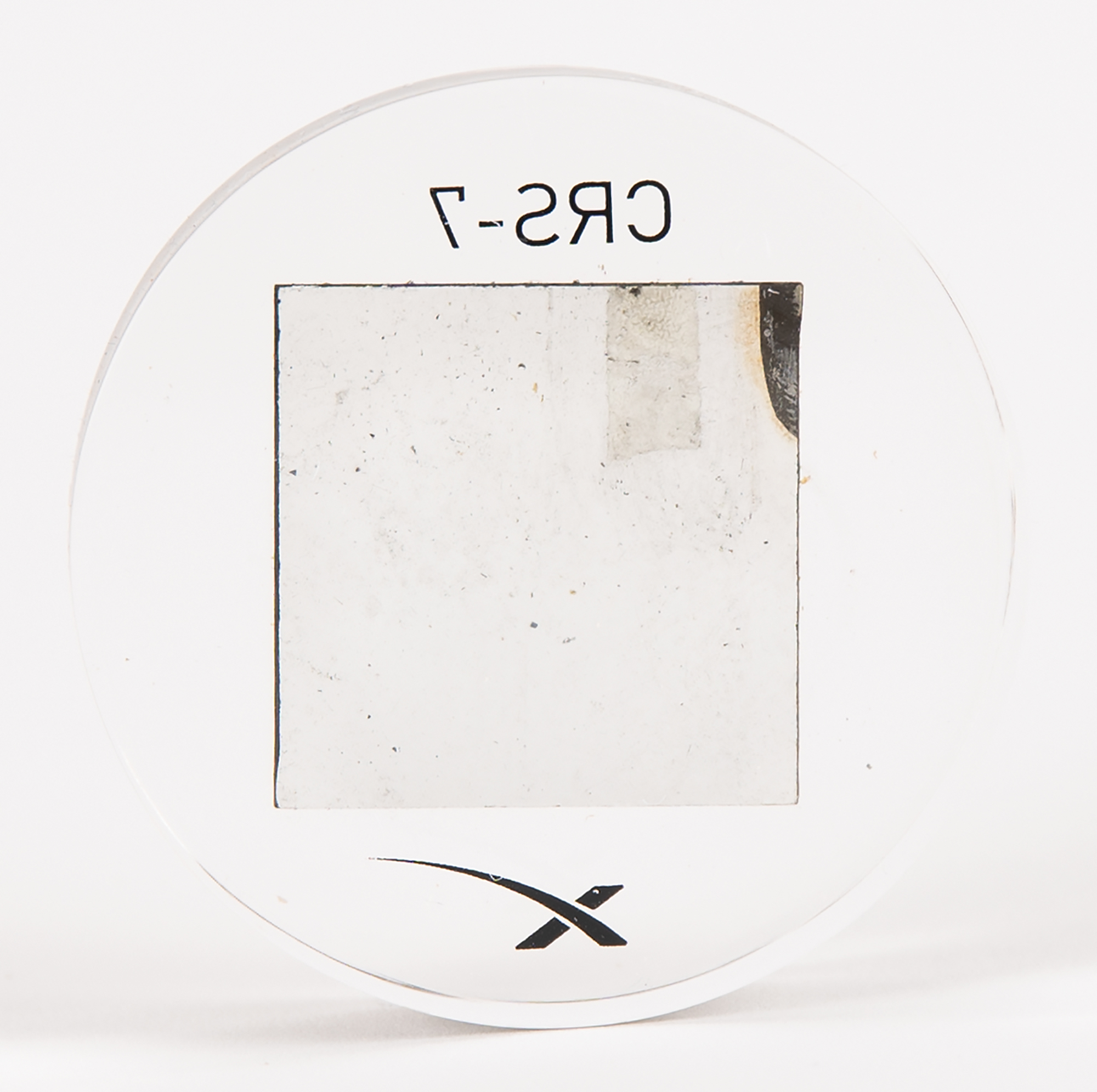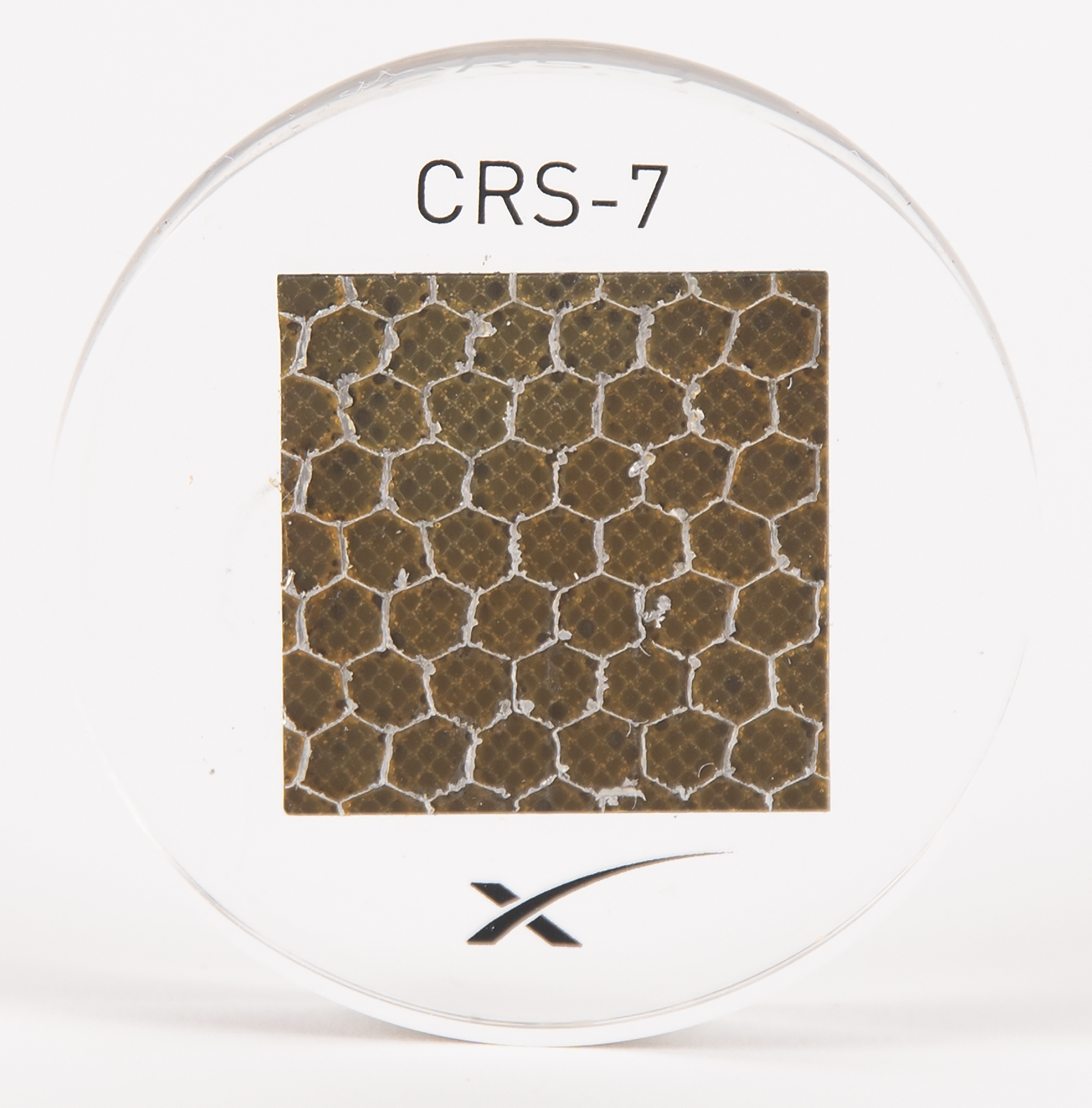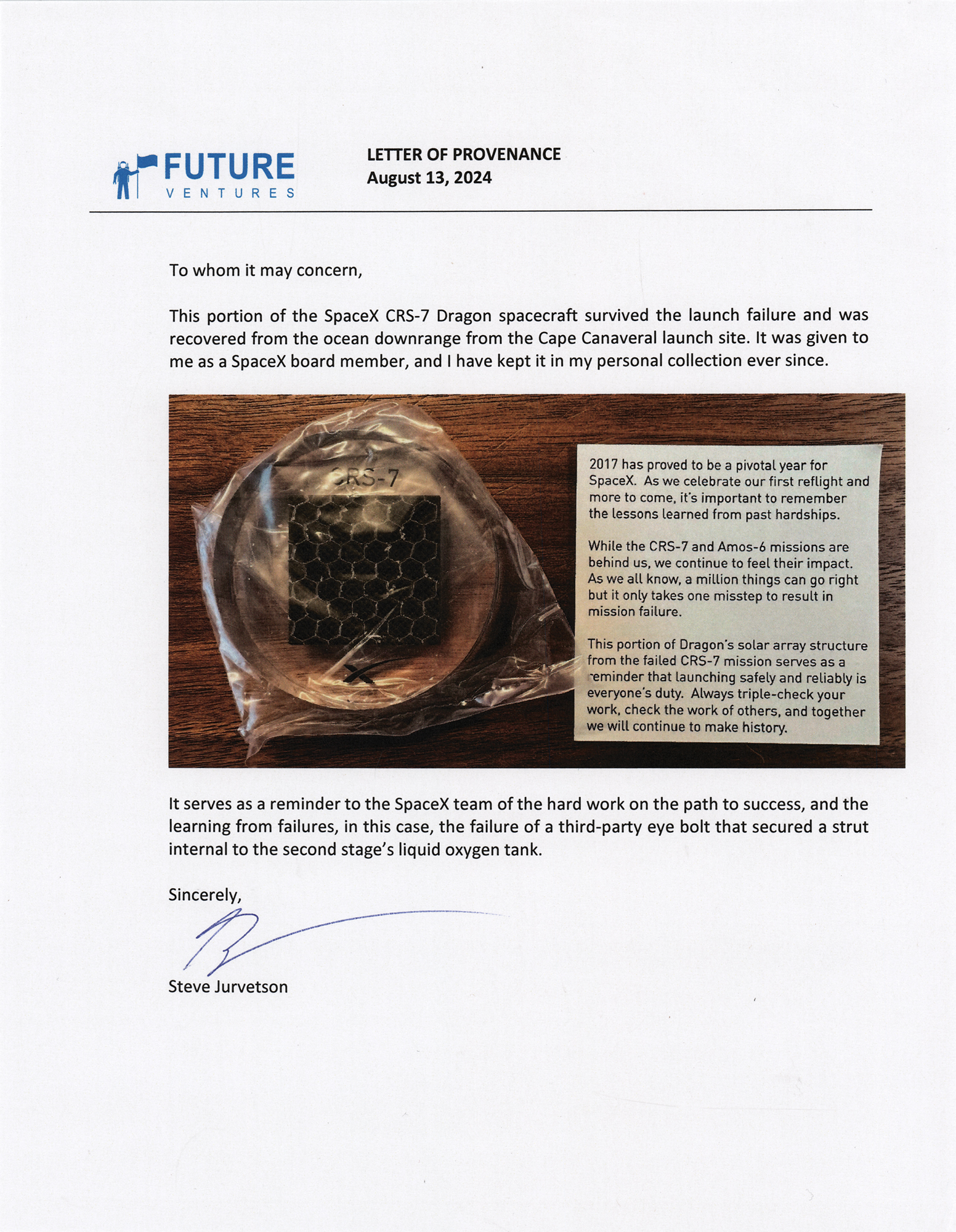 Flown segment of the Dragon's solar array structure recovered after the failed CRS-7 mission on June 28, 2015, measuring 1.25? x 1.25?, encased 2.25? Lucite marked with the SpaceX logo and "CRS-7." In very fine condition. These presentations were prepared for SpaceX engineers and employees as a reminder that launching safely and reliably is everyone's duty, and that work should be triple-checked for quality control. Accompanied by a letter of provenance from SpaceX board member Steve Jurvetson, noting that the piece testifies to "the hard work on the path to success, and the learning from failures, in this case, the failure of a third-party eye bolt that secured a strut internal to the second stage's liquid oxygen tank."