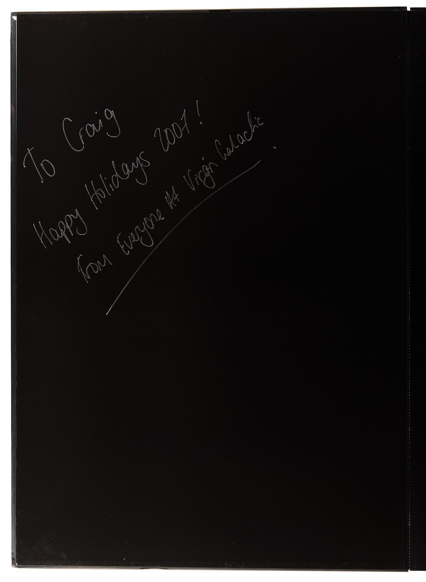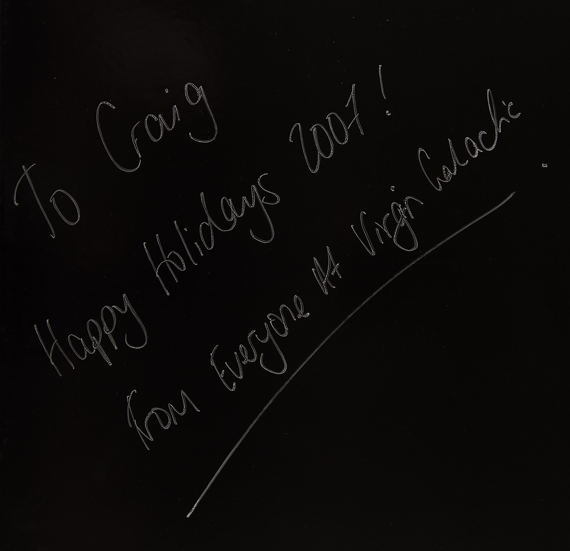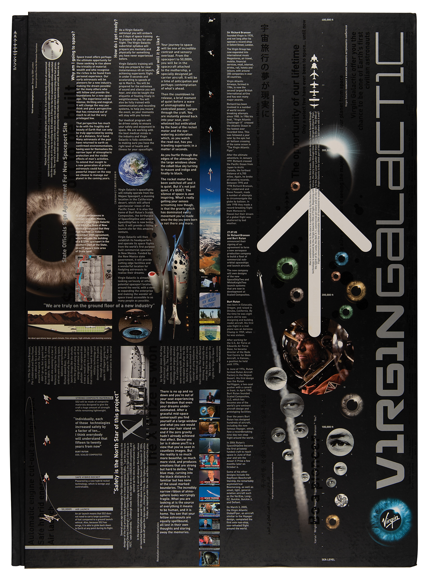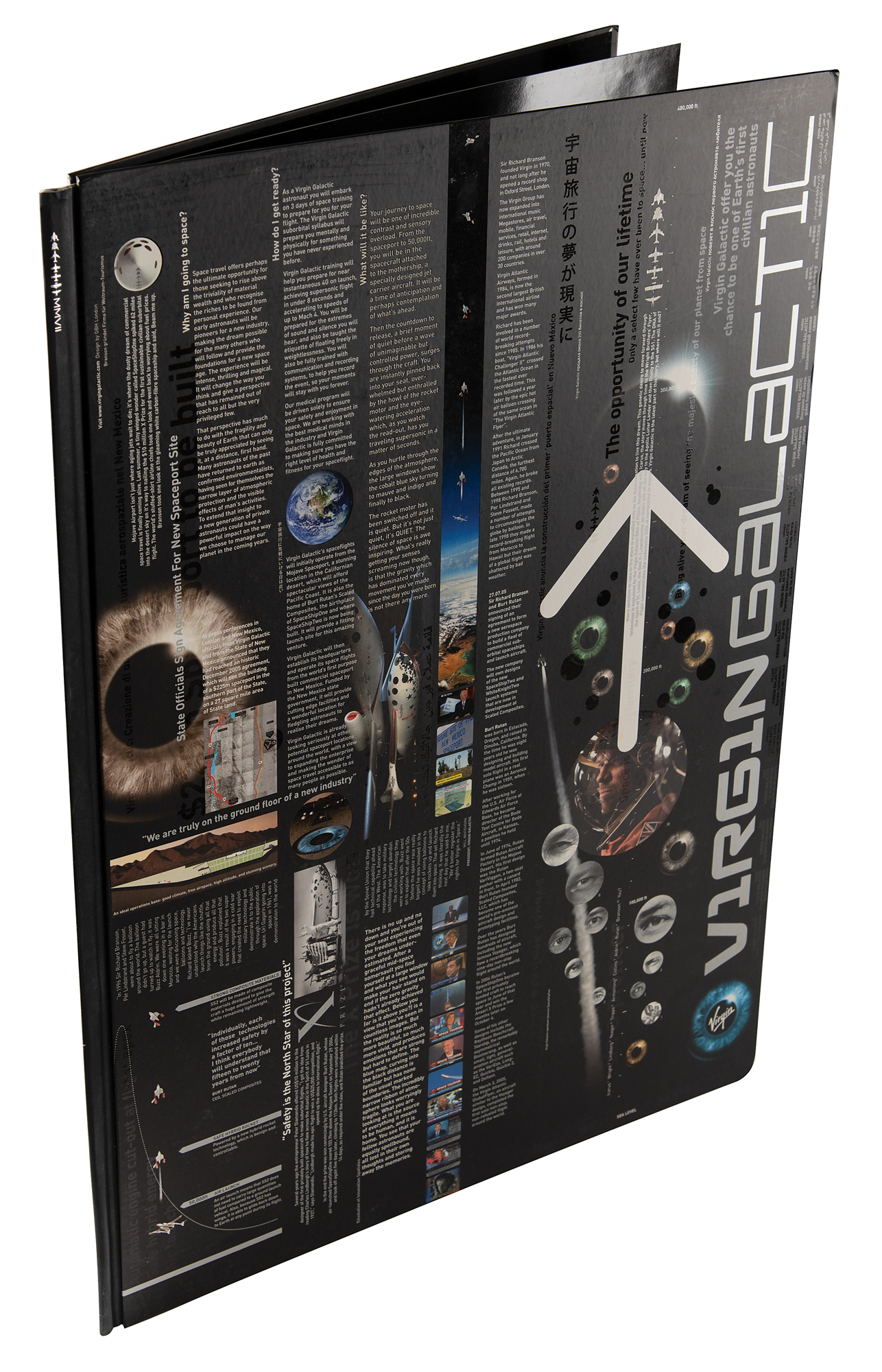 Enormous oversized Virgin Galactic photobook designed and produced by GBH London in 2007, bound in busy pictorial hardcovers, 24.5 x 33.5, containing 14 pages with massive full-spread images from a Virgin Galactic flight. In fine condition, with a presentation inscription inside the front cover.