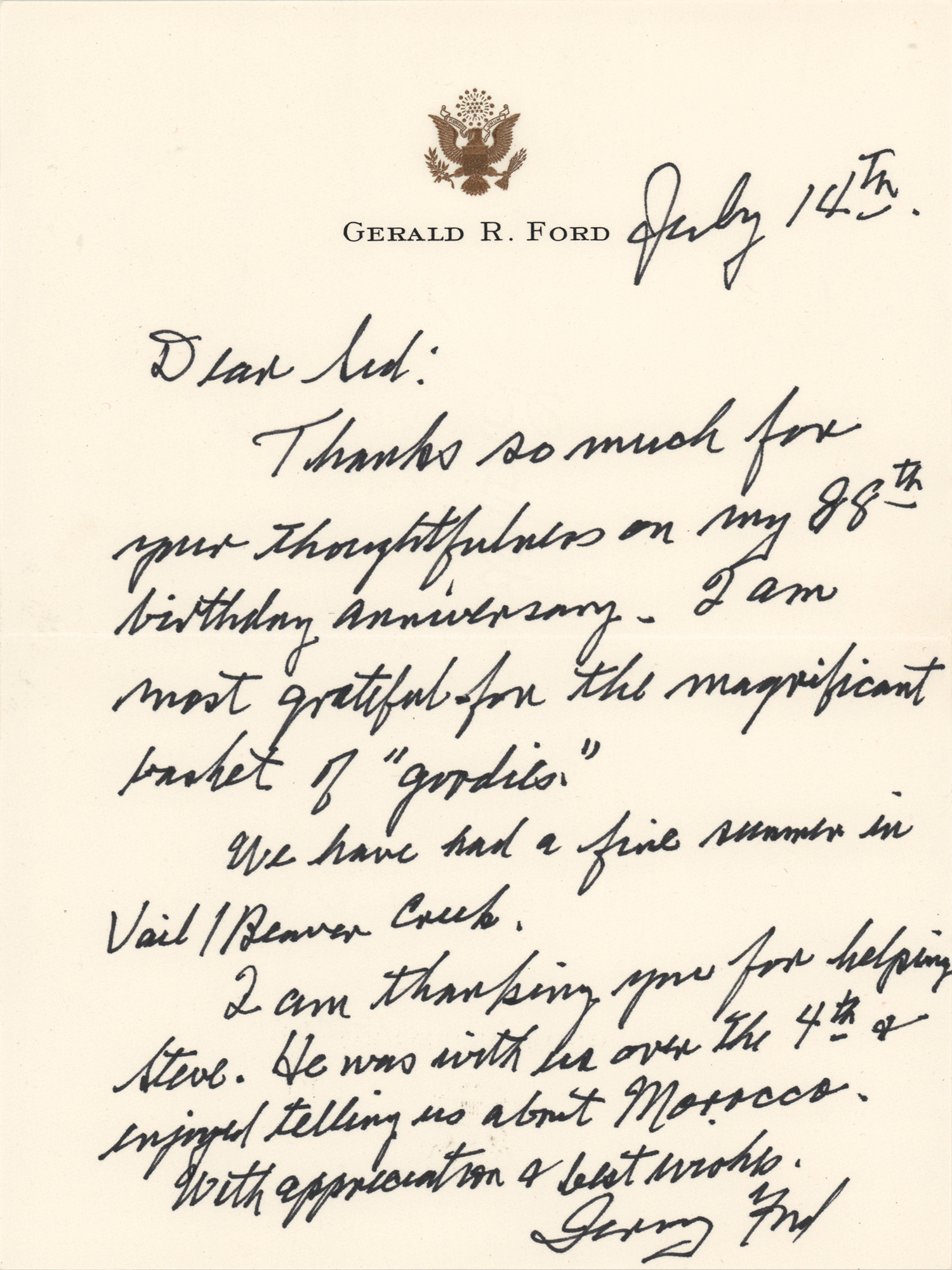 ALS signed “Jerry Ford,” one page, 6.25 x 8.5, personal letterhead, July 14 [2001]. Handwritten letter to Sid Craig, who had been managing his son, actor Steven Ford. In full: “Thanks so much for your thoughtfulness on my 88th birthday anniversary. I am most grateful for the magnificent basket of ‘goodies.’ We have had a fine summer in Vail / Beaver Creek. I am thanking you for helping Steve. He was with us over the 4th & enjoyed telling us about Morocco. With appreciation and best wishes.” In very fine condition. Accompanied by the original mailing envelope bearing his pre-printed free frank.