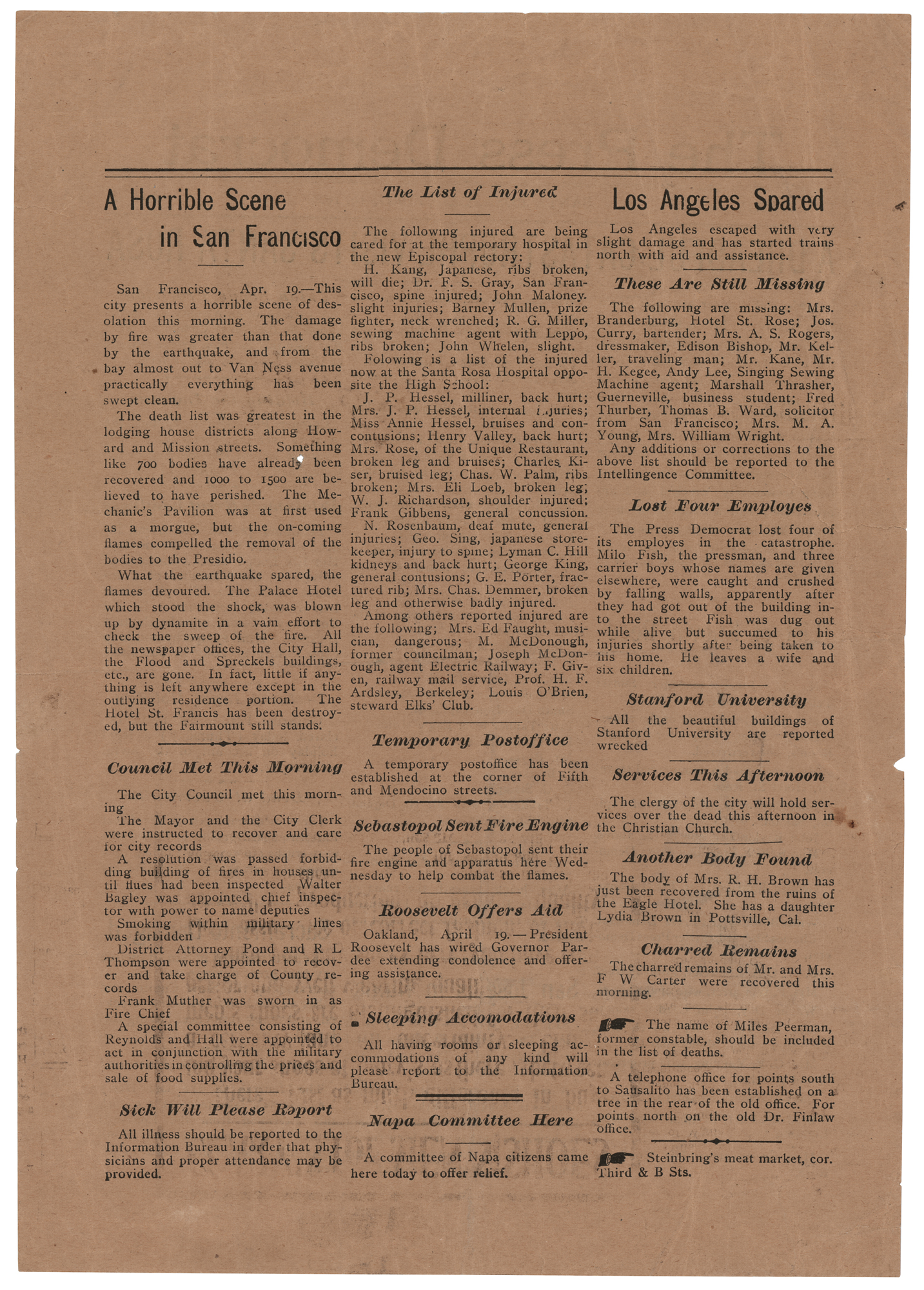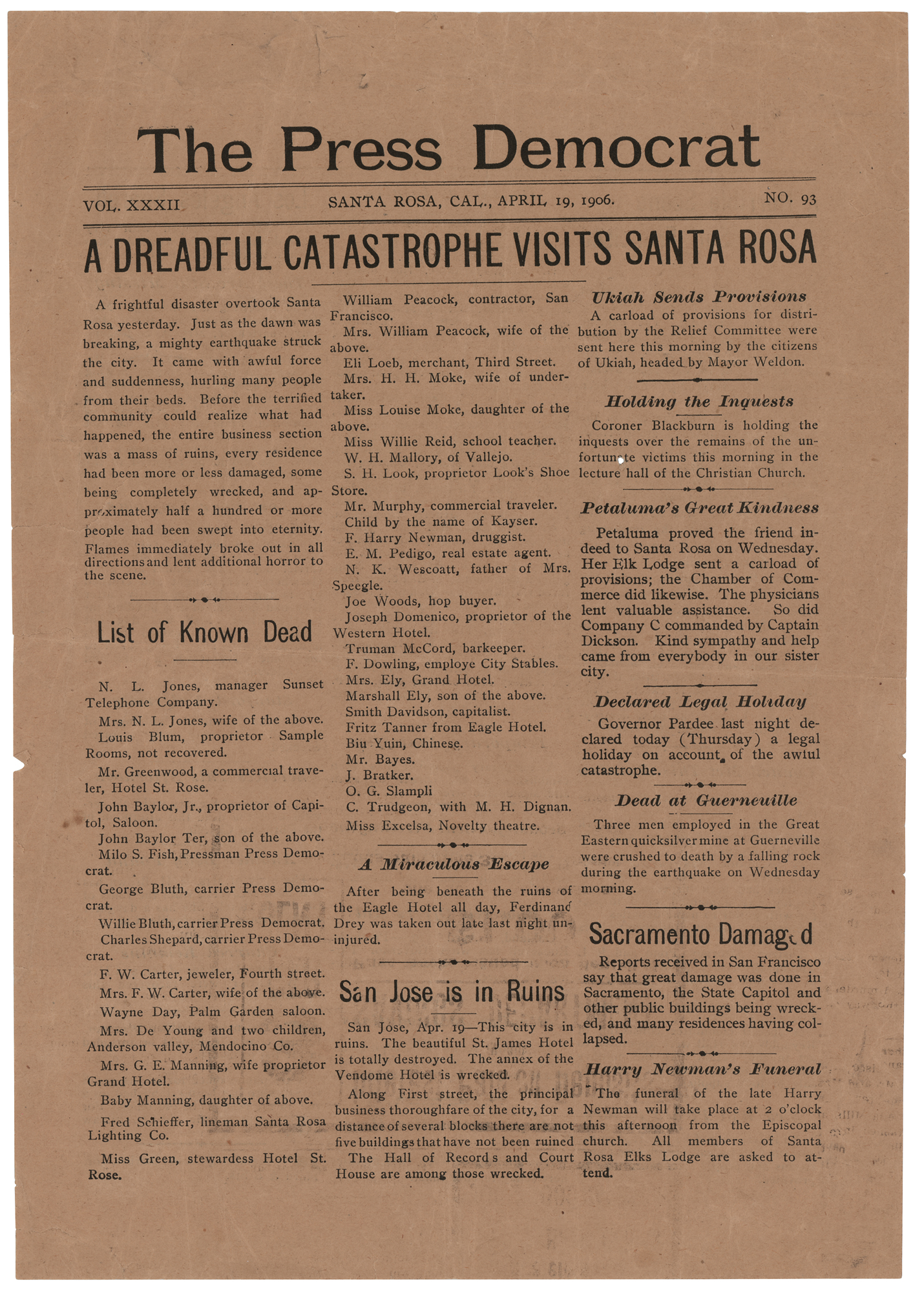 Original broadside from The Press Democrat (Santa Rosa, California), one page both sides, 8 x 11.5, issued as No. 93 on April 19, 1906, the day after a 7.9 earthquake claimed over 3,000 lives in the San Francisco area on April 18, 1906. The broadside provides up-to-date information on the earthquake, the resulting destruction, injuries and deaths, and efforts to help survivors. Headings and subheadings include: “A Dreadful Catastrophe Visits Santa Rosa,” “San Jose is in Ruins,” “Sacramento Damaged,” “A Horrible Scene in San Francisco,” “Los Angeles Spared,” “Roosevelt Offers Aid,” “Charred Remains,” and more. In very good to fine condition, with light creasing and short edge tears. While San Francisco suffered the heaviest damage, surrounding, less publicized areas such as Santa Rosa with 64 known deaths also suffered a heavy toll.