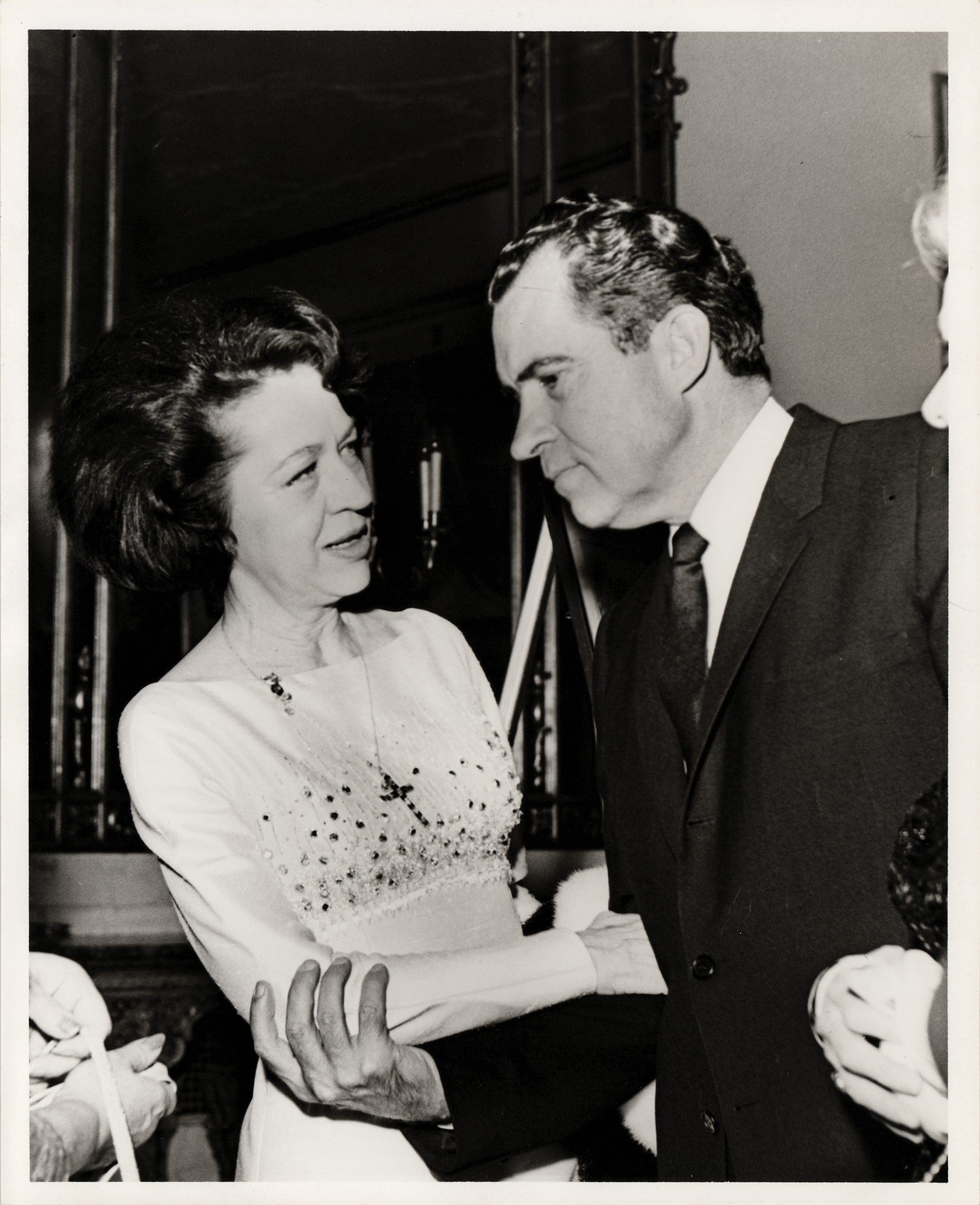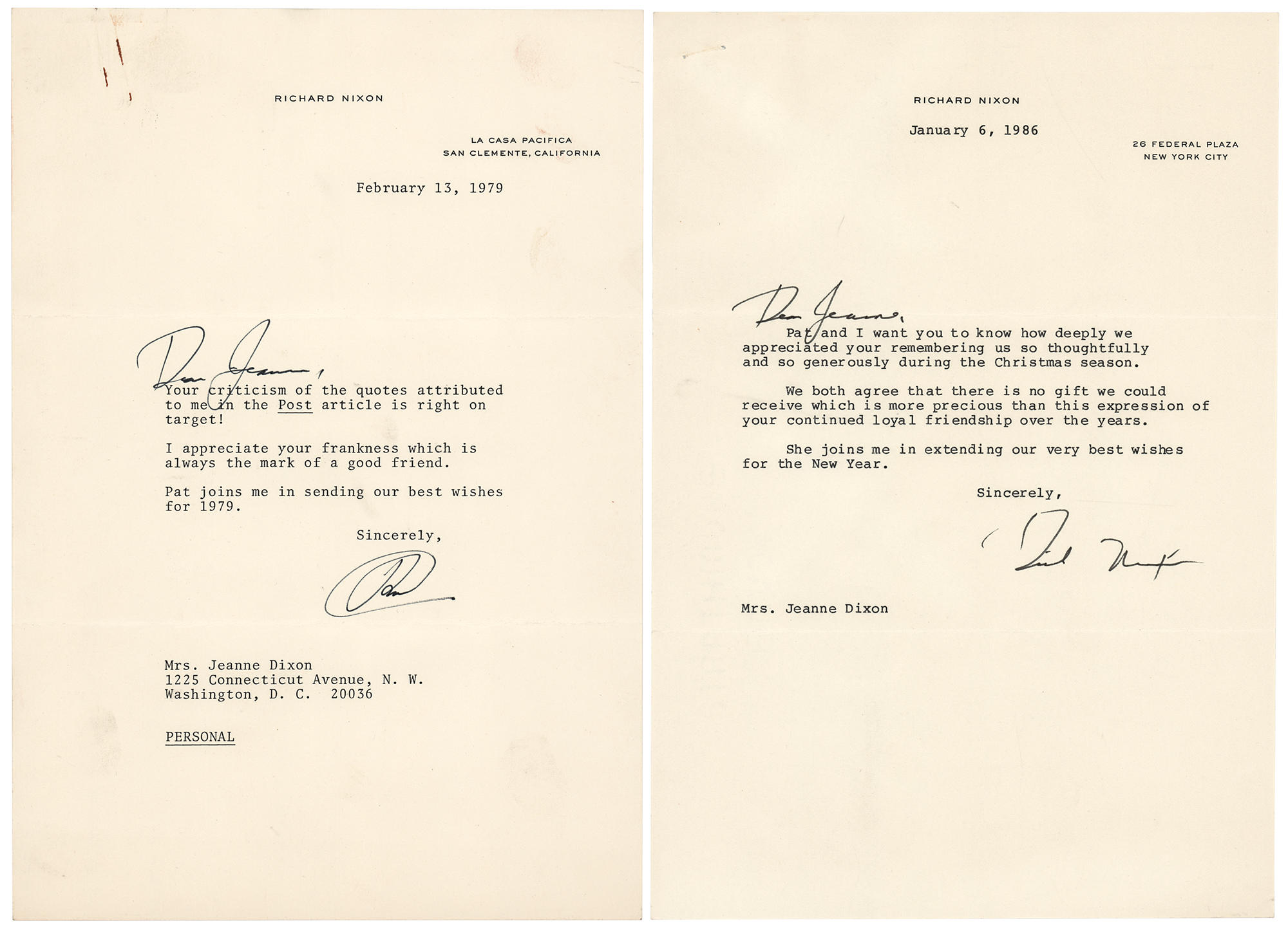 Two TLSs from Richard Nixon, one signed “RN” and the other signed “Dick Nixon,” both one page, 7.25 x 10.5, personal letterhead, both addressed to famed psychic and astrologer Jeanne Dixon. The earlier letter, dated January 6, 1986, in part: “Pat and I want you to know how deeply we appreciated your remembering us so thoughtfully and so generously during the Christmas season. We both agree that there is no gift we could receive which is more precious than this expression of your continued loyal friendship over the years.” The second letter, from February 13, 1979, in full: “Your criticisms of the quotes attributed to me in the Post article is right on target! I appreciated your frankness which is always the mark of a good friend. Pat joins me in sending our best wishes for 1979.” Nixon adds handwritten salutations to both letters. In overall fine condition, with a rusty paperclip impression to the top edge of the later letter. Accompanied by the original mailing envelopes (one bearing a printed free frank) and a glossy 8 x 10 photo of Nixon and Dixon conversing with each other at an event.