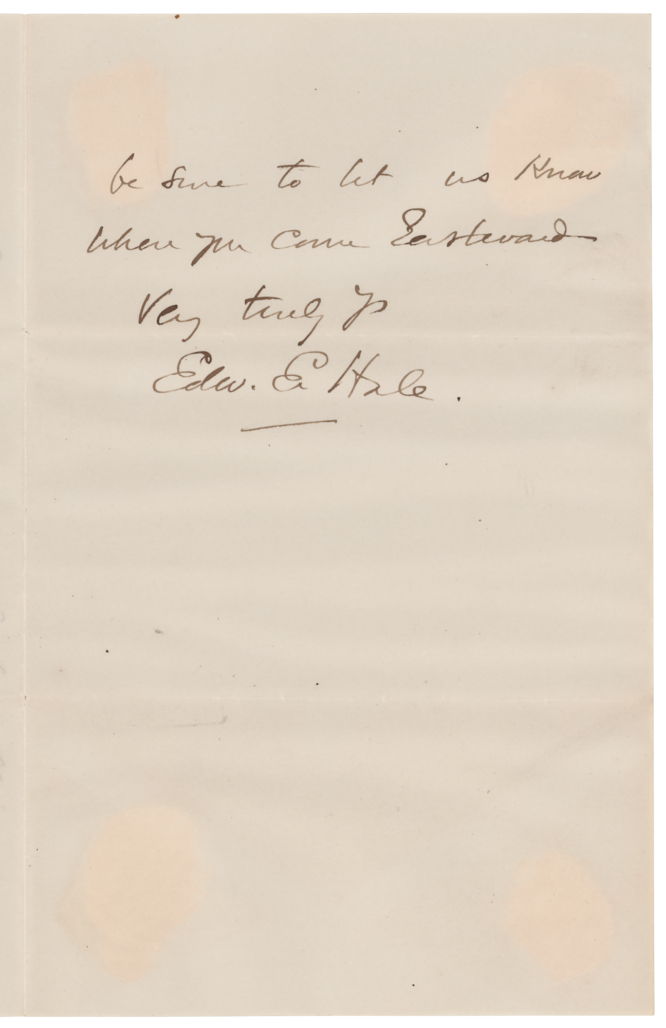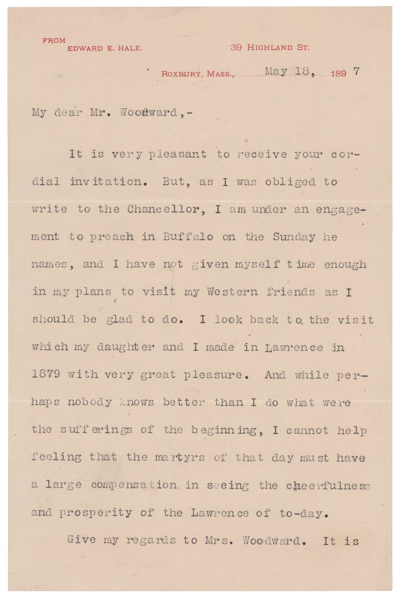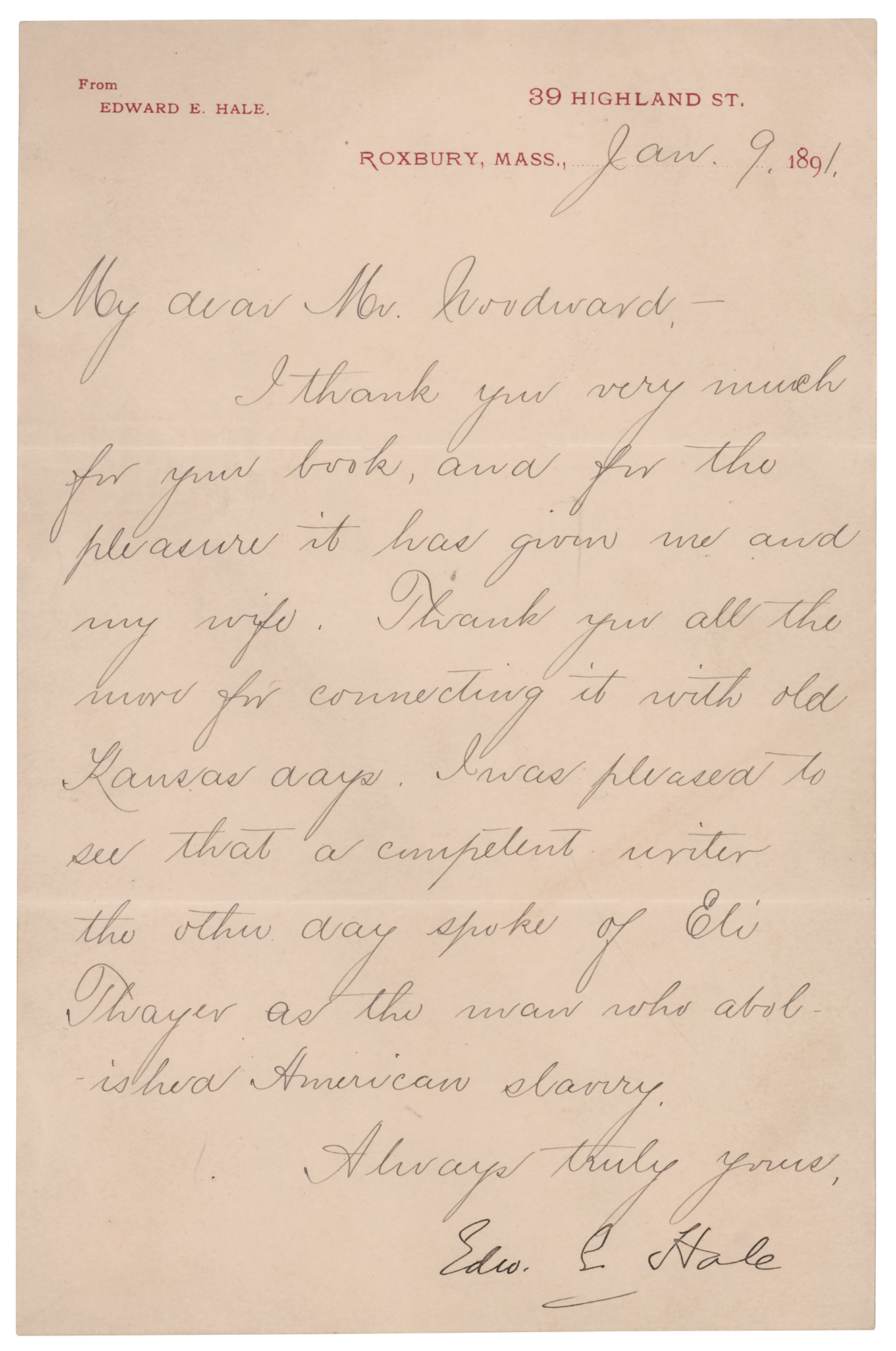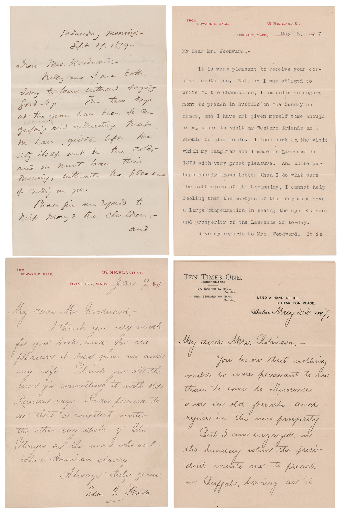 American author and Unitarian clergyman (1822–1909) remembered for his short story 'The Man Without a Country.' Four letters from Edward Everett Hale, each signed “Edw. E. Hale,” consisting of two ALSs, an LS, and a TLS, eight total pages, each approximately 5.25 x 8, dating from 1879 to 1897. Two letters are addressed to Kansas ‘free-state’ militiaman and author Brinton W. Woodward, and two letters are to Woodward’s wife. Highlighted samples include: “Thank you very much for your book…all the more for connecting it with old Kansas days. I was pleased to see that a competent writer the other day spoke of Eli Thayer as the man who abolished American slavery”; and “I look back to the visit which my daughter and I made in Lawrence in 1879 with very great pleasure. And while perhaps nobody knows better than I do what were the sufferings of the beginning, I cannot help feeling that the martyrs of that day must have a large compensation in seeing the cheerfulness and prosperity of the Lawrence of to-day.” In overall fine condition, with some signature blotting to the later letter, and light rippling to the earliest one. Accompanied by two original mailing envelopes, one hand-addressed by Hale, who adds his signature to the lower left, “E. E. Hale.”