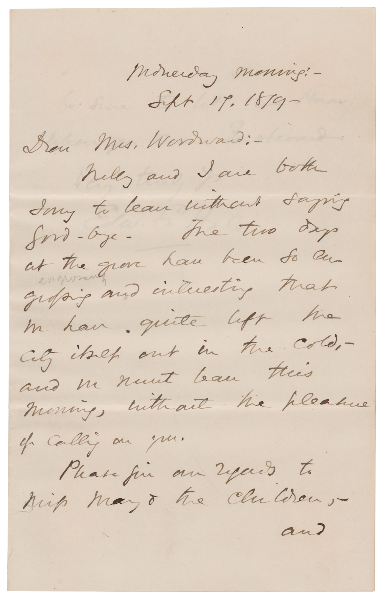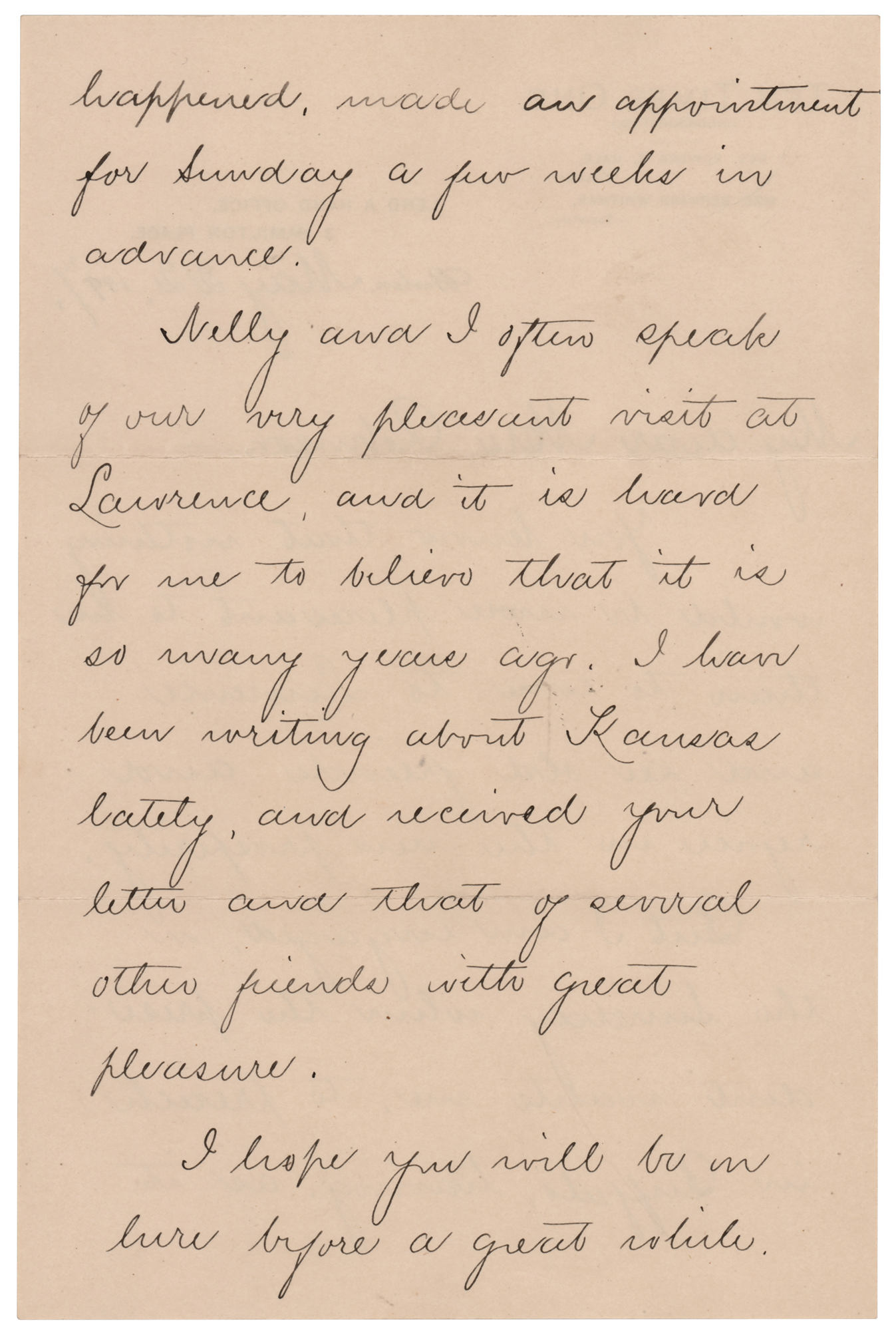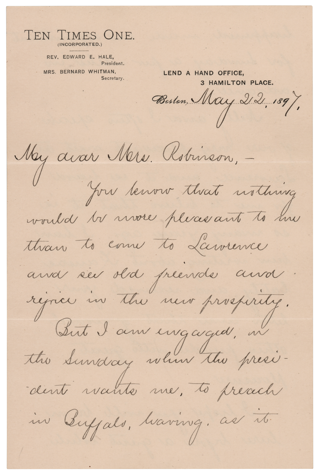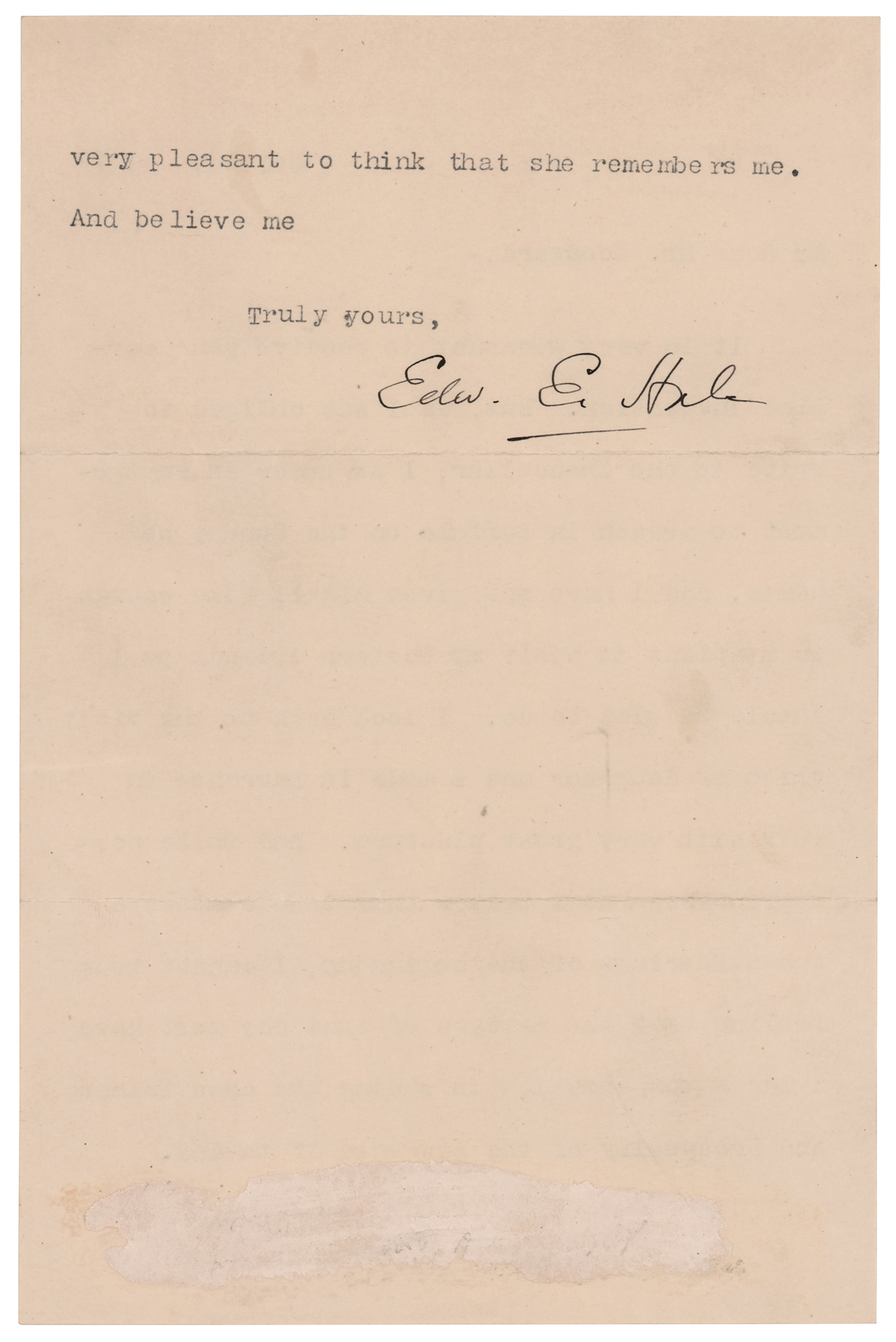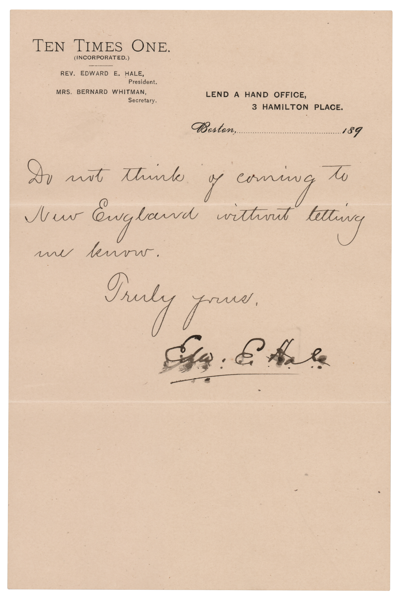 American author and Unitarian clergyman (1822–1909) remembered for his short story 'The Man Without a Country.' Four letters from Edward Everett Hale, each signed “Edw. E. Hale,” consisting of two ALSs, an LS, and a TLS, eight total pages, each approximately 5.25 x 8, dating from 1879 to 1897. Two letters are addressed to Kansas ‘free-state’ militiaman and author Brinton W. Woodward, and two letters are to Woodward’s wife. Highlighted samples include: “Thank you very much for your book…all the more for connecting it with old Kansas days. I was pleased to see that a competent writer the other day spoke of Eli Thayer as the man who abolished American slavery”; and “I look back to the visit which my daughter and I made in Lawrence in 1879 with very great pleasure. And while perhaps nobody knows better than I do what were the sufferings of the beginning, I cannot help feeling that the martyrs of that day must have a large compensation in seeing the cheerfulness and prosperity of the Lawrence of to-day.” In overall fine condition, with some signature blotting to the later letter, and light rippling to the earliest one. Accompanied by two original mailing envelopes, one hand-addressed by Hale, who adds his signature to the lower left, “E. E. Hale.”