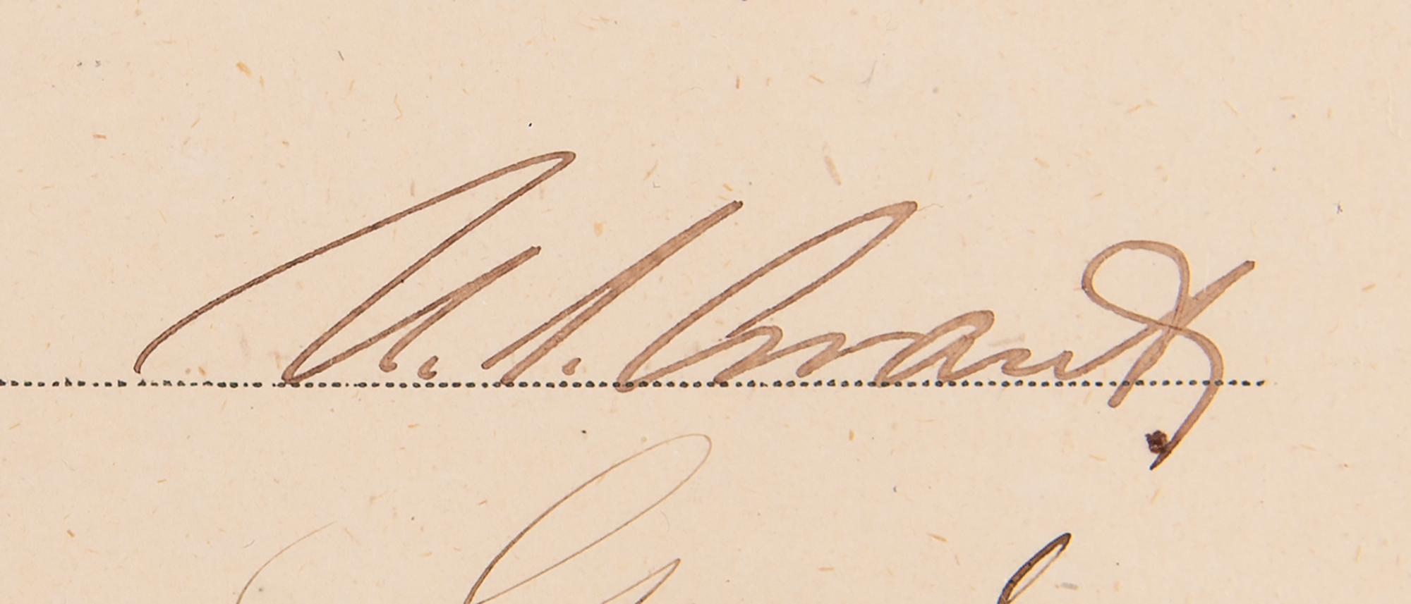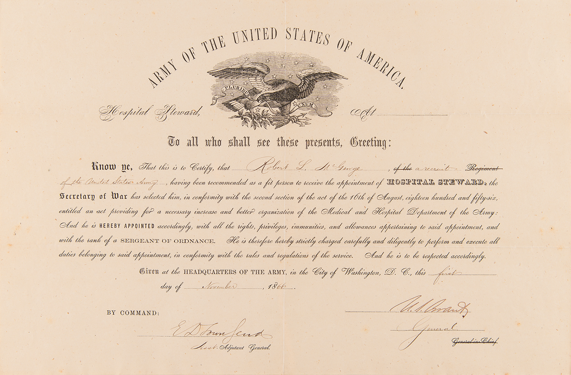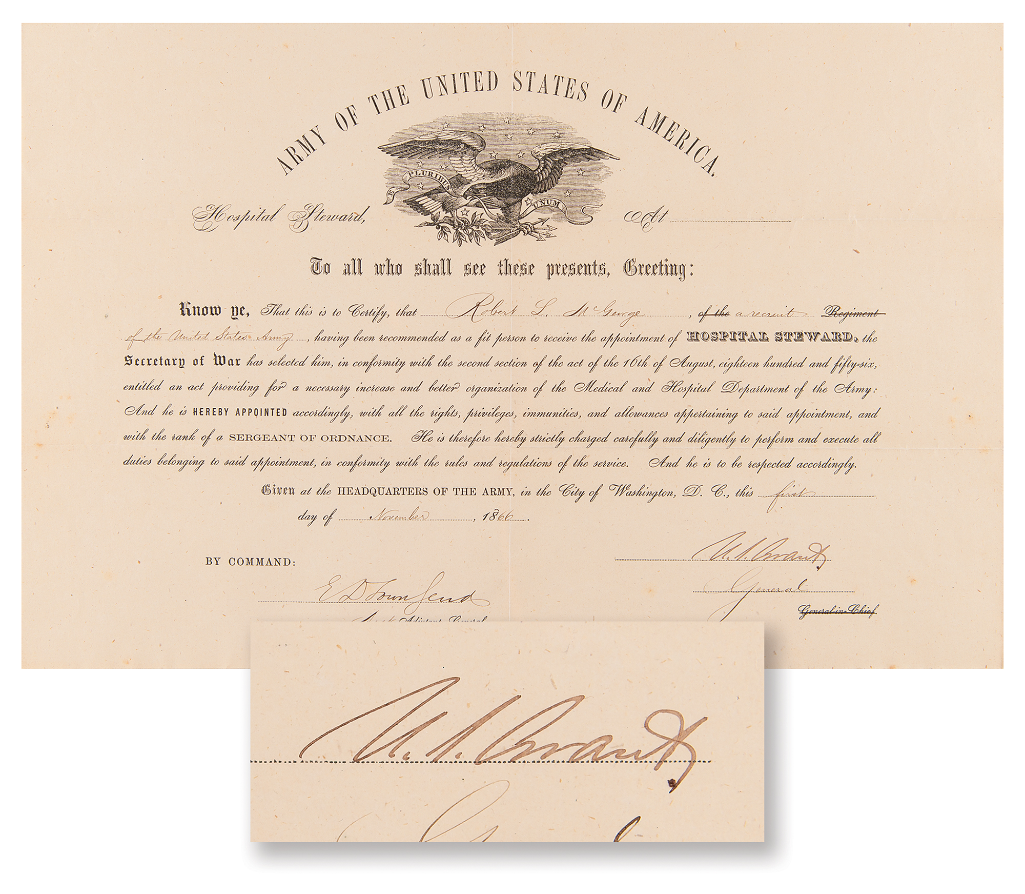 Rare partly-printed DS, one page, 15.75 x 10.25, November 1, 1866. Official ‘Army of the United States of America’ military commission issued to Robert L. McGeorge, “a recruit of the United States Army,” which appoints him as a “Hospital Steward.” Signed at the conclusion by U. S. Grant as Commanding General of the U. S. Army, and countersigned by Edward D. Townsend as Assistant Adjutant General. In fine, folded condition. A rare and attractive postwar document that dates shortly after Congress promoted Grant to the newly created rank of General of the Army of the United States on July 25, 1866.