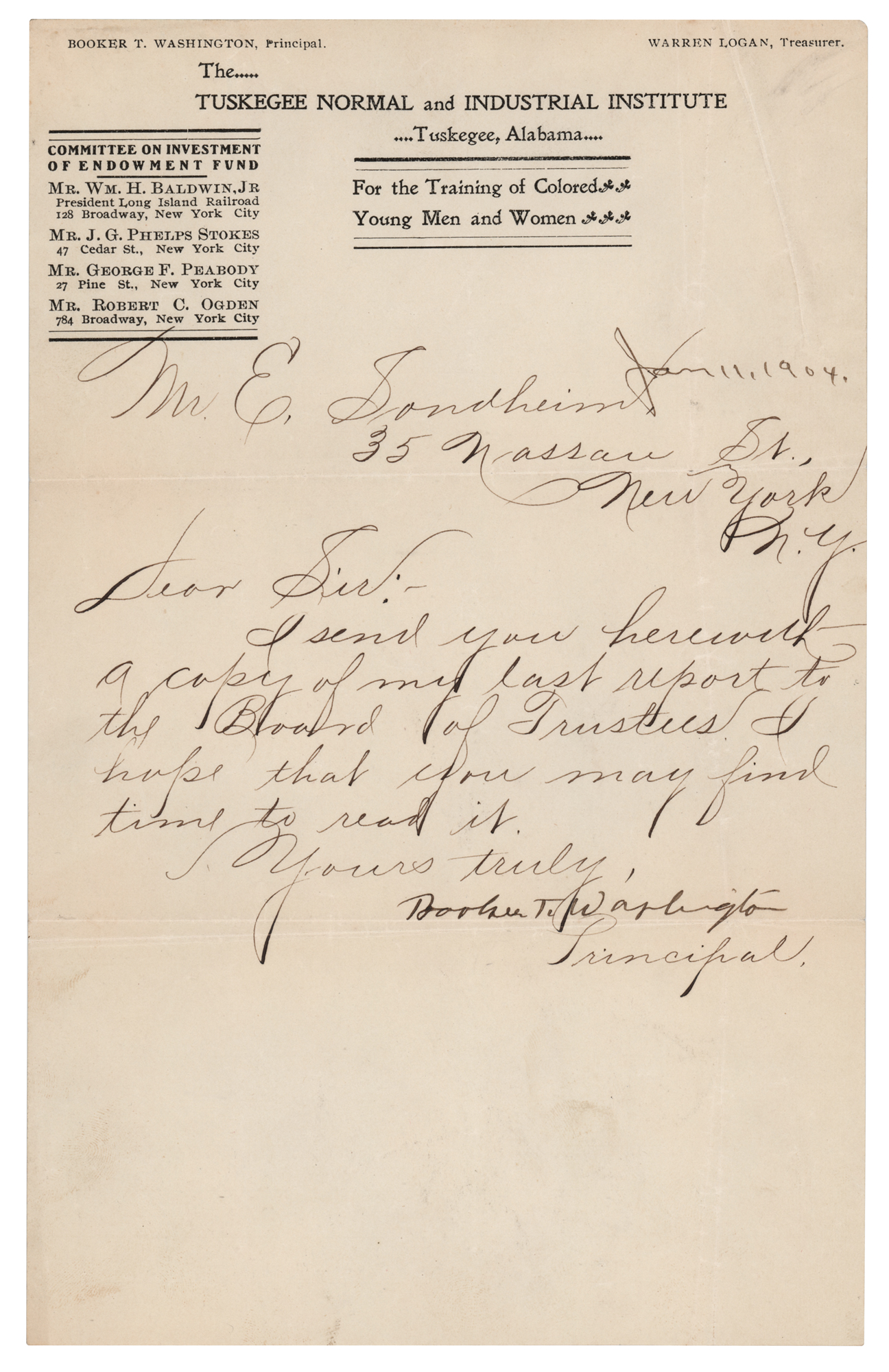 LS, one page, 6 x 9.5, Tuskegee Normal & Industrial Institute letterhead, January 11, 1904. Letter to E. Dondheim of New York, in full: “I send you herewith a copy of my last report to the Board of Trustees. I hope that you may find time to read it.” In fine condition.