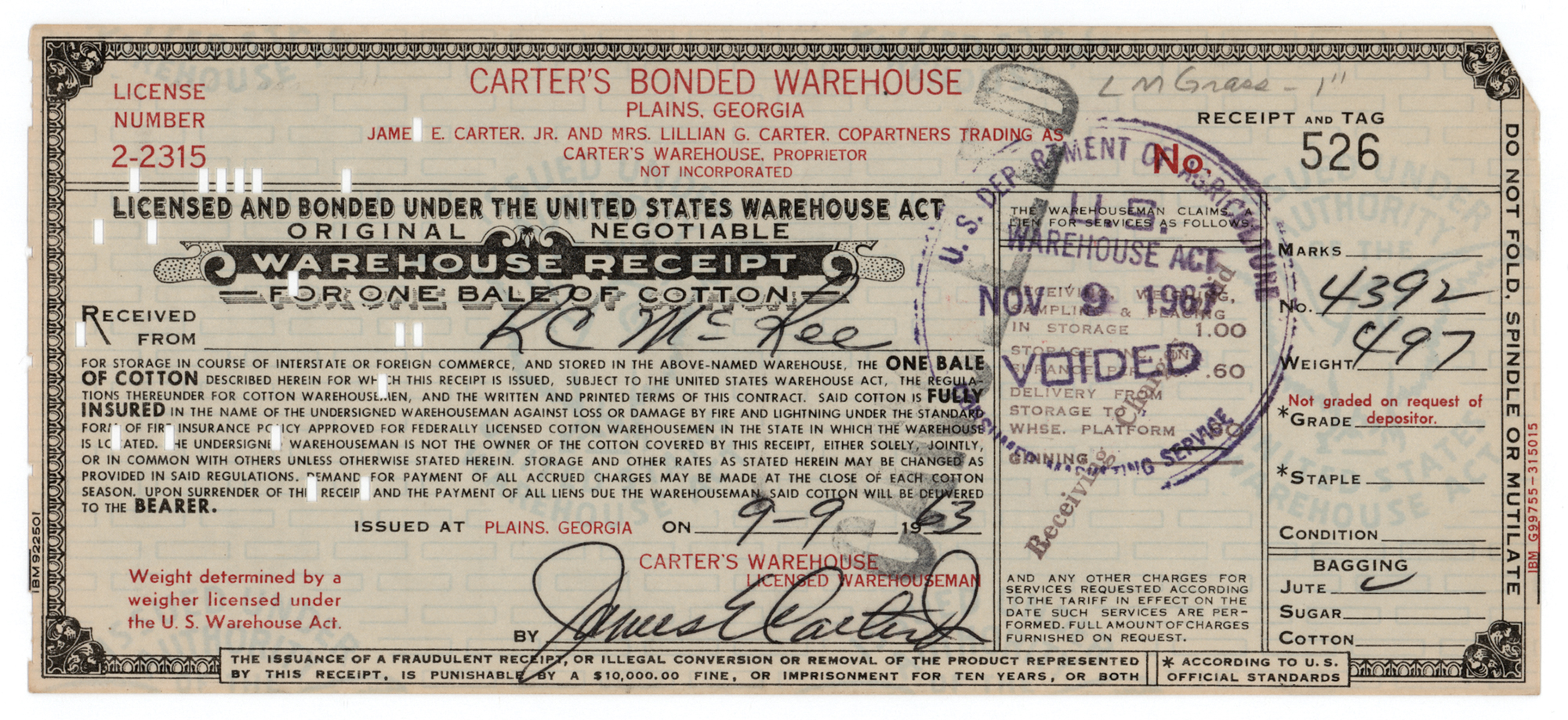 Partly-printed DS, signed “James E. Carter, Jr.,” one page, 7.25 x 3.25, September 9, 1963. Receipt from Carter's Bonded Warehouse for "one bale of cotton received from R. C. McRee for storage in course of interstate or foreign commerce," designating it as number 4392 with a weight of 497 pounds. Signed at the conclusion in blue ballpoint by Carter. In fine condition.