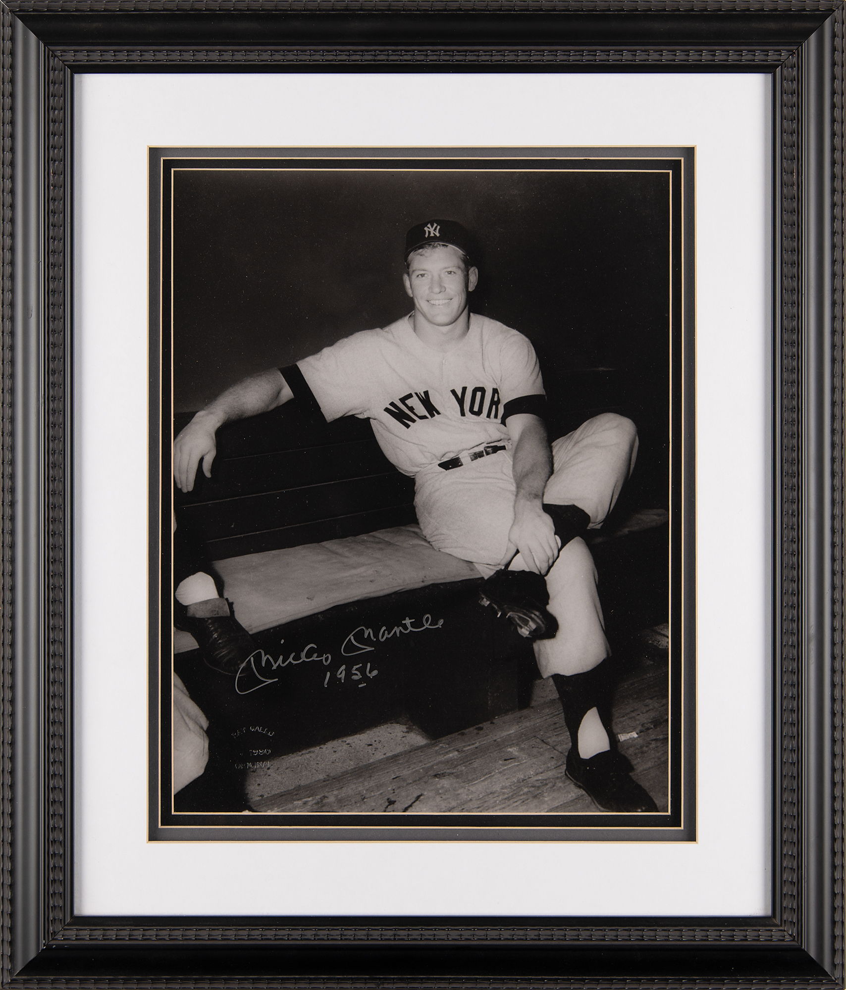 Outstanding satin-finish 10.25 x 13.25 photo of Mantle relaxing in the dugout taken by Ray Gallo in 1956, signed in silver ink, "Mickey Mantle, 1956." Gallo's embossed seal is present in the lower left corner. Nicely triple-matted and framed to an overall size of 17.75 x 20.75. In very fine condition.