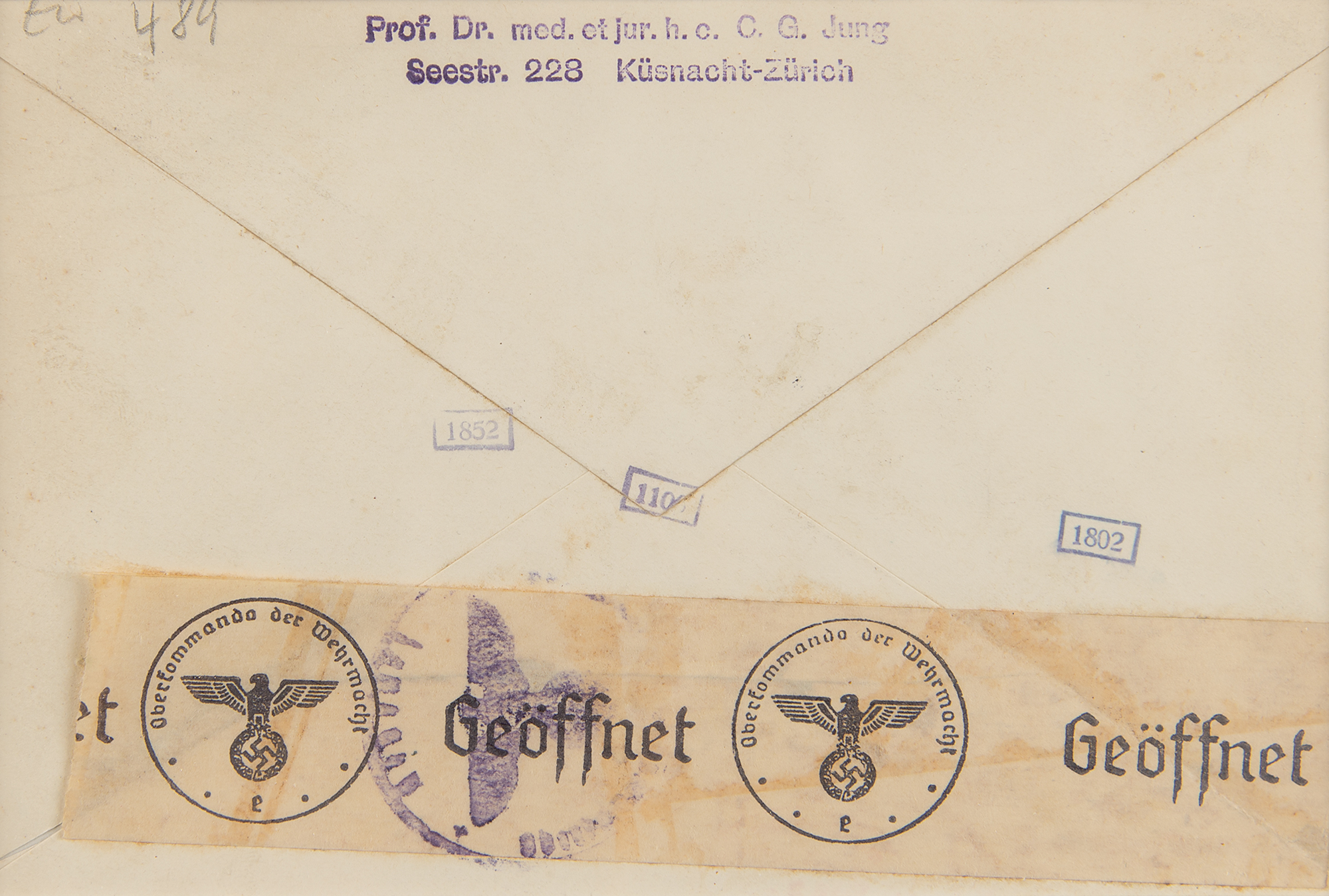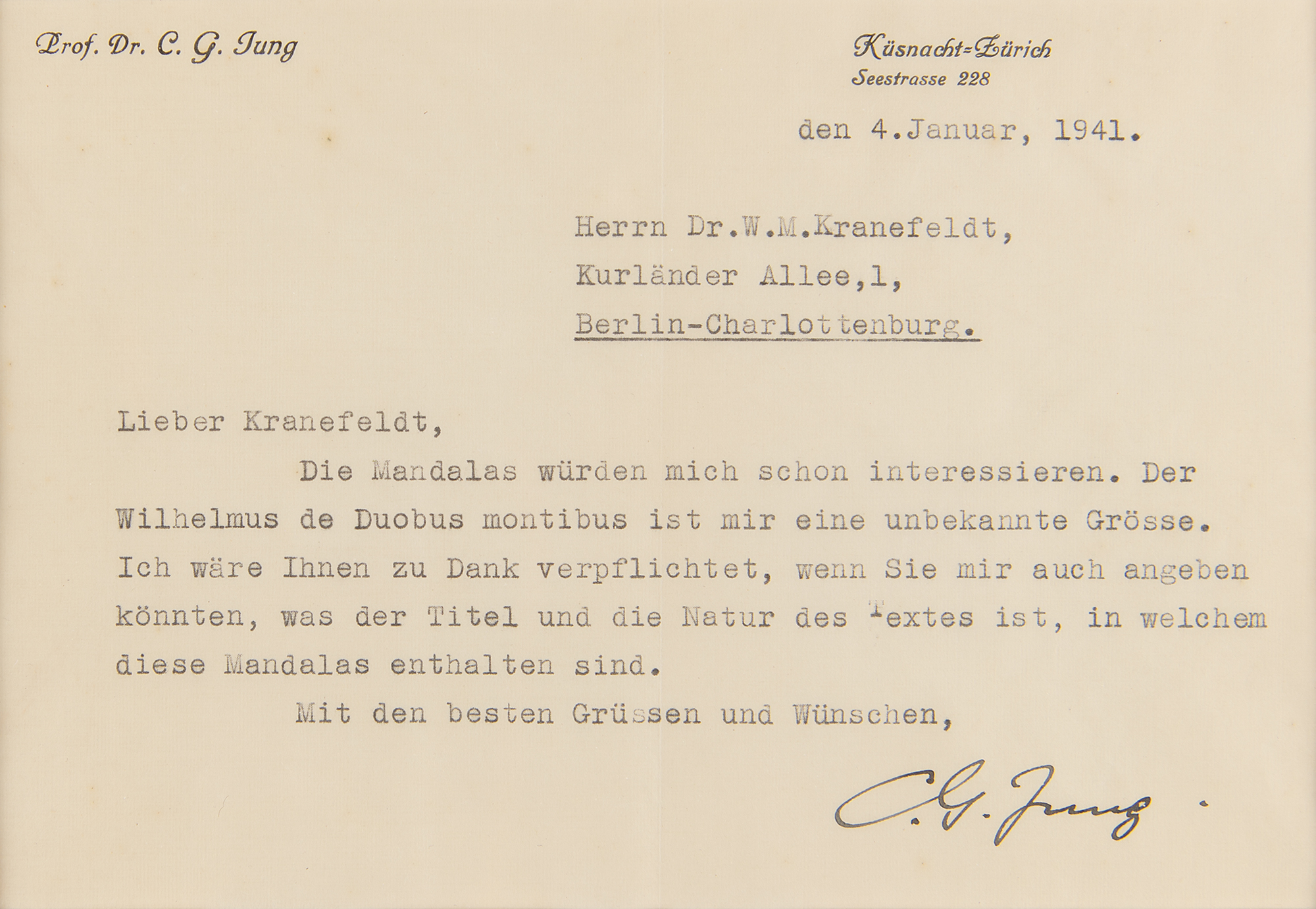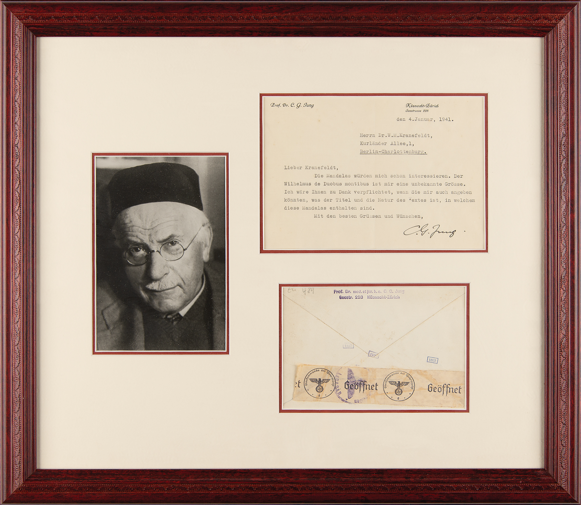 World War II-dated TLS in German, signed “C. G. Jung,” one page, 7.25 x 5, January 4, 1941. Letter to Wolfgang Müller Kranefeldt, in full (translated): “I would be interested in the mandalas. Wilhelmus de Duobus montibus is an unknown figure to me. I would be grateful if you could also tell me the title and nature of the text in which these mandalas are contained. With best regards and wishes.” Archivally double-matted and framed with a photo and the original mailing envelope, which bears two Wehrmacht stamps, to an overall size of 19 x 16.5. In fine condition.