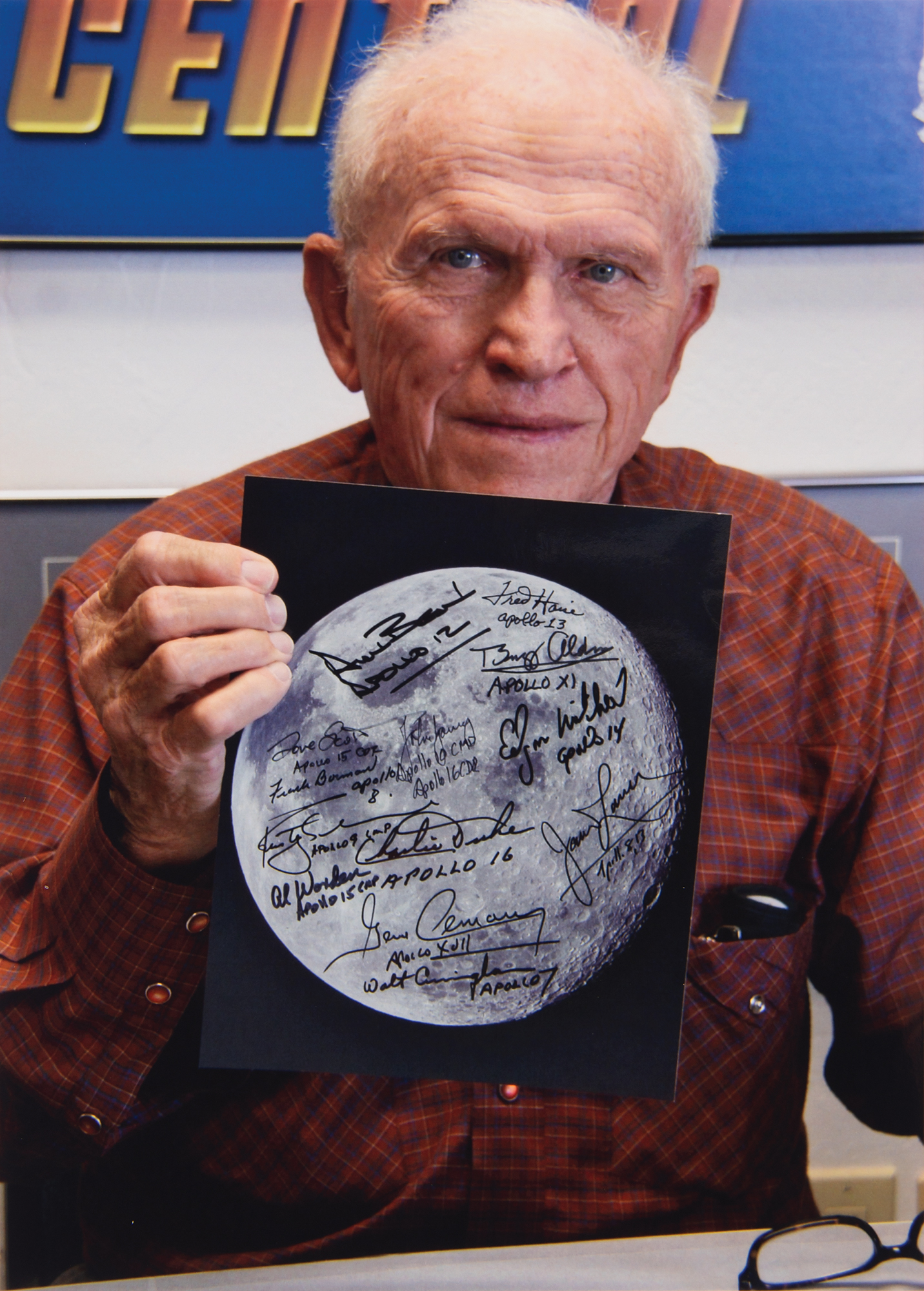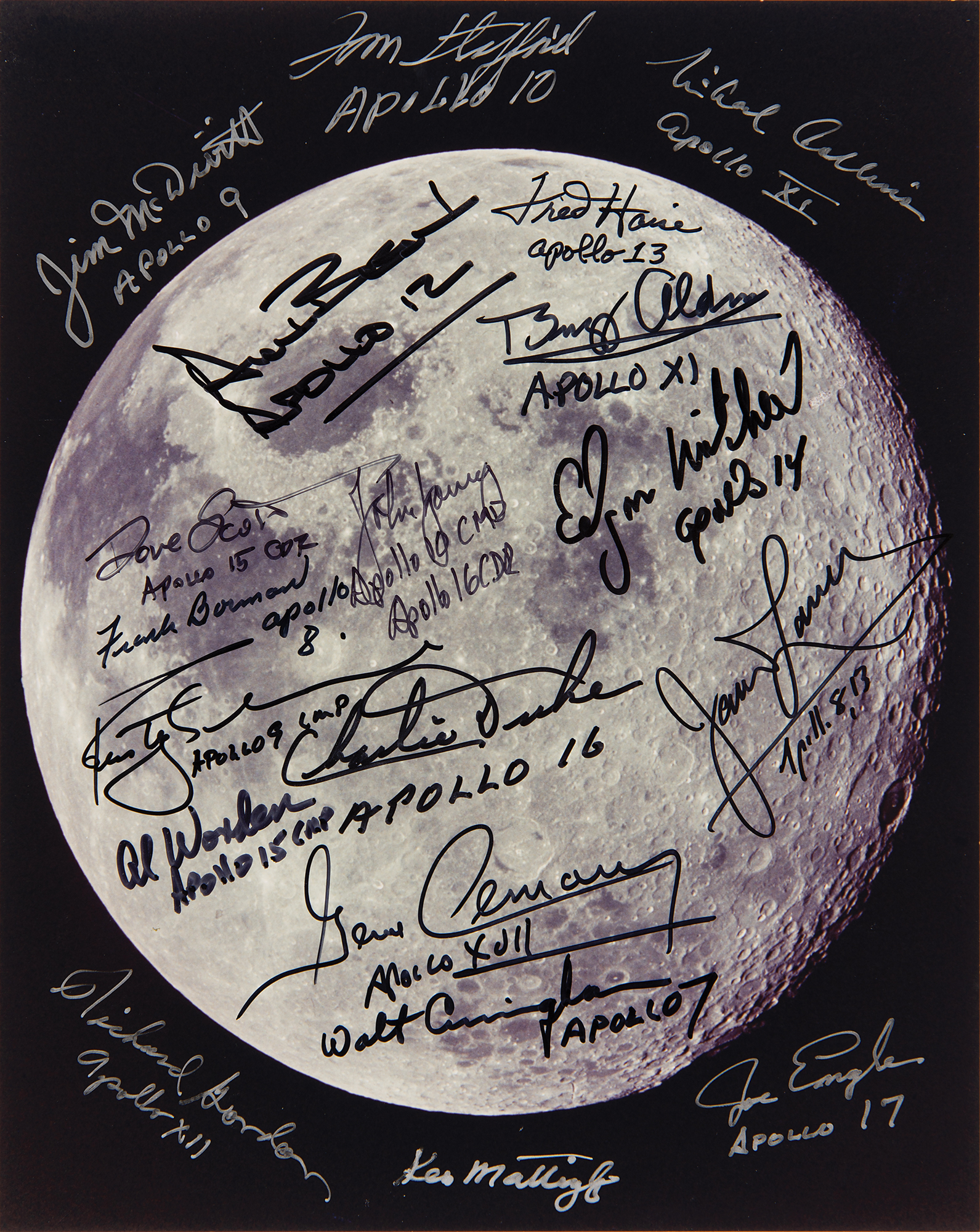Magnificent color semi-glossy 8 x 10 photo of the moon, signed in silver ink and black felt tip by 18 of NASA’s storied Apollo astronauts, a group that includes seven moonwalkers: “Buzz Aldrin, Apollo XI,” “Alan Bean, Apollo 12,” “Gene Cernan, Apollo XVII,” “Charlie Duke, Apollo 16,” “Edgar Mitchell, Apollo 14,” “Dave Scott, Apollo 15 CDR,” and “John Young, Apollo 10 CMP, Apollo 16 CDR.” The other astronauts include: “Frank Borman, Apollo 8,” “Michael Collins, Apollo XI,” “Walt Cunningham, Apollo 7,” “Richard Gordon, Apollo XII,” “Fred Haise, Apollo 13,” “James Lovell, Apollo 8, 13,” “Ken Mattingly,” “Jim McDivitt, Apollo 9,” “Rusty Schweickart, Apollo 9 LMP,” “Tom Stafford, Apollo 10,” and “Al Worden, Apollo 15 CMP.” The photo is also signed by X-15 pilot and Space Shuttle astronaut Joe Engle, who adds “Apollo 17,” a reference to his near assignment as the mission’s Lunar Module Pilot. In very fine condition.