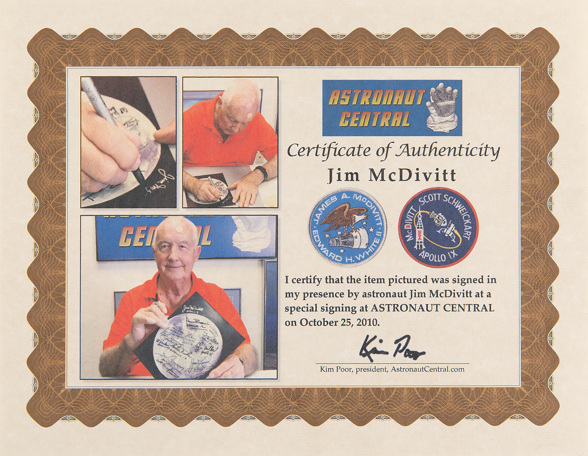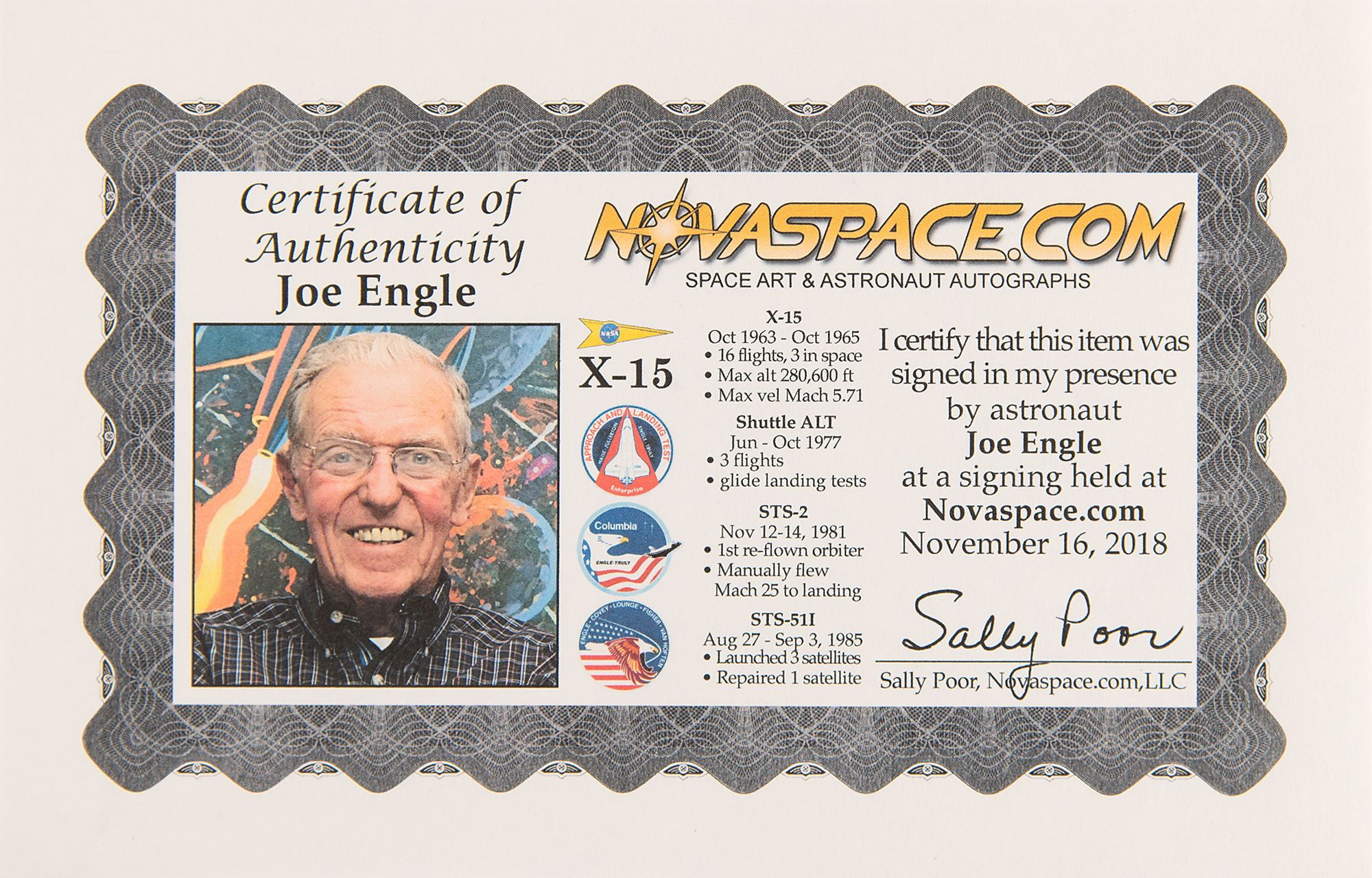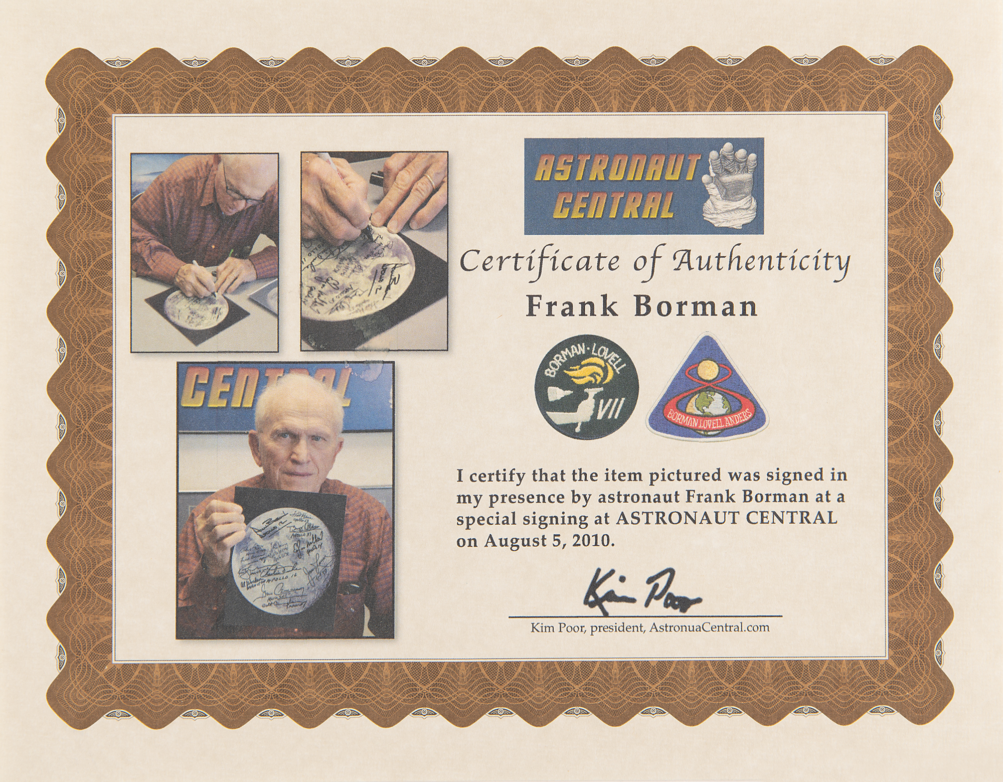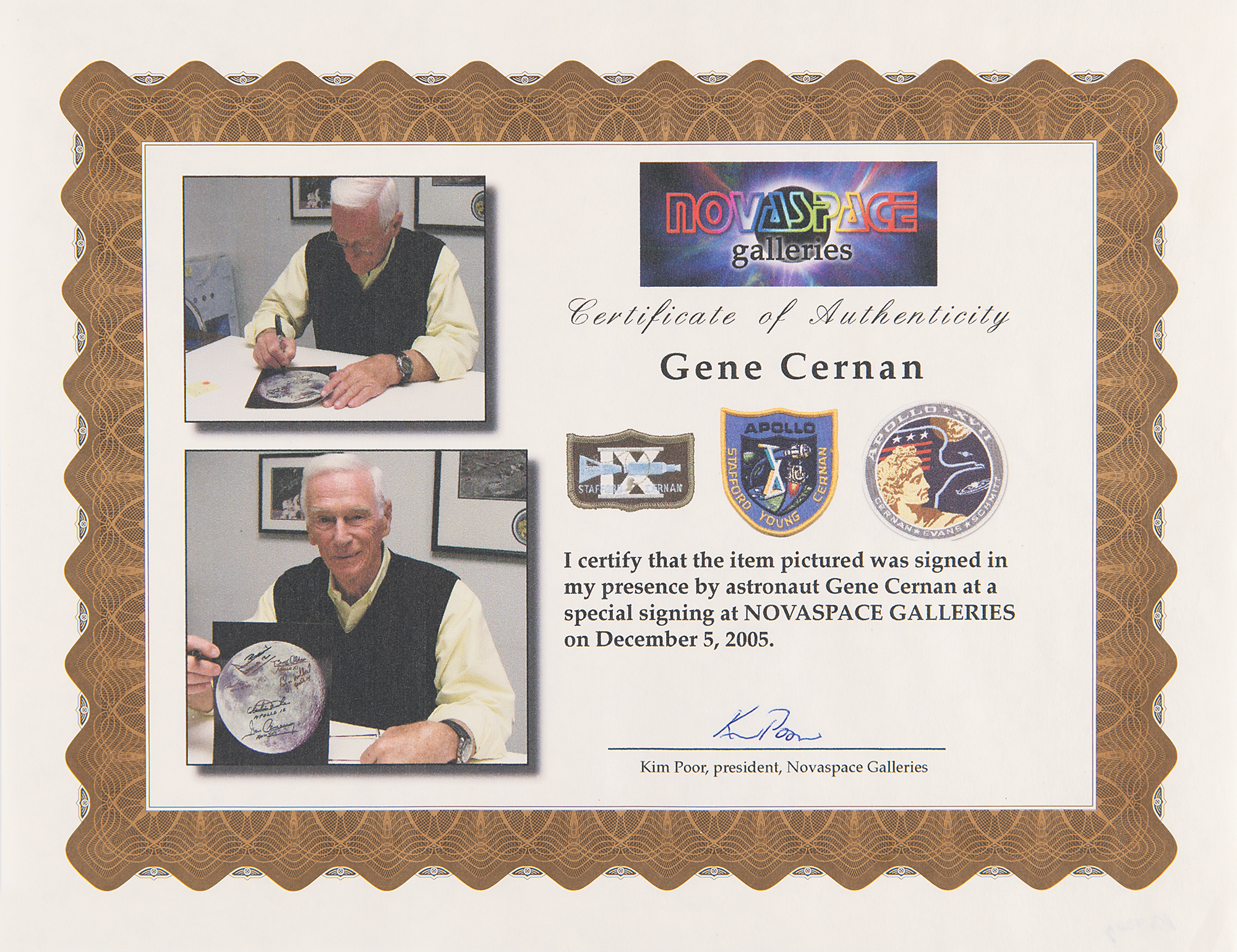 Accompanied by a full letter of authenticity from Zarelli Space Authentication, certificates of authenticity from Astronaut Central for Collins, Young, Borman, and McDivitt, certificates of authenticity from Novaspace for Cernan and Engle, and several photos of astronauts taken at the time of their respective signing.