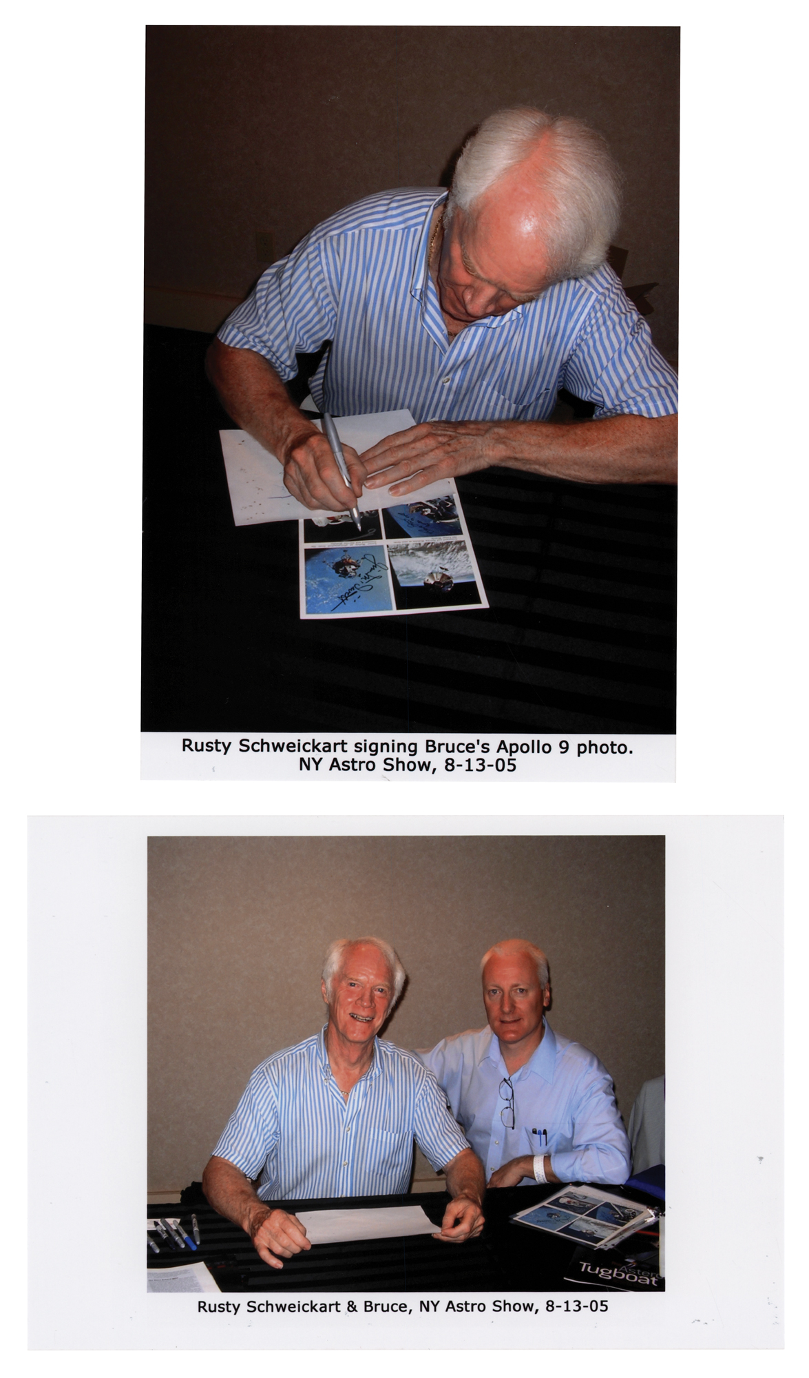 Official color 8 x 10 NASA lithograph featuring four images from the Apollo 9 Earth-Orbital mission, signed in black felt tip, “Dave Scott, Apollo 9 CMP” and “Jim McDivitt,” and in silver ink, “Rusty Schweickart, A-9.” The images show the CSM and LM floating high above Earth and Scott and Schweickart performing their historic EVAs. In very fine condition. Accompanied by two photos taken at the time of the Schweickart signing.